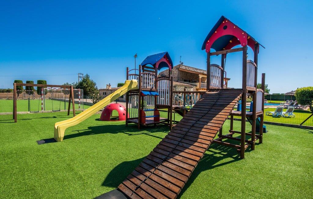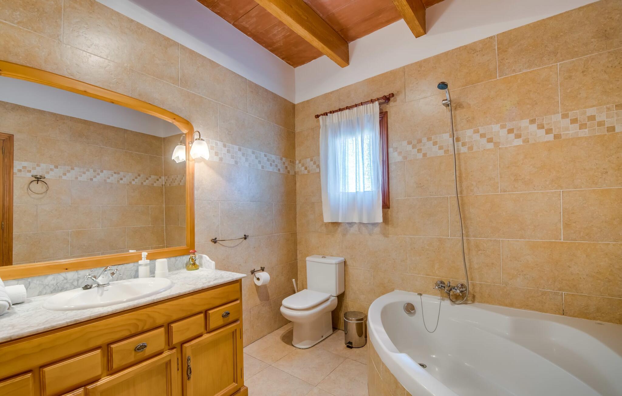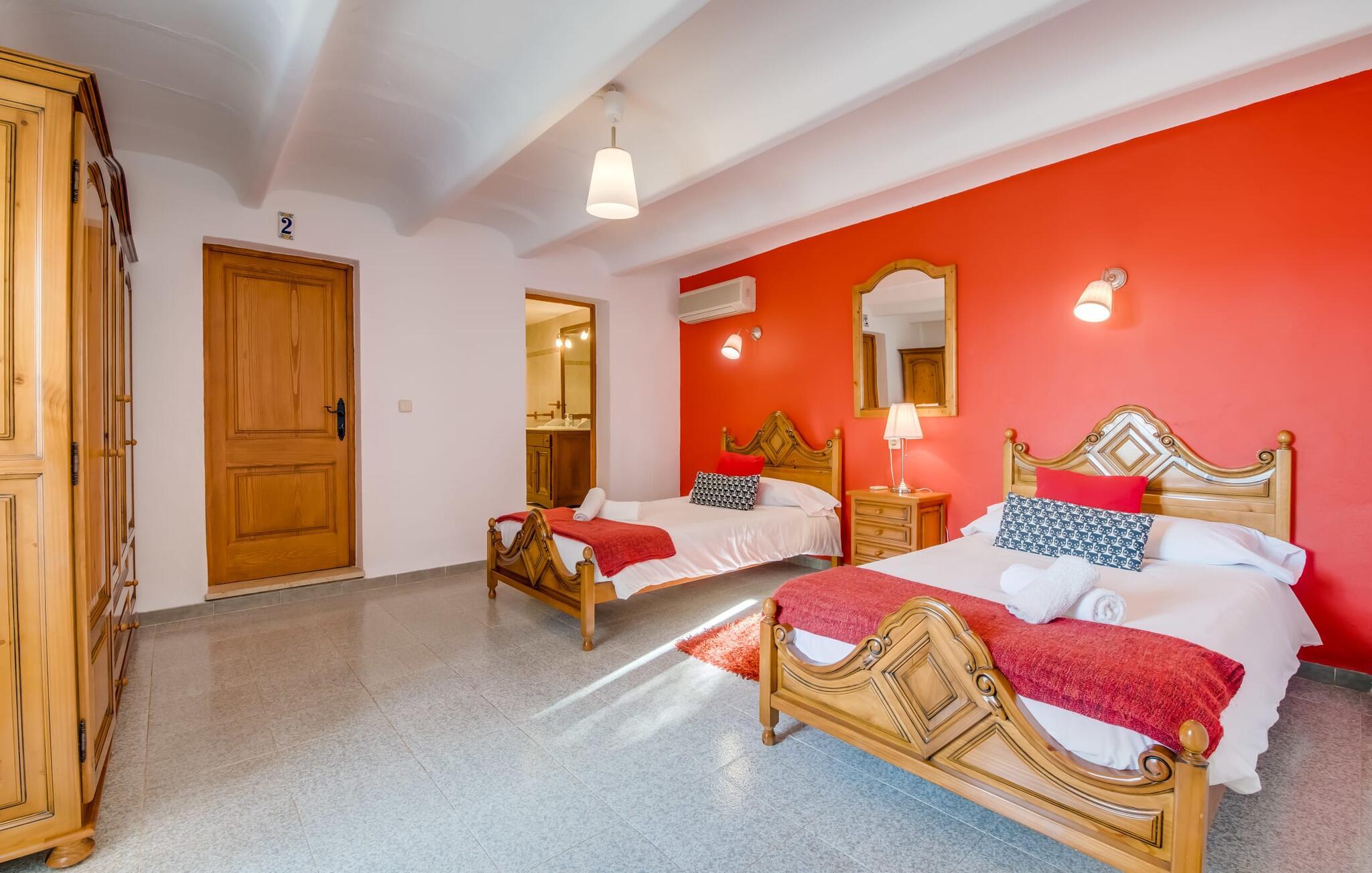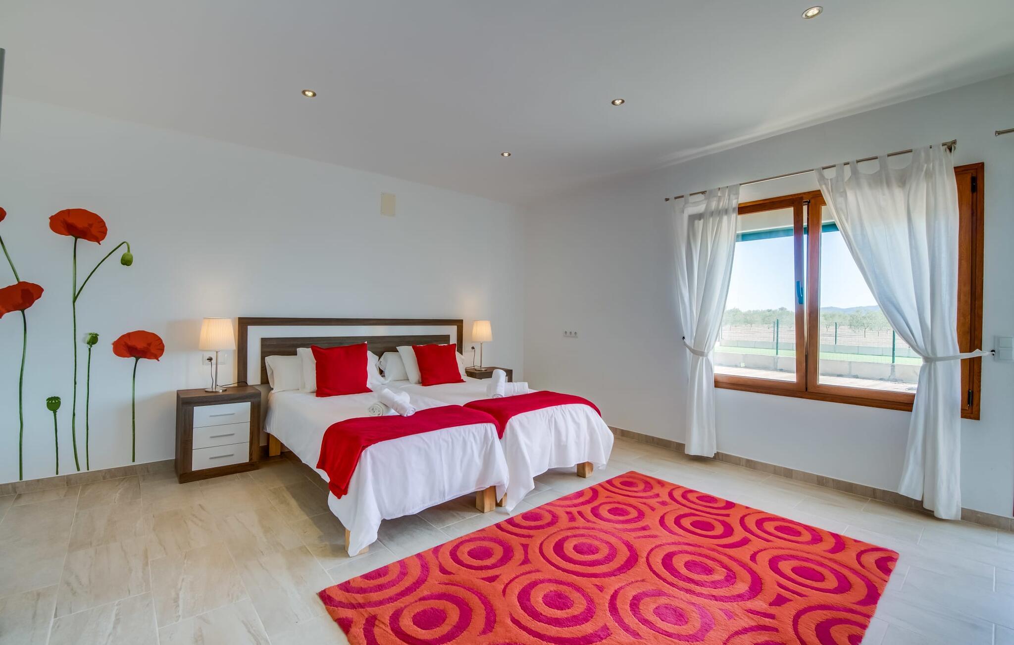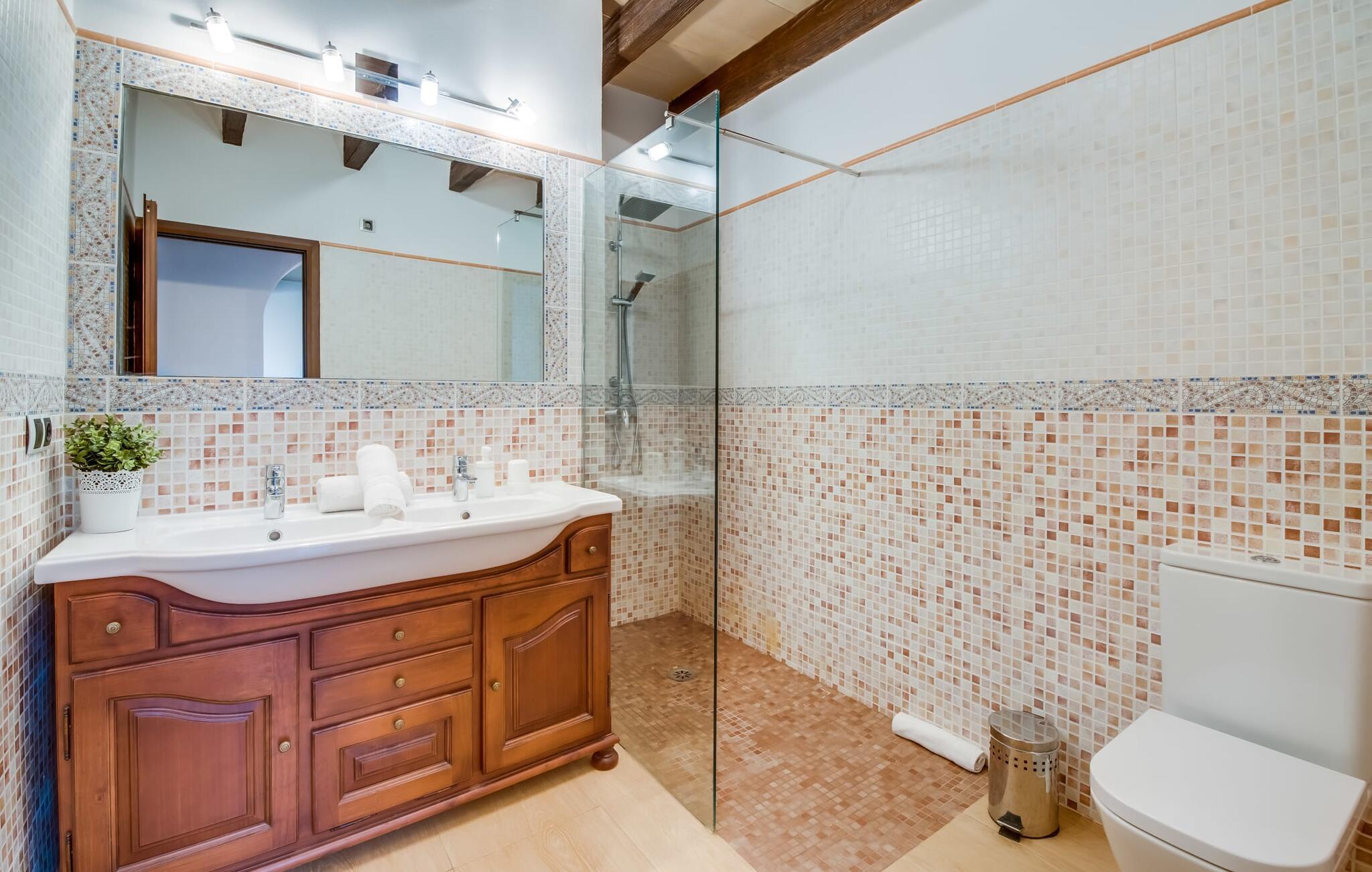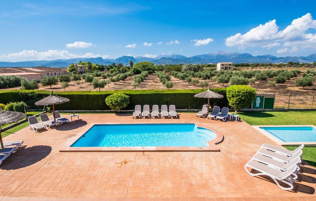 Når du kommer inn i villaen, som ikke bare har vakre, men også svært originale natursteinsfasader, finner du den nedre stuen med en ekstremt stor og komfortabel sofa og et rustikt spisebord for seks personer. TV-en og peisen er praktisk installert i dette rommet. Det klassisk designede kjøkkenet er lett å rengjøre og fullt utstyrt, inkludert vannkoker og kaffemaskin. I andre etasje finner man en lignende planløsning (inkludert et kjøkken til), med praktisk og attraktiv design og god plass til å føle seg hjemme. I denne første etasjen er det også en peis, noe som gir en koselig atmosfære på kjølige kvelder. En stor stue/spisestue gir alle gjestene i huset mulighet til å spise sammen og nyte fritiden innendørs. Seks av de ni individuelt utformede soverommene, som for det meste har klimaanlegg (ett av dem er et gjennomgangsrom som fører til et annet soverom), har eget bad. Alle de 11 badene har en behagelig, lys design, moderne inventar og noen av dem har vakre, typiske mallorkinske border. En original og unik bonus er de to ekstra selvbetjente oppholdsrommene som ble bygget i 2017 i nabobygningene. Det ene har plass til opptil seks personer, med tre soverom med dobbeltseng, to bad med dusj, kjøkken samt spisestue og stue. Det tredje rommet har fire soverom med dobbeltseng, to bad med dusj, kjøkken, spisestue og stue. Det første og det andre rommet er tilgjengelig for grupper på opptil 24 personer, mens grupper på 32 personer eller mer kan benytte hele eiendommen.