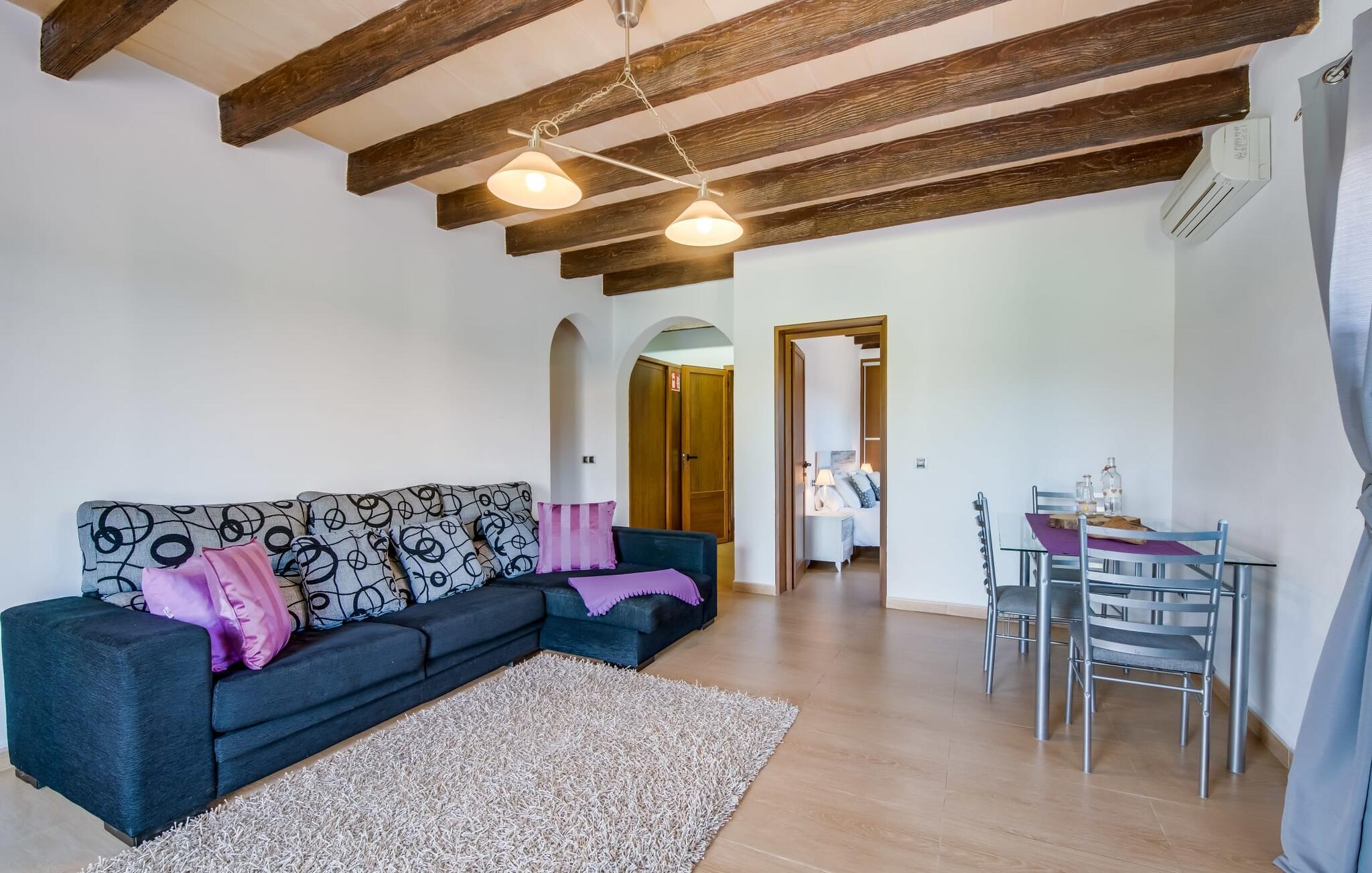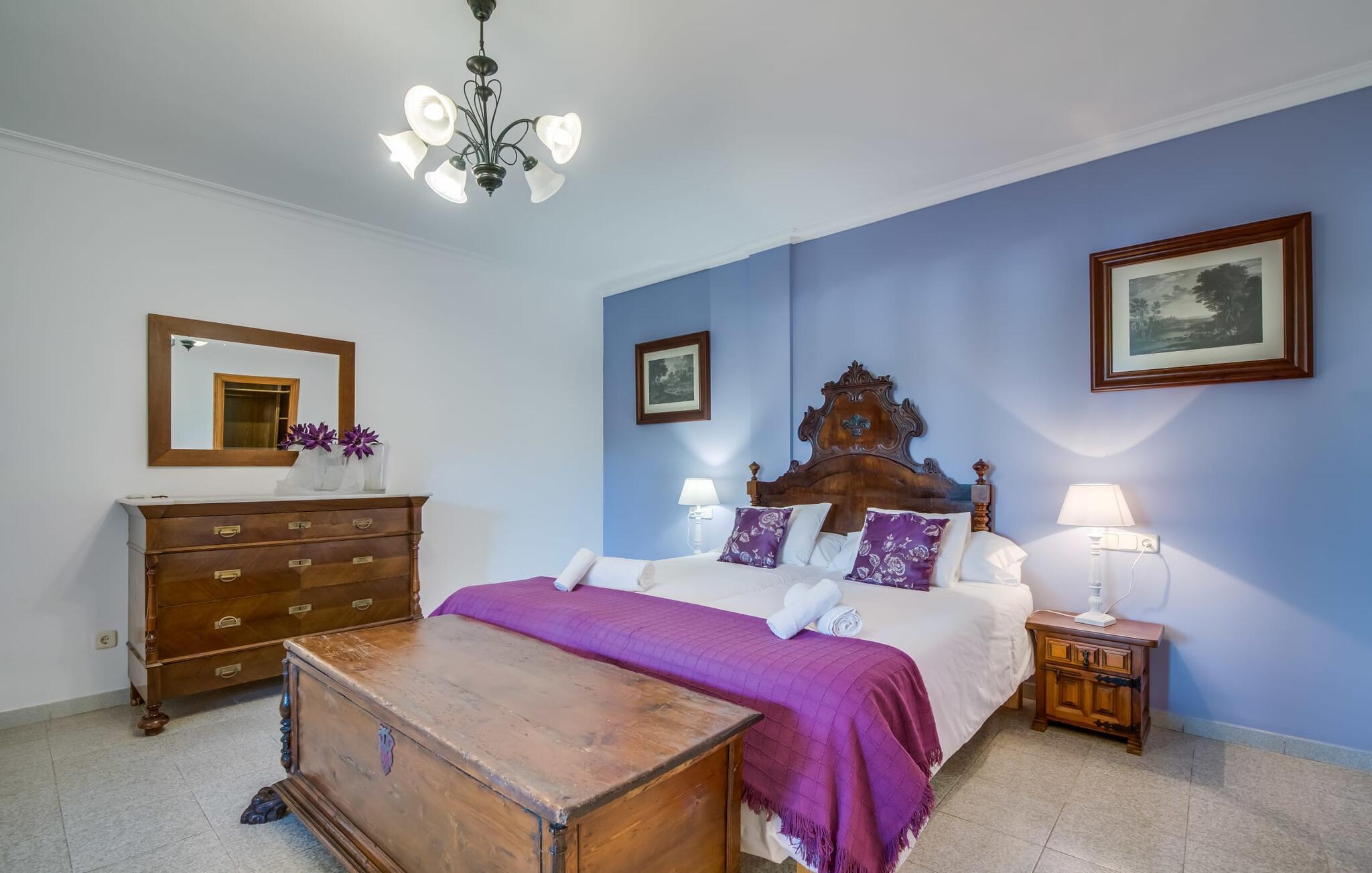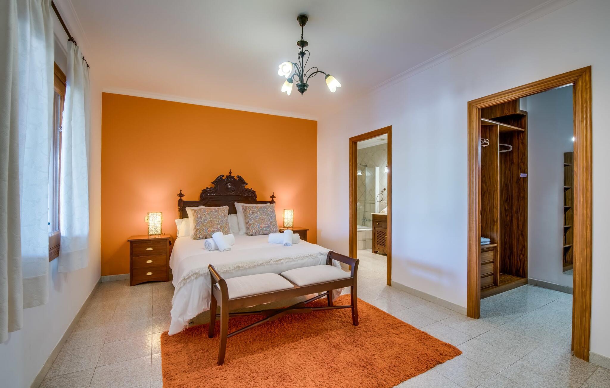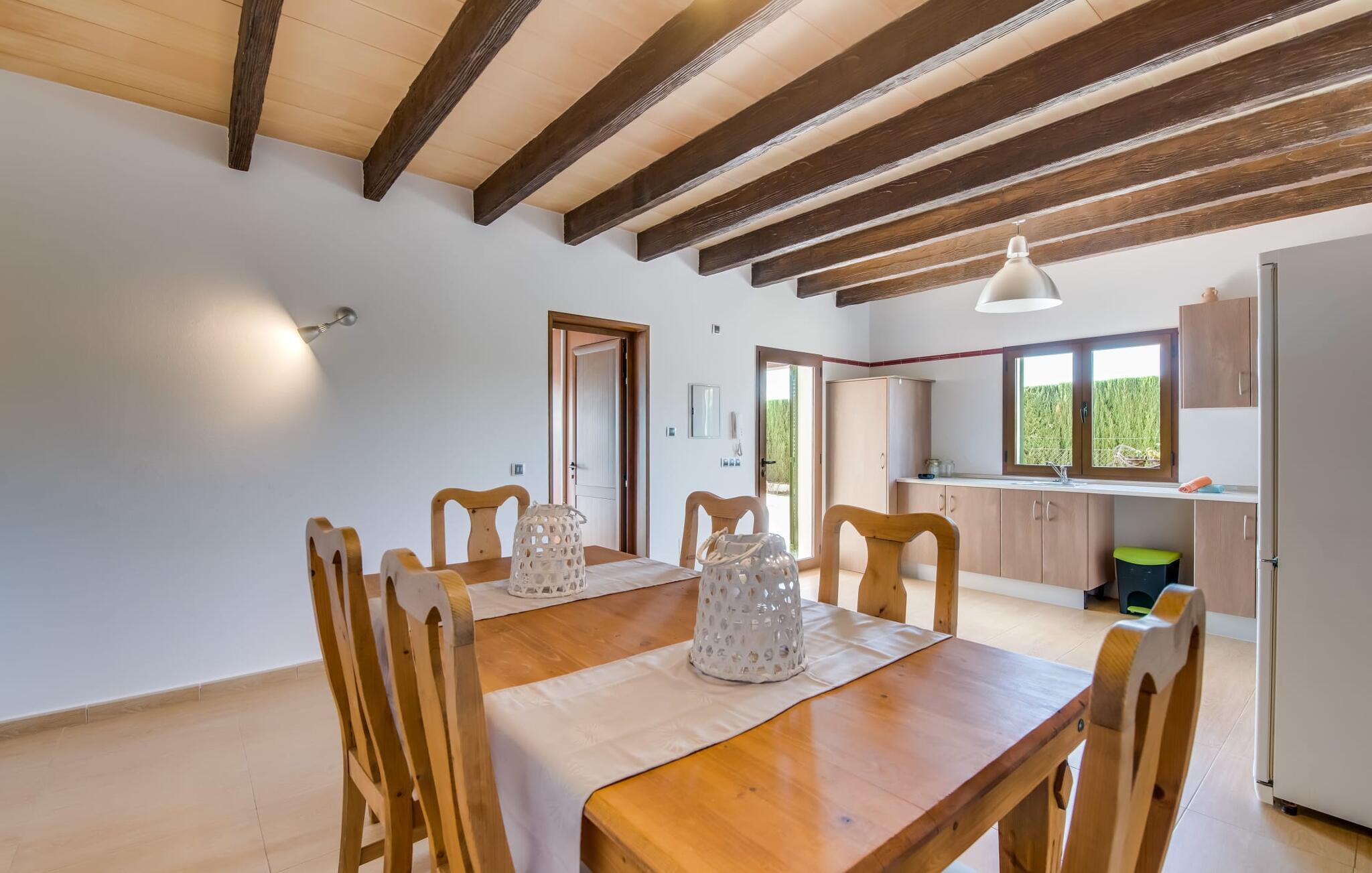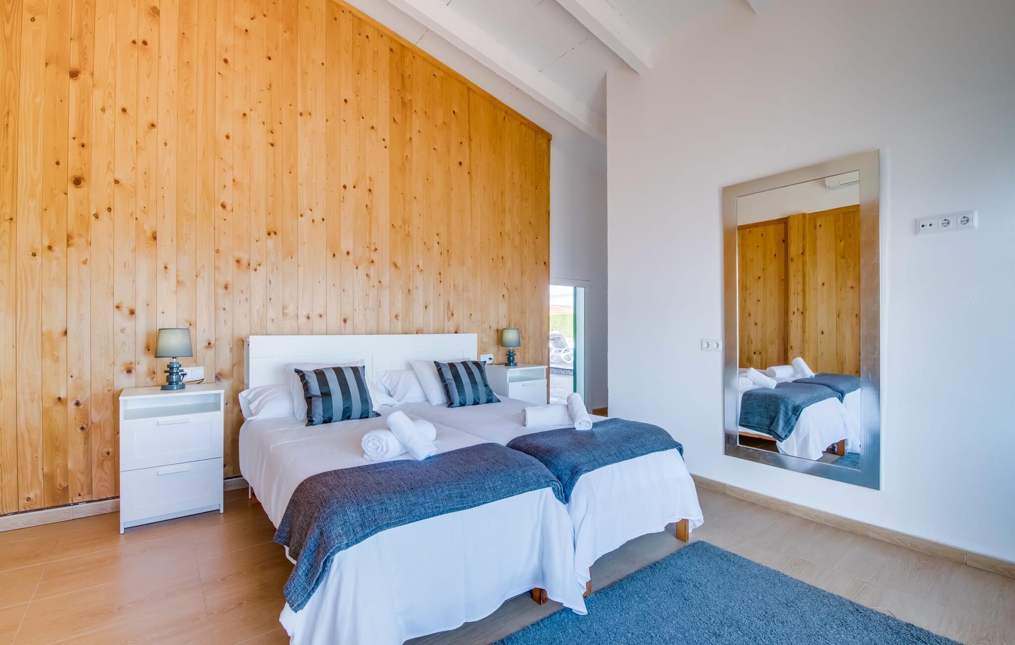 Når du kommer inn i villaen, som ikke bare har vakre, men også svært originale natursteinsfasader, finner du den nedre stuen med en ekstremt stor og komfortabel sofa og et rustikt spisebord for seks personer. TV-en og peisen er praktisk installert i dette rommet. Det klassisk designede kjøkkenet er lett å rengjøre og fullt utstyrt, inkludert vannkoker og kaffemaskin. I andre etasje finner man en lignende planløsning (inkludert et kjøkken til), med praktisk og attraktiv design og god plass til å føle seg hjemme. I denne første etasjen er det også en peis, noe som gir en koselig atmosfære på kjølige kvelder. En stor stue/spisestue gir alle gjestene i huset mulighet til å spise sammen og nyte fritiden innendørs. Seks av de ni individuelt utformede soverommene, som for det meste har klimaanlegg (ett av dem er et gjennomgangsrom som fører til et annet soverom), har eget bad. Alle de 11 badene har en behagelig, lys design, moderne inventar og noen av dem har vakre, typiske mallorkinske border. En original og unik bonus er de to ekstra selvbetjente oppholdsrommene som ble bygget i 2017 i nabobygningene. Det ene har plass til opptil seks personer, med tre soverom med dobbeltseng, to bad med dusj, kjøkken samt spisestue og stue. Det tredje rommet har fire soverom med dobbeltseng, to bad med dusj, kjøkken, spisestue og stue. Det første og det andre rommet er tilgjengelig for grupper på opptil 24 personer, mens grupper på 32 personer eller mer kan benytte hele eiendommen.