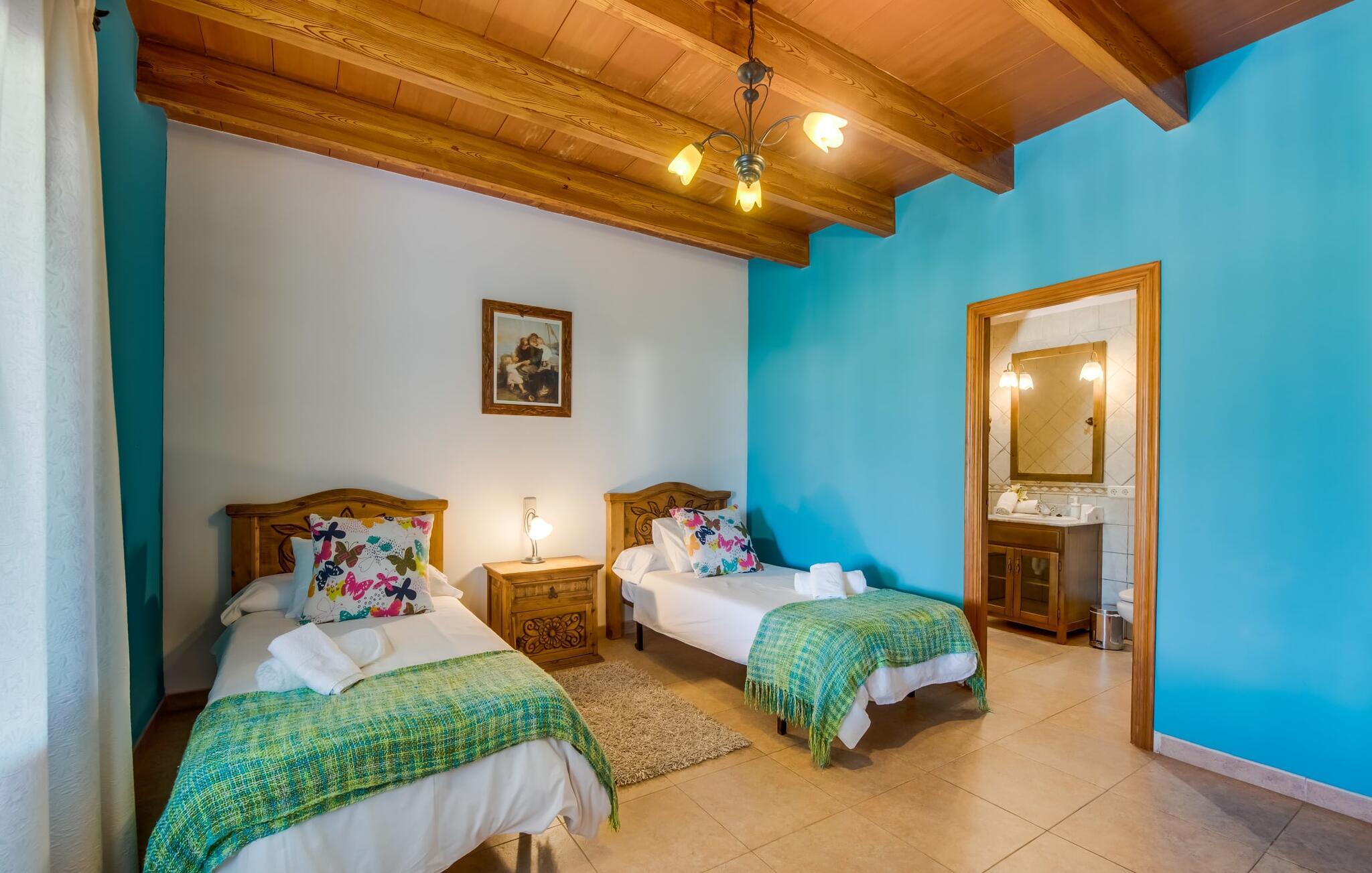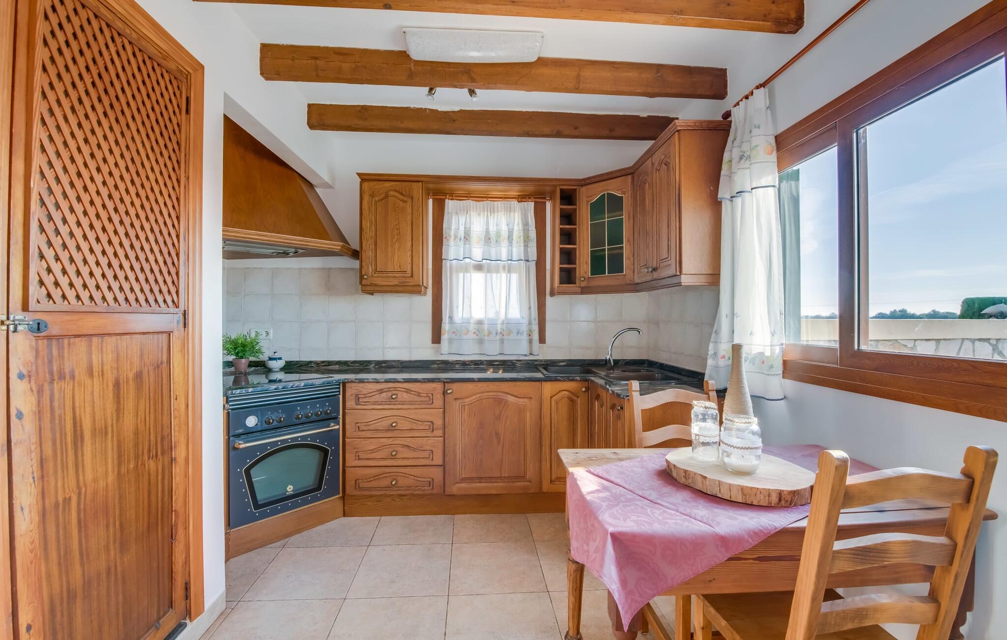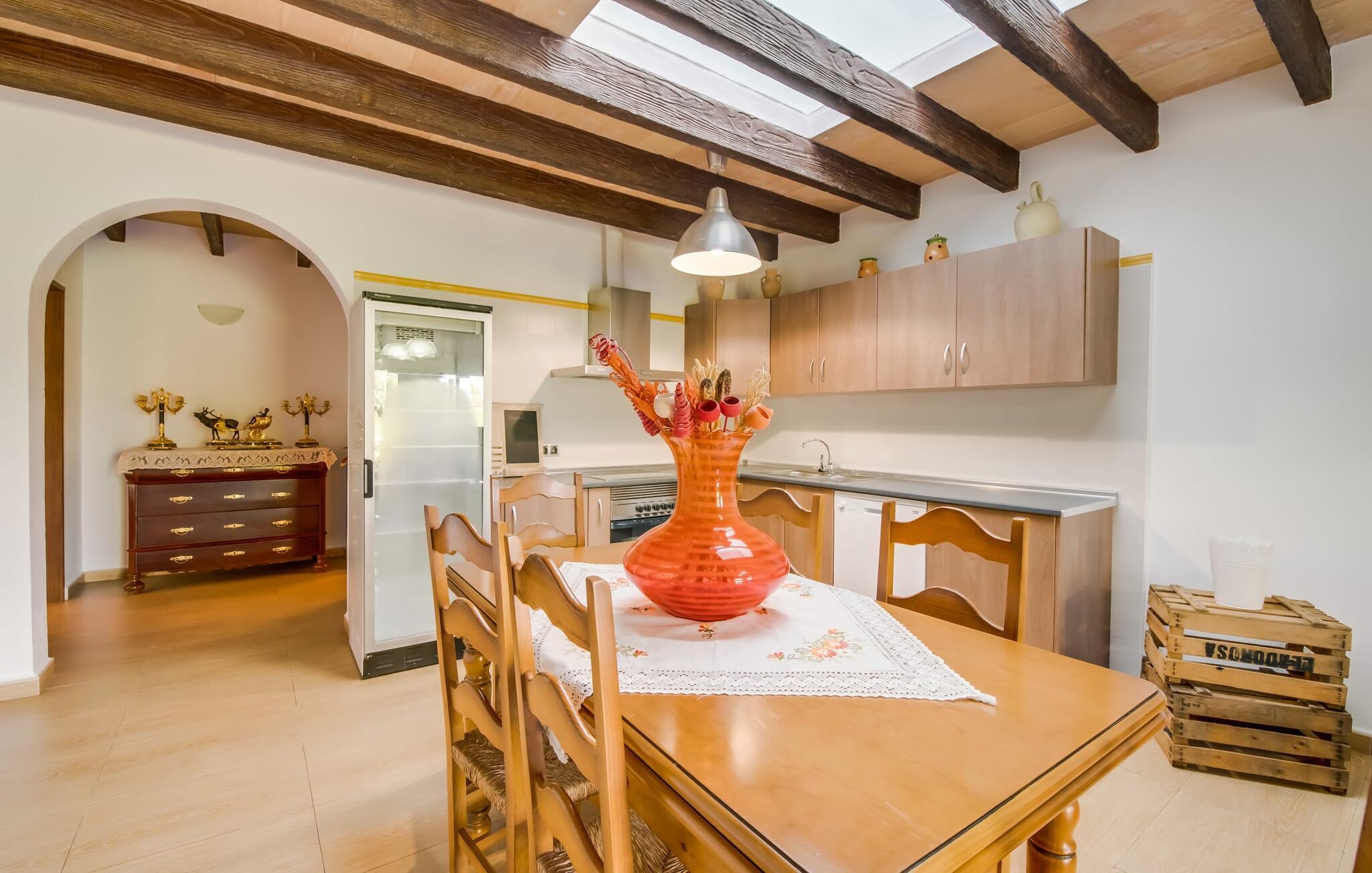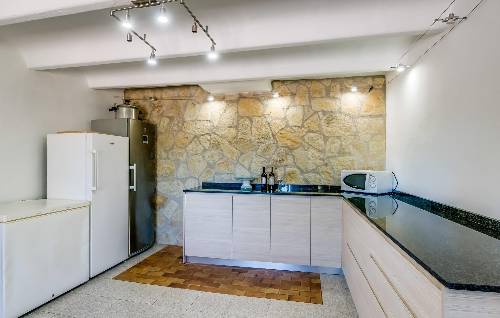Når du kommer inn i villaen, som ikke bare har vakre, men også svært originale natursteinsfasader, finner du den nedre stuen med en ekstremt stor og komfortabel sofa og et rustikt spisebord for seks personer. TV-en og peisen er praktisk installert i dette rommet. Det klassisk designede kjøkkenet er lett å rengjøre og fullt utstyrt, inkludert vannkoker og kaffemaskin. I andre etasje finner man en lignende planløsning (inkludert et kjøkken til), med praktisk og attraktiv design og god plass til å føle seg hjemme. I denne første etasjen er det også en peis, noe som gir en koselig atmosfære på kjølige kvelder. En stor stue/spisestue gir alle gjestene i huset mulighet til å spise sammen og nyte fritiden innendørs. Seks av de ni individuelt utformede soverommene, som for det meste har klimaanlegg (ett av dem er et gjennomgangsrom som fører til et annet soverom), har eget bad. Alle de 11 badene har en behagelig, lys design, moderne inventar og noen av dem har vakre, typiske mallorkinske border. En original og unik bonus er de to ekstra selvbetjente oppholdsrommene som ble bygget i 2017 i nabobygningene. Det ene har plass til opptil seks personer, med tre soverom med dobbeltseng, to bad med dusj, kjøkken samt spisestue og stue. Det tredje rommet har fire soverom med dobbeltseng, to bad med dusj, kjøkken, spisestue og stue. Det første og det andre rommet er tilgjengelig for grupper på opptil 24 personer, mens grupper på 32 personer eller mer kan benytte hele eiendommen.