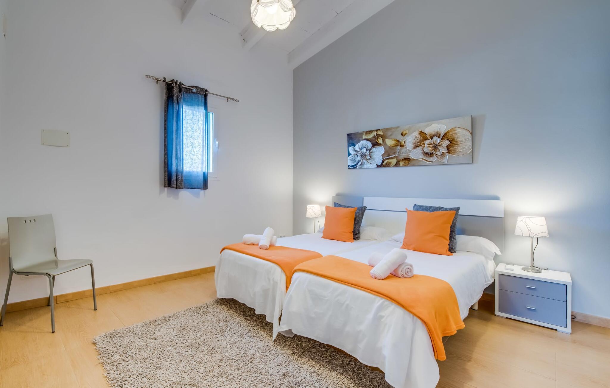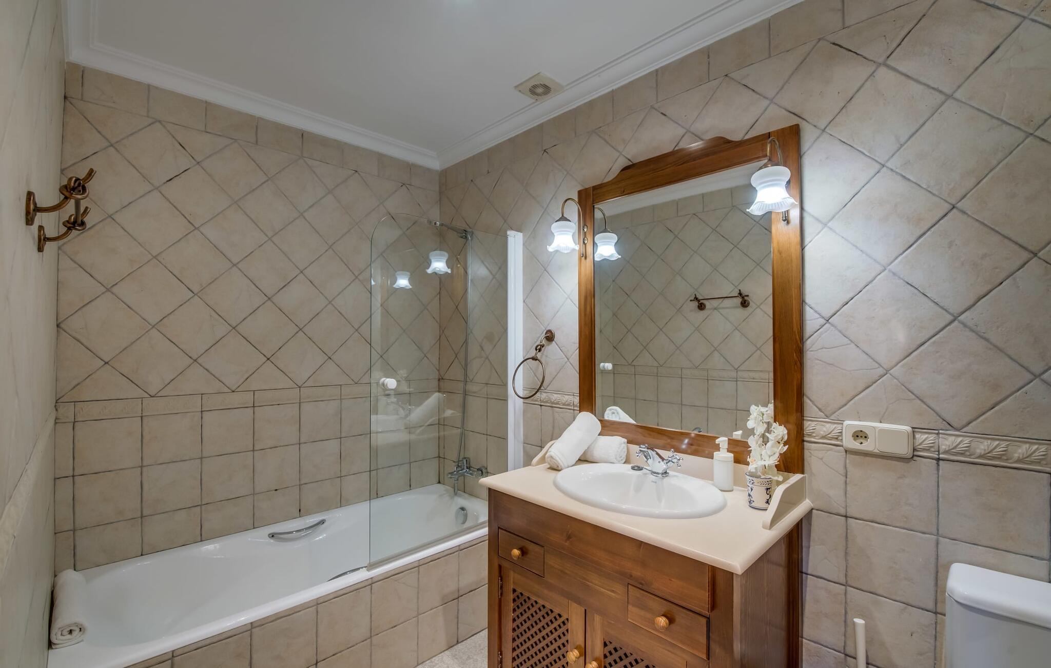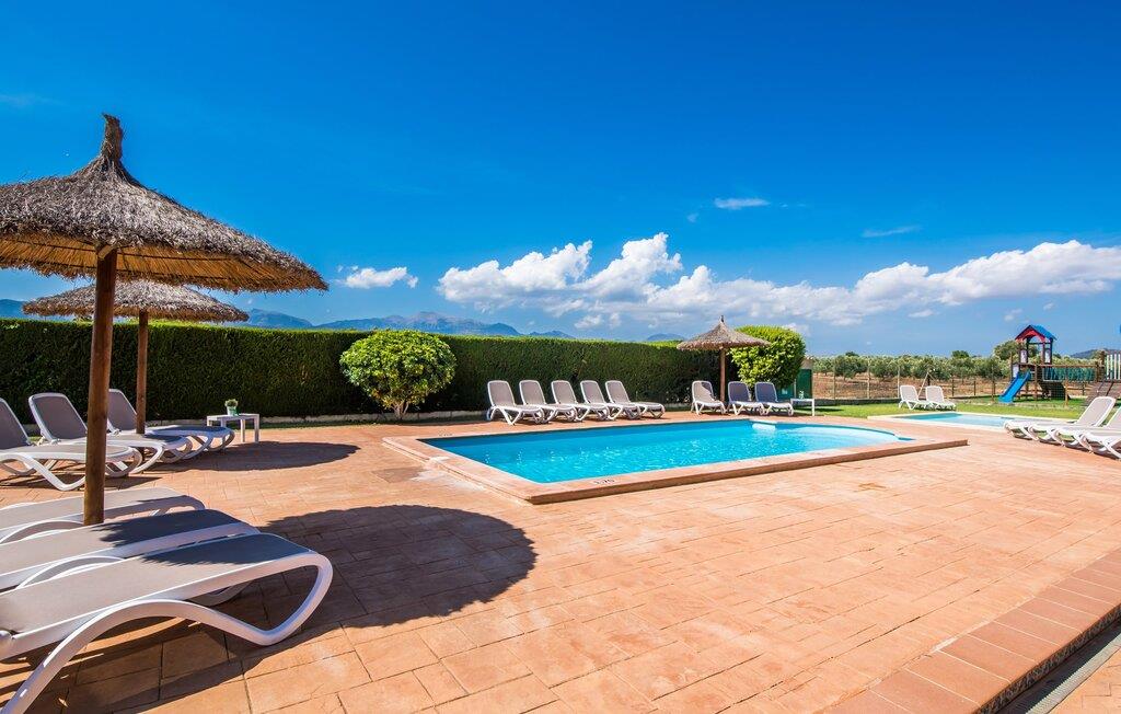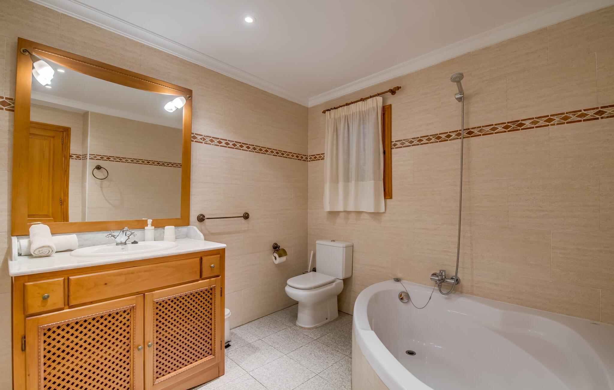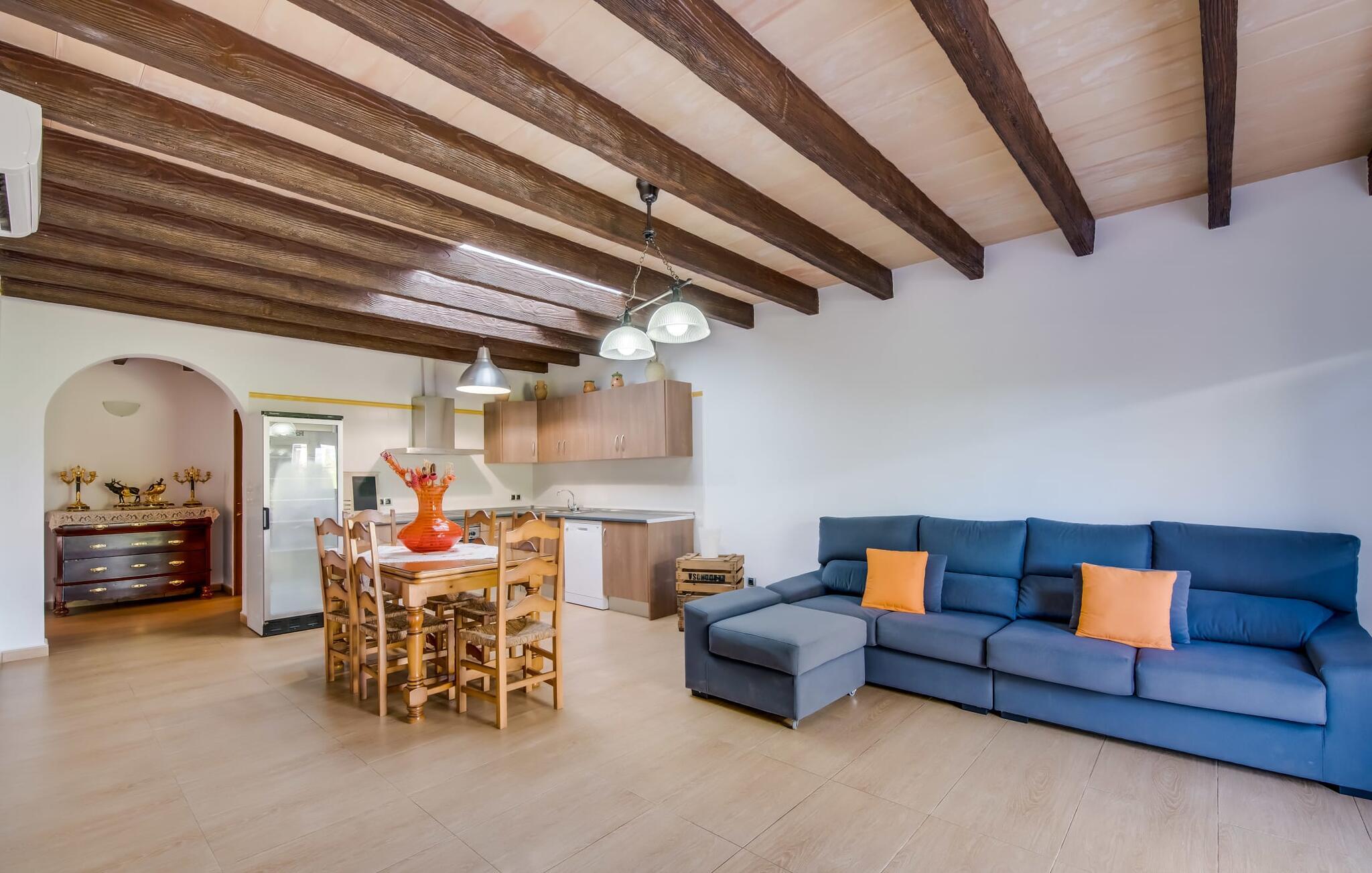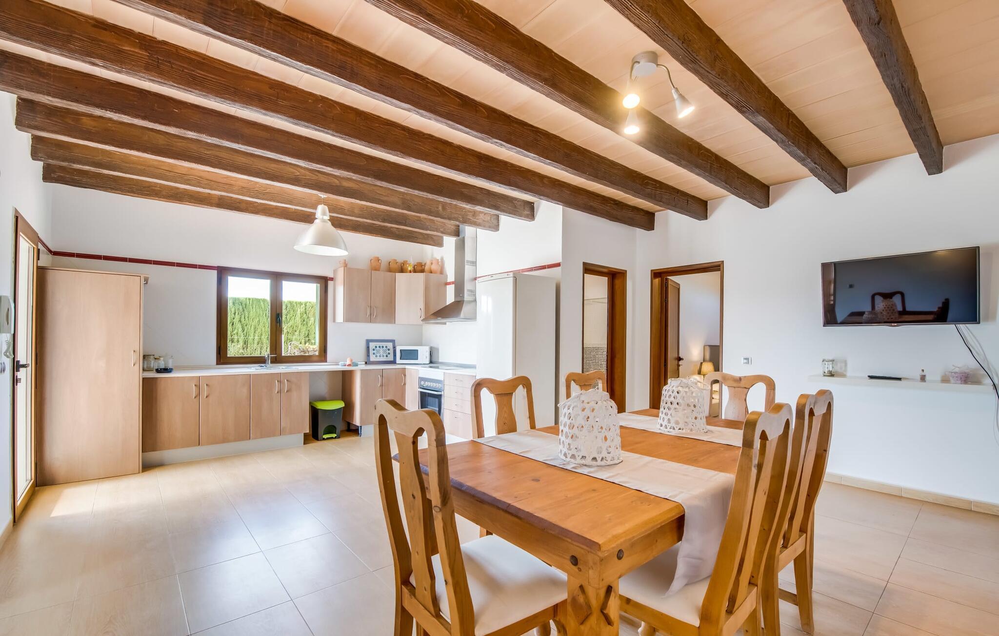 Når du kommer inn i villaen, som ikke bare har vakre, men også svært originale natursteinsfasader, finner du den nedre stuen med en ekstremt stor og komfortabel sofa og et rustikt spisebord for seks personer. TV-en og peisen er praktisk installert i dette rommet. Det klassisk designede kjøkkenet er lett å rengjøre og fullt utstyrt, inkludert vannkoker og kaffemaskin. I andre etasje finner man en lignende planløsning (inkludert et kjøkken til), med praktisk og attraktiv design og god plass til å føle seg hjemme. I denne første etasjen er det også en peis, noe som gir en koselig atmosfære på kjølige kvelder. En stor stue/spisestue gir alle gjestene i huset mulighet til å spise sammen og nyte fritiden innendørs. Seks av de ni individuelt utformede soverommene, som for det meste har klimaanlegg (ett av dem er et gjennomgangsrom som fører til et annet soverom), har eget bad. Alle de 11 badene har en behagelig, lys design, moderne inventar og noen av dem har vakre, typiske mallorkinske border. En original og unik bonus er de to ekstra selvbetjente oppholdsrommene som ble bygget i 2017 i nabobygningene. Det ene har plass til opptil seks personer, med tre soverom med dobbeltseng, to bad med dusj, kjøkken samt spisestue og stue. Det tredje rommet har fire soverom med dobbeltseng, to bad med dusj, kjøkken, spisestue og stue. Det første og det andre rommet er tilgjengelig for grupper på opptil 24 personer, mens grupper på 32 personer eller mer kan benytte hele eiendommen.