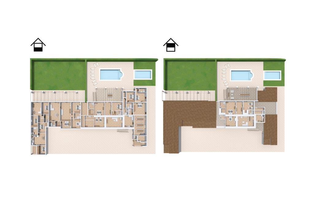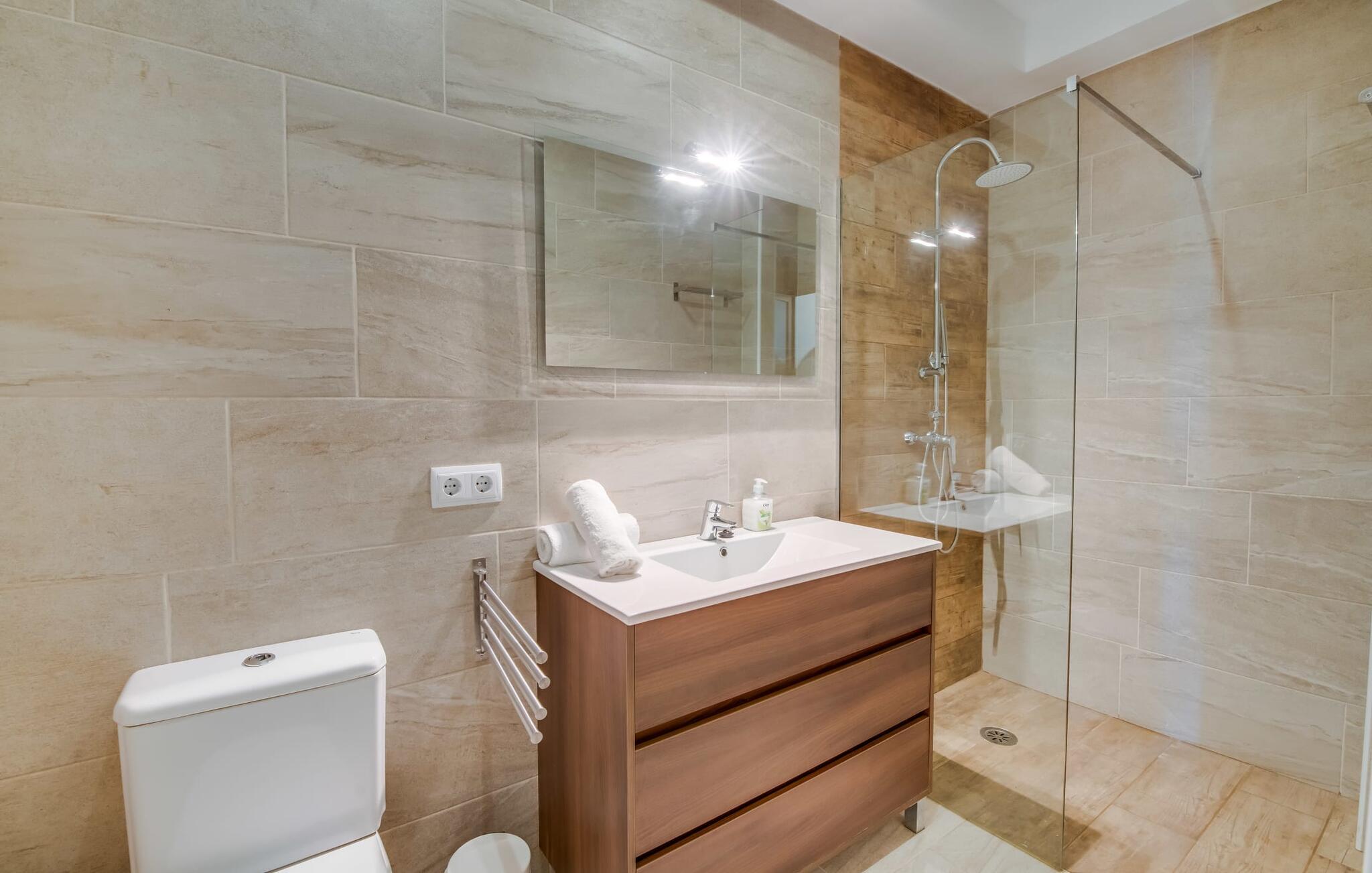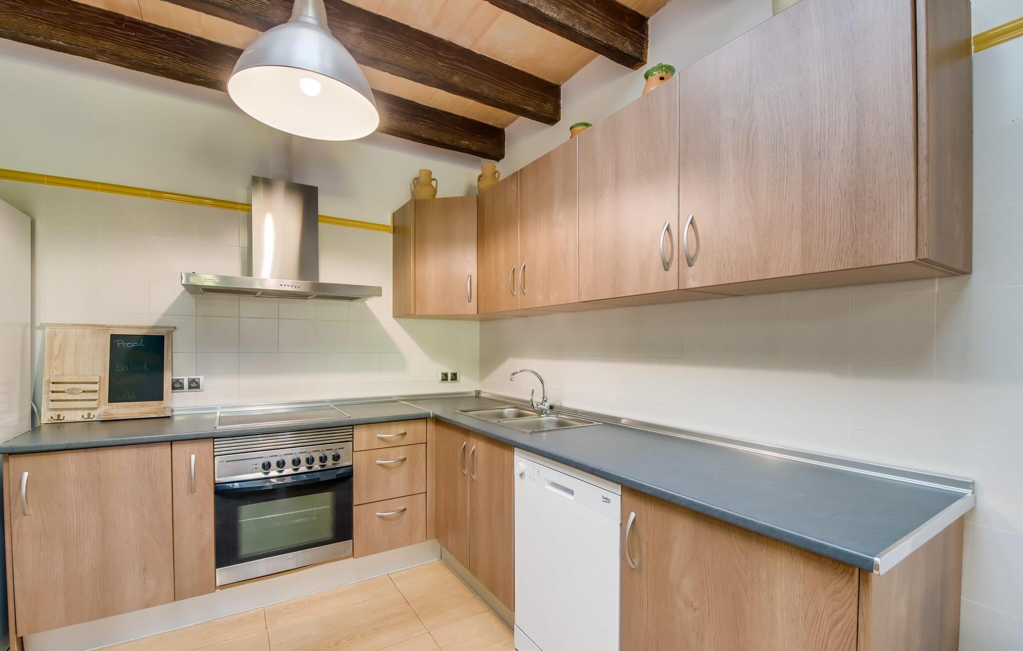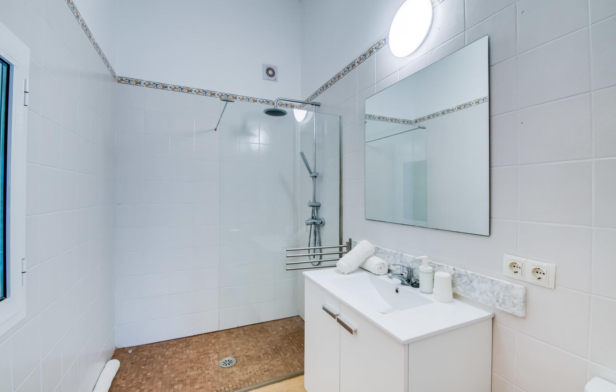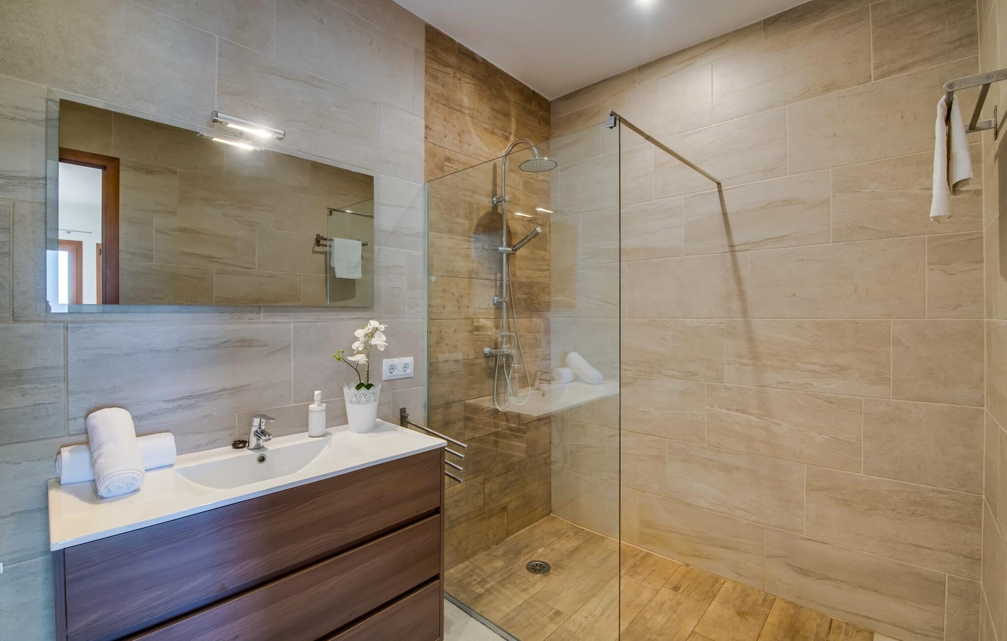Når du kommer inn i villaen, som ikke bare har vakre, men også svært originale natursteinsfasader, finner du den nedre stuen med en ekstremt stor og komfortabel sofa og et rustikt spisebord for seks personer. TV-en og peisen er praktisk installert i dette rommet. Det klassisk designede kjøkkenet er lett å rengjøre og fullt utstyrt, inkludert vannkoker og kaffemaskin. I andre etasje finner man en lignende planløsning (inkludert et kjøkken til), med praktisk og attraktiv design og god plass til å føle seg hjemme. I denne første etasjen er det også en peis, noe som gir en koselig atmosfære på kjølige kvelder. En stor stue/spisestue gir alle gjestene i huset mulighet til å spise sammen og nyte fritiden innendørs. Seks av de ni individuelt utformede soverommene, som for det meste har klimaanlegg (ett av dem er et gjennomgangsrom som fører til et annet soverom), har eget bad. Alle de 11 badene har en behagelig, lys design, moderne inventar og noen av dem har vakre, typiske mallorkinske border. En original og unik bonus er de to ekstra selvbetjente oppholdsrommene som ble bygget i 2017 i nabobygningene. Det ene har plass til opptil seks personer, med tre soverom med dobbeltseng, to bad med dusj, kjøkken samt spisestue og stue. Det tredje rommet har fire soverom med dobbeltseng, to bad med dusj, kjøkken, spisestue og stue. Det første og det andre rommet er tilgjengelig for grupper på opptil 24 personer, mens grupper på 32 personer eller mer kan benytte hele eiendommen.