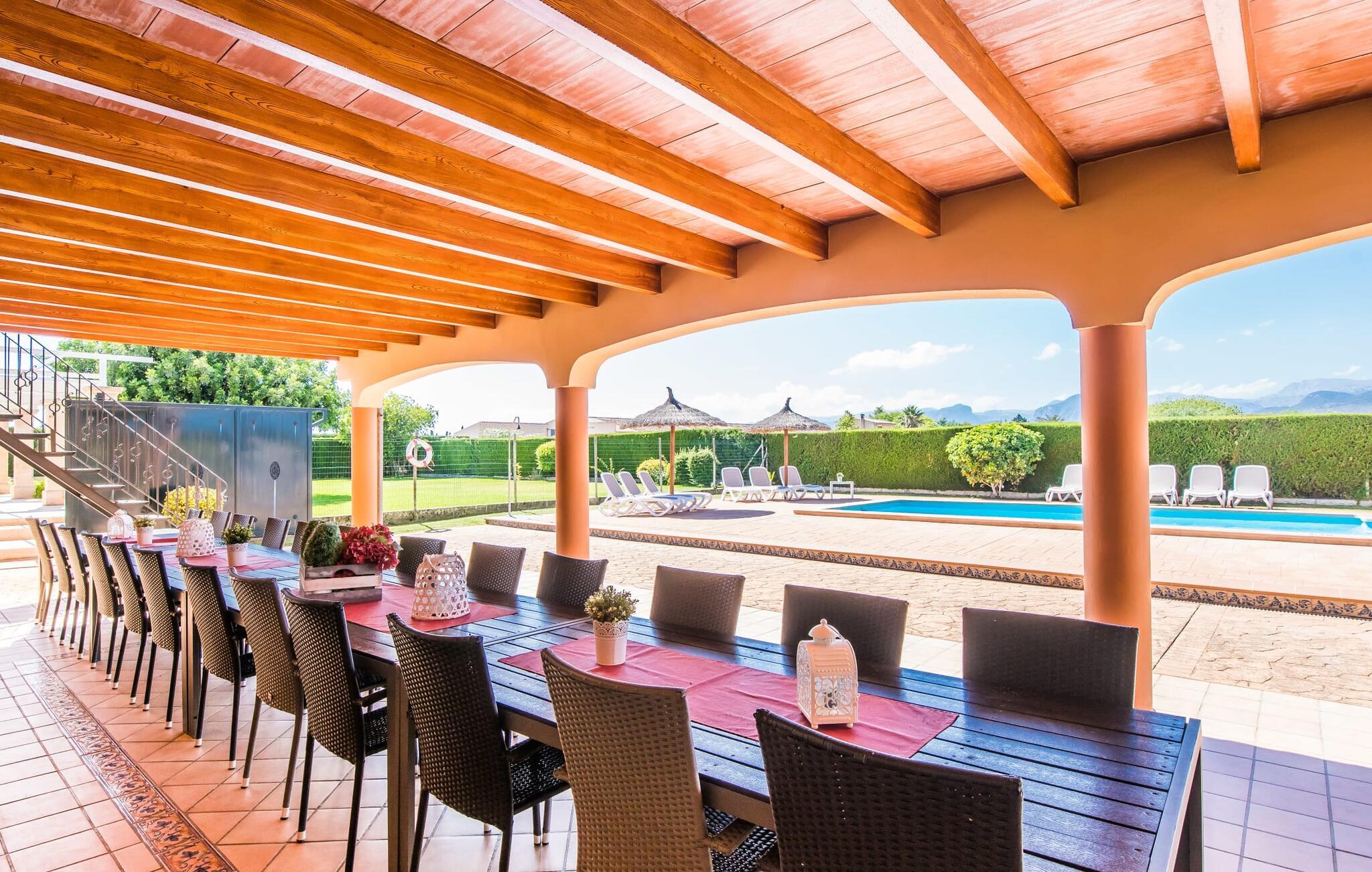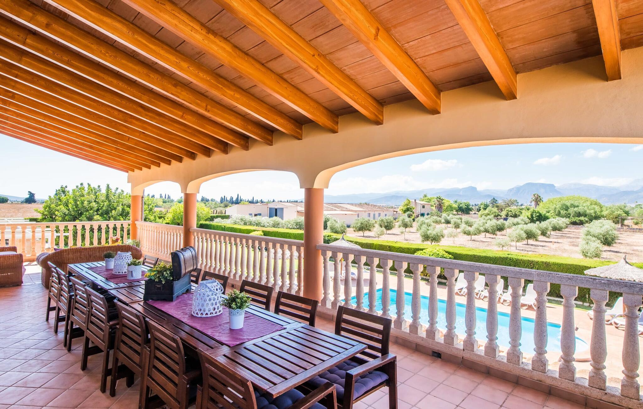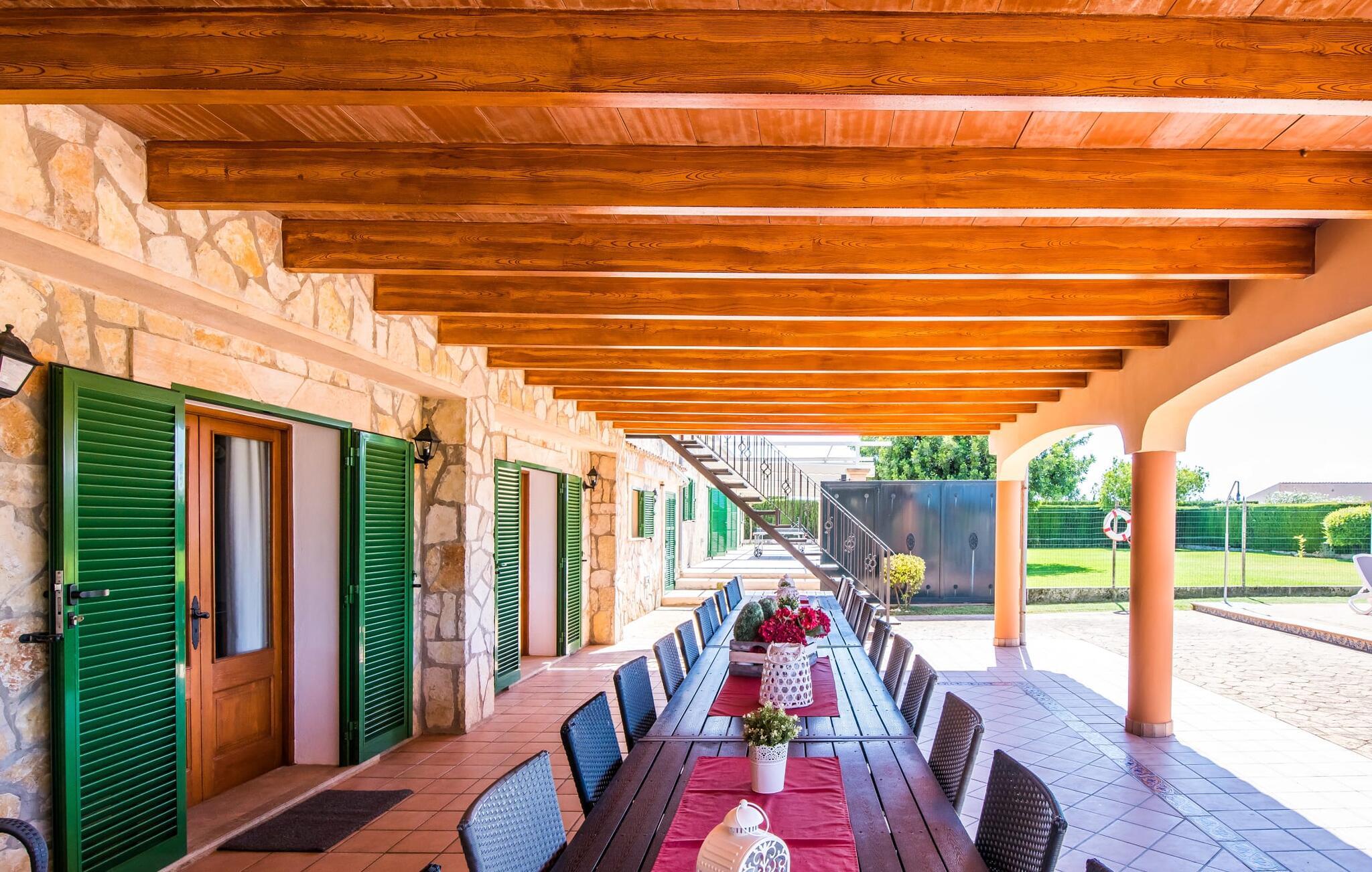 Med sine 600 kvadratmeter er Villa Can Grau en av de største og mest imponerende boligene i vårt sortiment. På grunn av sin størrelse og planløsning med 16 doble soverom og 15 bad, er villaen ideell for en stor familie eller store reisefølger. Eiendommens utforming gjør at alle som reiser med deg alltid kan nyte sin egen private plass til det fulle. Hvis du bestiller for 24 personer (eller færre), får du en rabattert pris. Villa Can Grau er omgitt av romslige terrasser, en balkong og en gårdsplass, slik at du kan nyte den mallorcinske solen når som helst på dagen og på mange forskjellige favorittsteder. I sentrum av uteområdet ligger det vakre bassenget med enkel trinnadkomst og tilstøtende herlig solterrasse. Rett ved siden av ligger et ekstra barnebasseng for små vannrotter. I denne delen av eiendommen skaper en kant av tette planter en følelse av fullstendig privatliv og tilbaketrukkethet. Her kan du slappe av på de komfortable solsengene og nyte utsikten over den dypblå himmelen. Hvis solen blir for sterk, har du til sammen ti parasoller til rådighet. Hvis du vil friske deg opp enda mer, kan du bruke utedusjen. Ulike sittegrupper inviterer deg til å slappe av i den luftige skyggen på den overbygde terrassen. Hvis du går til den øvre balkongen, kan du nyte en fantastisk utsikt over det omkringliggende landskapet. Det er sitteplasser til minst ti personer rundt den store balkongen med utsikt over bassengområdet, som også er tilgjengelig via en utvendig trapp. Dette er et fantastisk sted å sitte sammen i hyggelig selskap og kanskje nyte et middelhavsmåltid eller feire slutten på en herlig feriedag i en festlig atmosfære. Hvis du har lyst til å organisere en kulinarisk grillfest, kan du bruke den innebygde grillen som er installert i nærheten av den nedre terrassen.