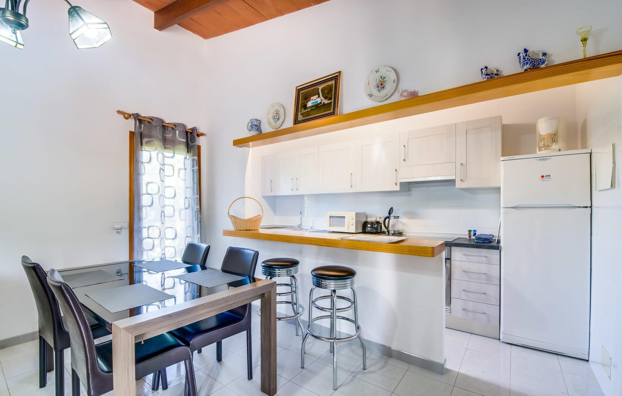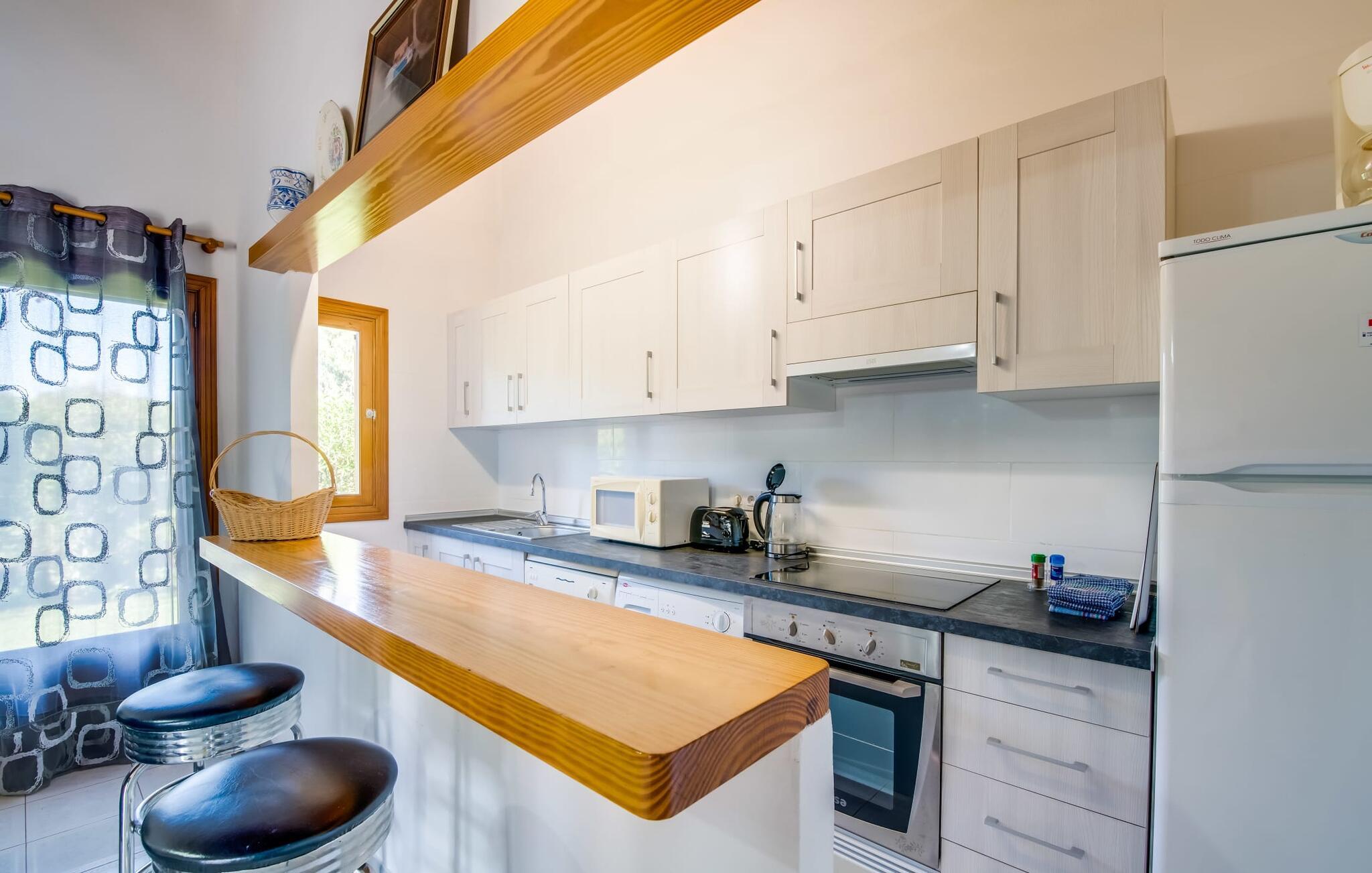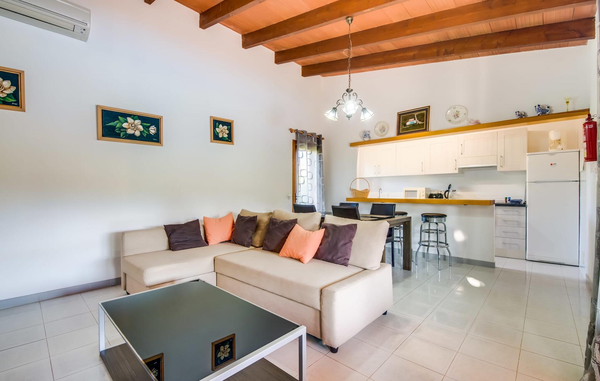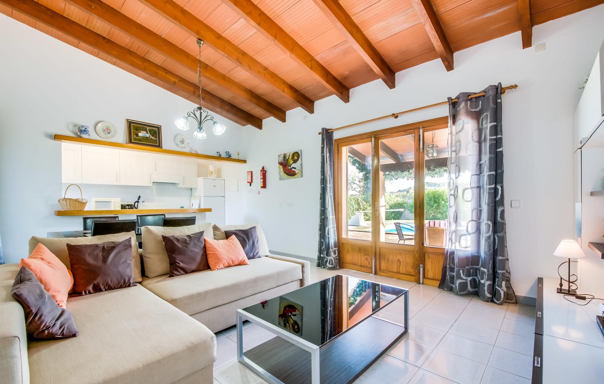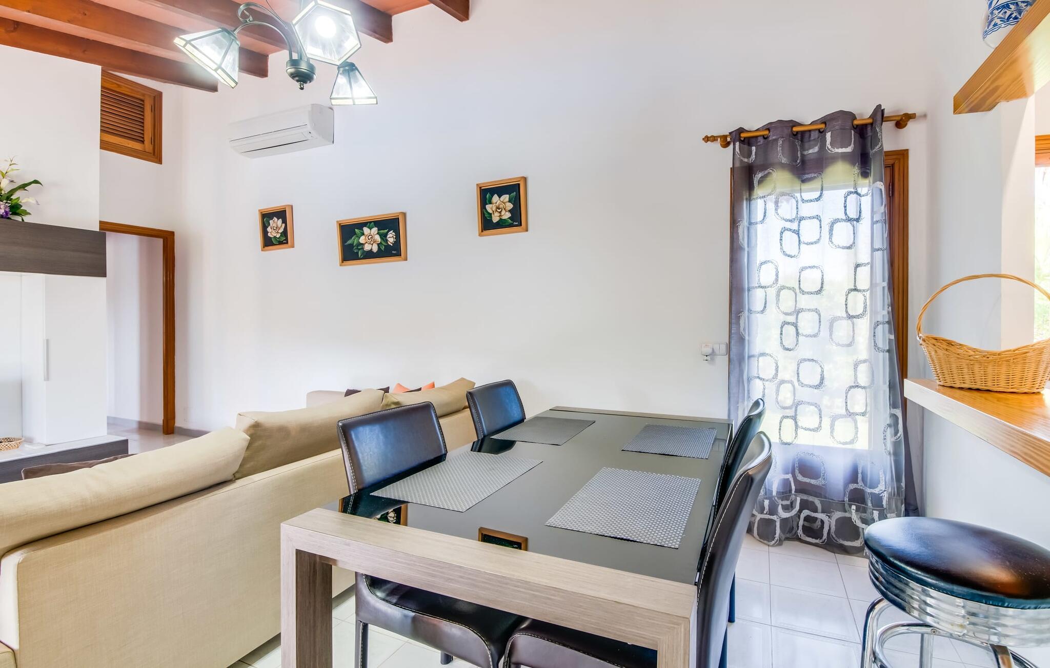 Du kan nyte måltidene på den overbygde terrassen foran huset eller i det vakre interiøret i den sjarmerende villaen. Her finner du midtpunktet i form av en åpen planløsning med stue, spisestue og kjøkken. Spisebordet er plassert mellom den koselige stuen og det åpne kjøkkenet. Sistnevnte er adskilt fra stuen med en amerikansk benk og er fullt utstyrt for praktisk selvhushold. De lyse gulvflisene og de hvite veggene med stor takhøyde får rommet til å virke mye større. Dette elegante landstedet kompletteres av varmen fra tretak, vinduer og dører. Denne attraktive atmosfæren bidrar til at du kan slappe av året rundt, ettersom det lille huset har både klimaanlegg og oppvarming. Spesielt i de roligere månedene av året er Can Jaume dEs Carritxo et spesielt attraktivt alternativ for en ferie på landet, langt unna folkemengdene.