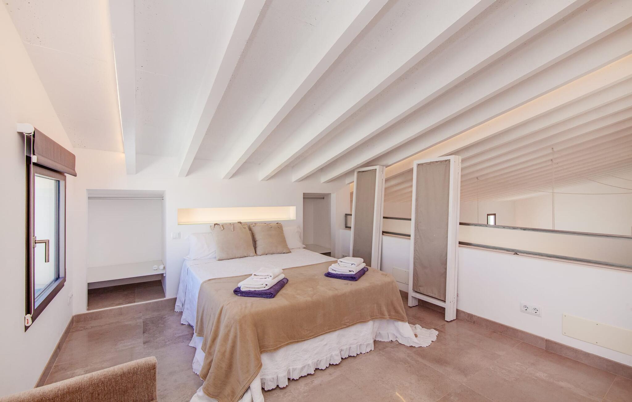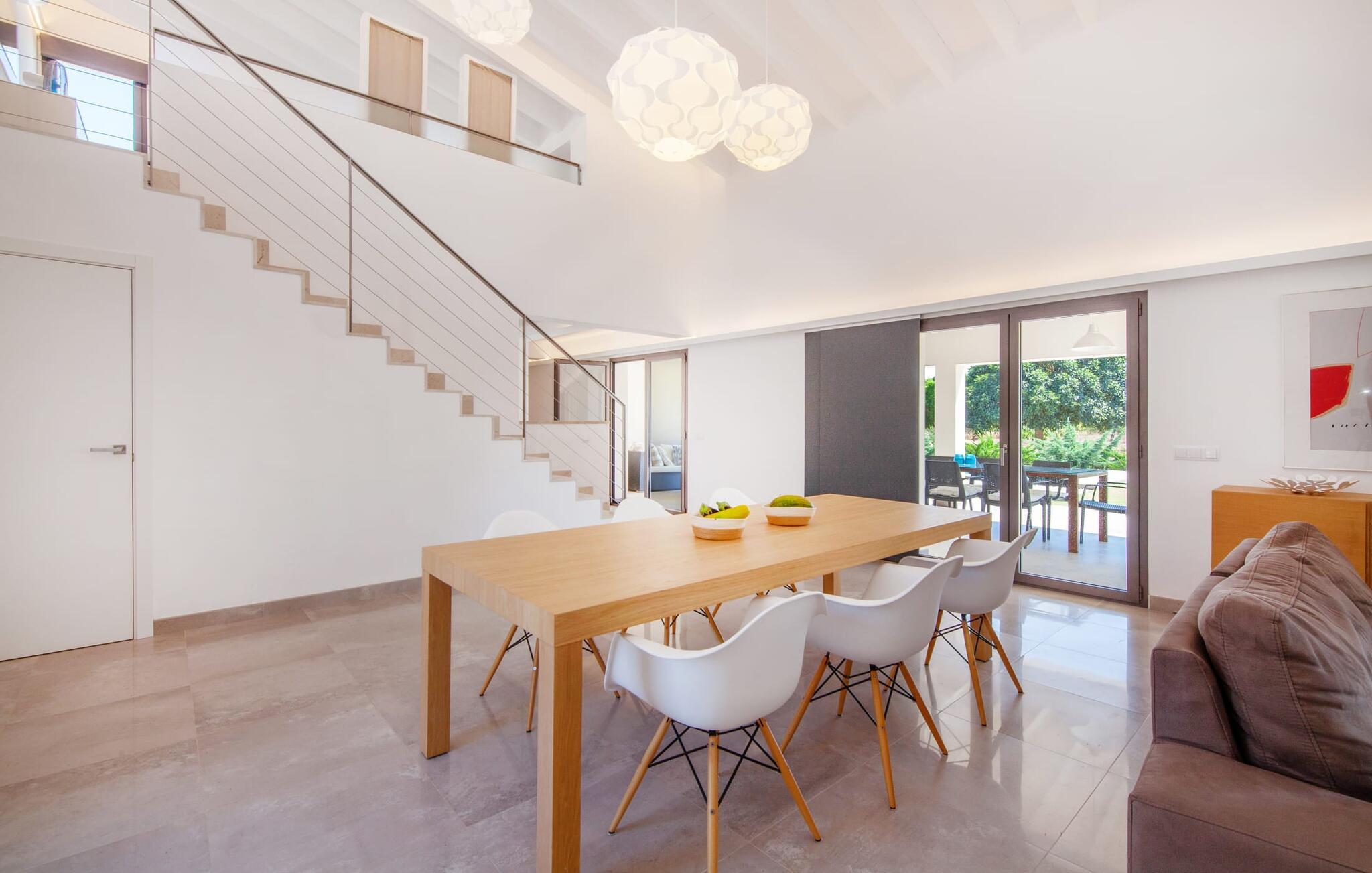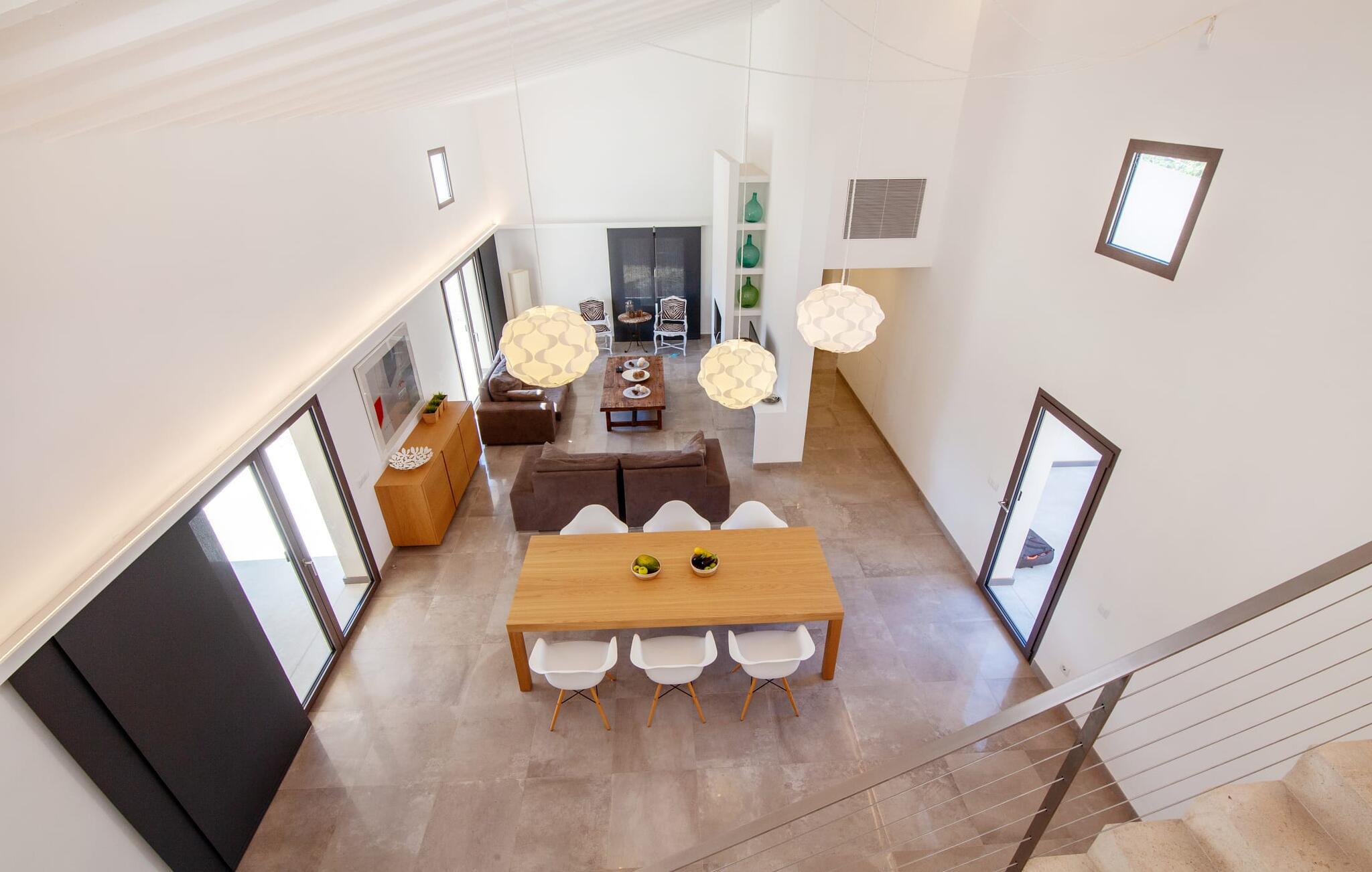 "Can Llorenc Jove" er stilfullt innredet med friske hvite og naturlige toner, supplert med nøye utvalgt kunst. Store vinduer og smart indirekte belysning skaper en lys og luftig atmosfære. Rommene er sjenerøst proporsjonert. I første etasje er det åpen planløsning mellom spisestue og stue, et moderne kjøkken med hvitevarer av høy kvalitet og tre elegante soverom med tre bad, hvorav to har eget bad. En luftig trapp fører til øverste etasje, hvor et galleri med et ekstra soveområde gir tilgang til takterrassen.