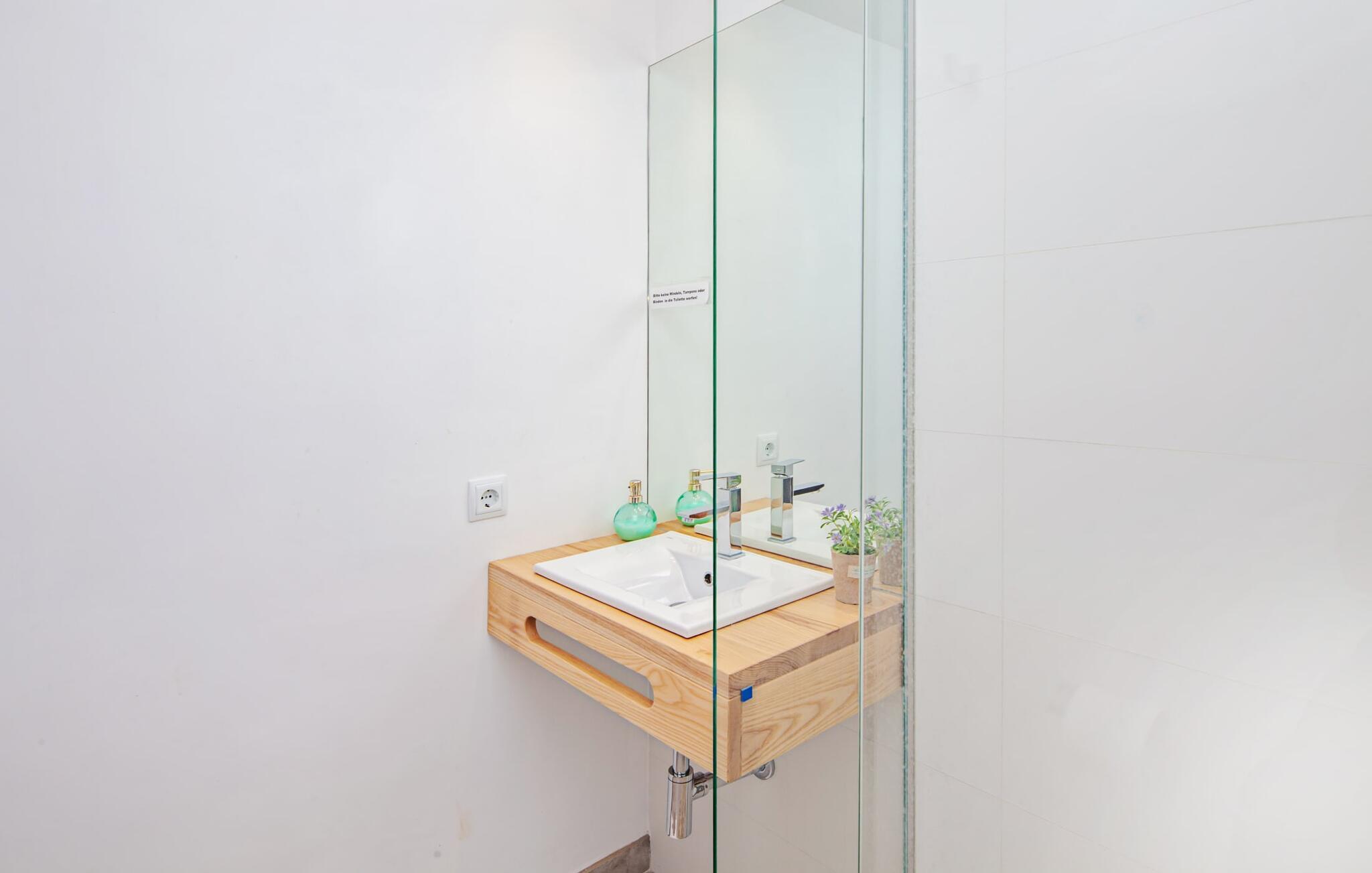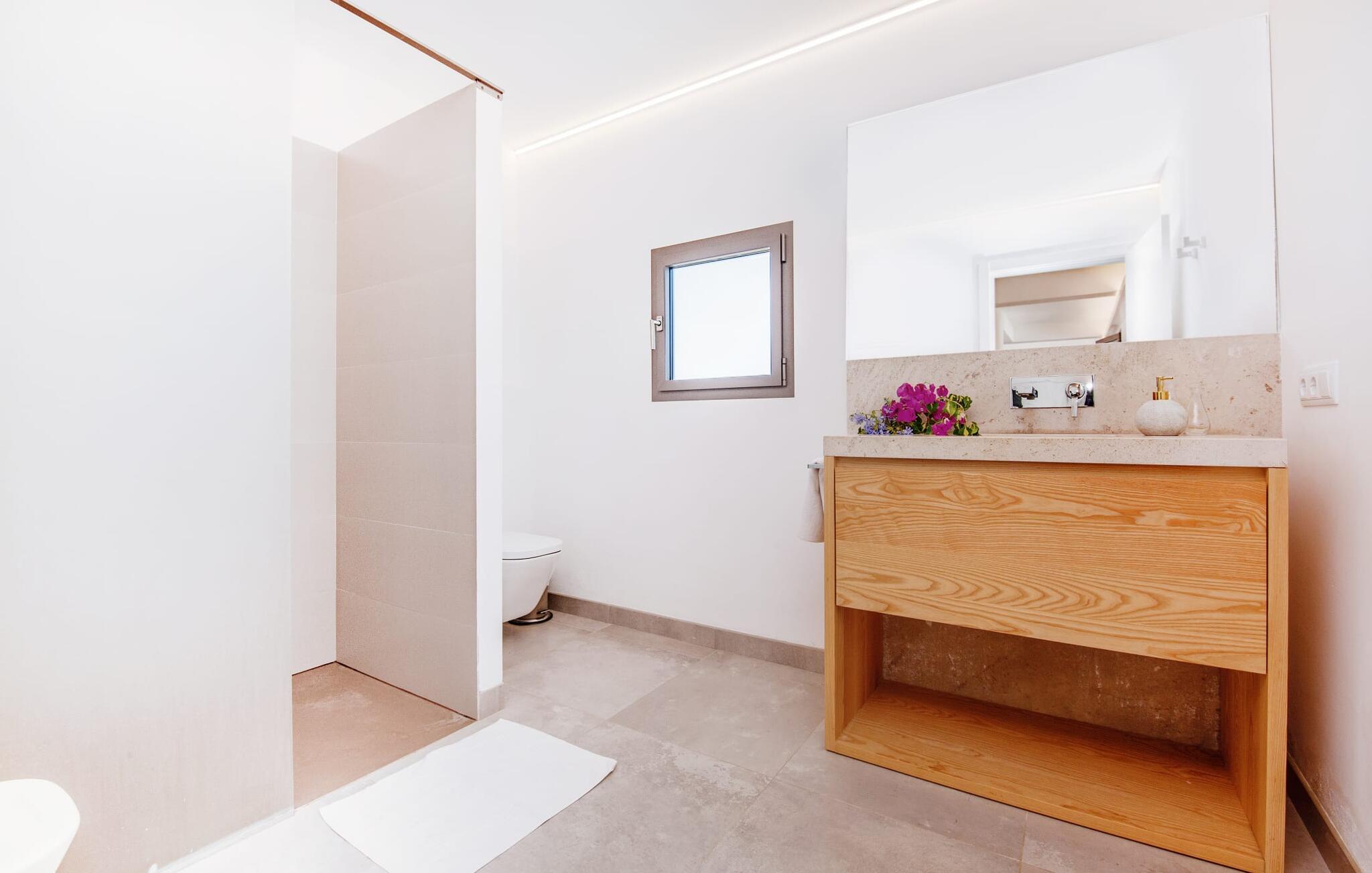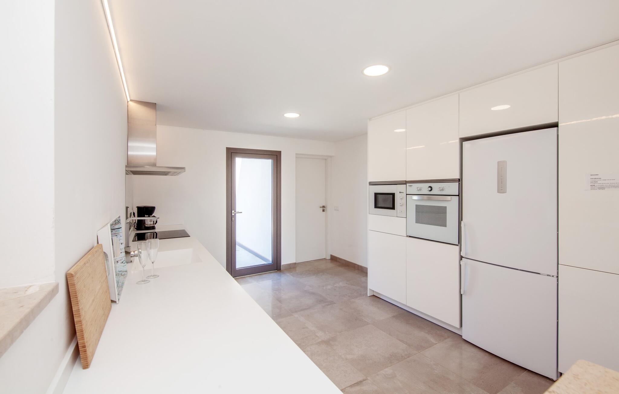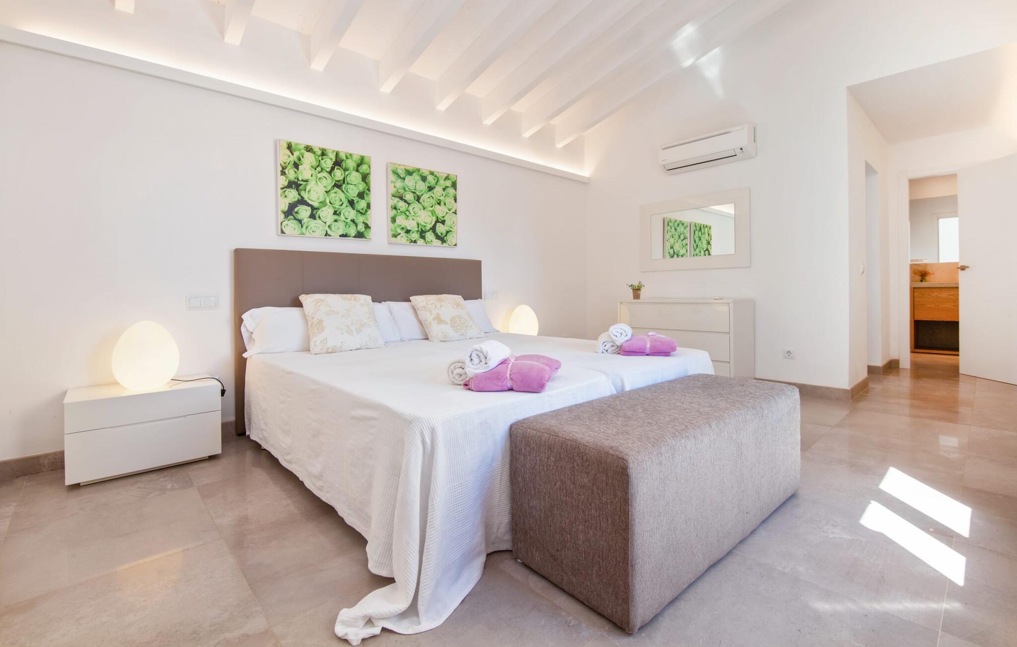 "Can Llorenc Jove" er stilfullt innredet med friske hvite og naturlige toner, supplert med nøye utvalgt kunst. Store vinduer og smart indirekte belysning skaper en lys og luftig atmosfære. Rommene er sjenerøst proporsjonert. I første etasje er det åpen planløsning mellom spisestue og stue, et moderne kjøkken med hvitevarer av høy kvalitet og tre elegante soverom med tre bad, hvorav to har eget bad. En luftig trapp fører til øverste etasje, hvor et galleri med et ekstra soveområde gir tilgang til takterrassen.