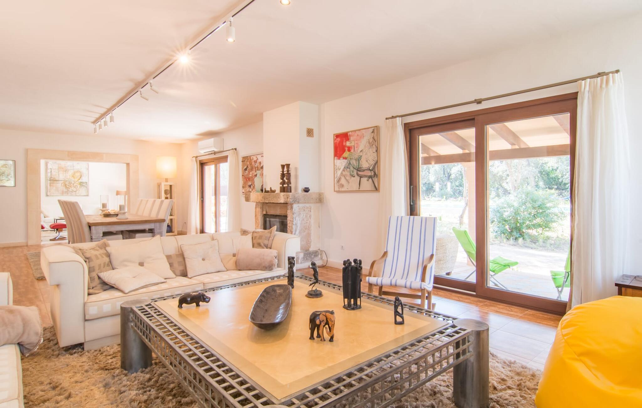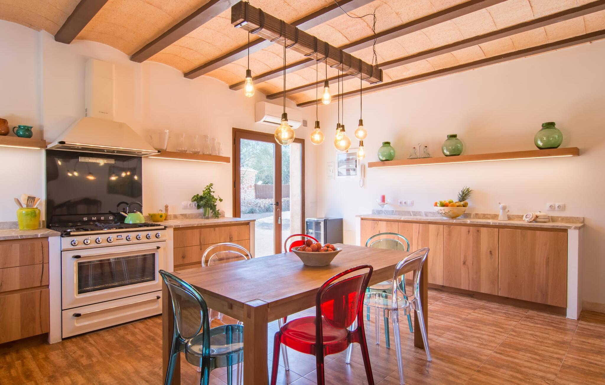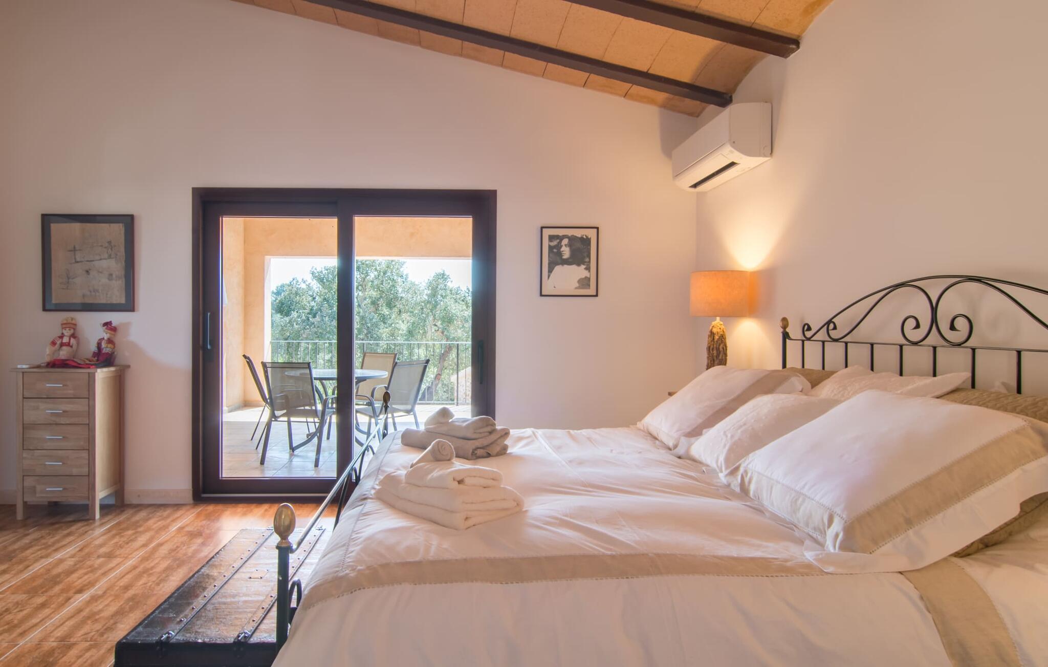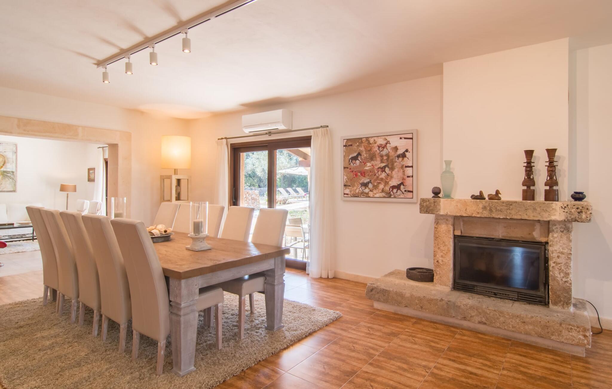 Avslapning er hovedaktiviteten på programmet, så den eksepsjonelt elegante innvendige og utvendige designen vil alltid tilfredsstille dine behov. Midtpunktet er det kombinerte oppholdsrommet. Dette lyse oppholdsrommet med vinduer fra gulv til tak er delt inn i en koselig stue med sofagruppe og TV-hjørne, en stilfull spiseplass foran en hyggelig peis og et rustikt bibliotek, også med Smart-TV. Så mange favorittsteder å velge mellom! Terrakotta, tregulv, buede tak og stær understreker den naturlige atmosfæren i interiøret. Du vil også oppdage denne kvaliteten i det fullt utstyrte kjøkkenet med tremøbler av høy kvalitet. Samtidig minner det om en gammel bondegård med den andre peisen: I tidligere tider var dette det sosiale senteret, da det ofte var det eneste oppvarmede rommet. Etter lange, frie dager vil du etter hvert føle deg trøtt og kan trekke deg tilbake til et av de fire soverommene med klimaanlegg, hvorav de fleste ligger i øverste etasje (ett soverom med bad ligger i første etasje). I første etasje har hvert av de elegante soverommene med fantastisk utsikt også et bad med dusjkabinett eller badekar. Den romslige balkongen med baldakin og utsikt over hagen og bassenget er det ideelle tilfluktsstedet for å lese en god bok. La oss være ærlige, kan du tenke deg noe du måtte gå på kompromiss med? Vi er absolutt strålende fornøyd med Can Madis.
