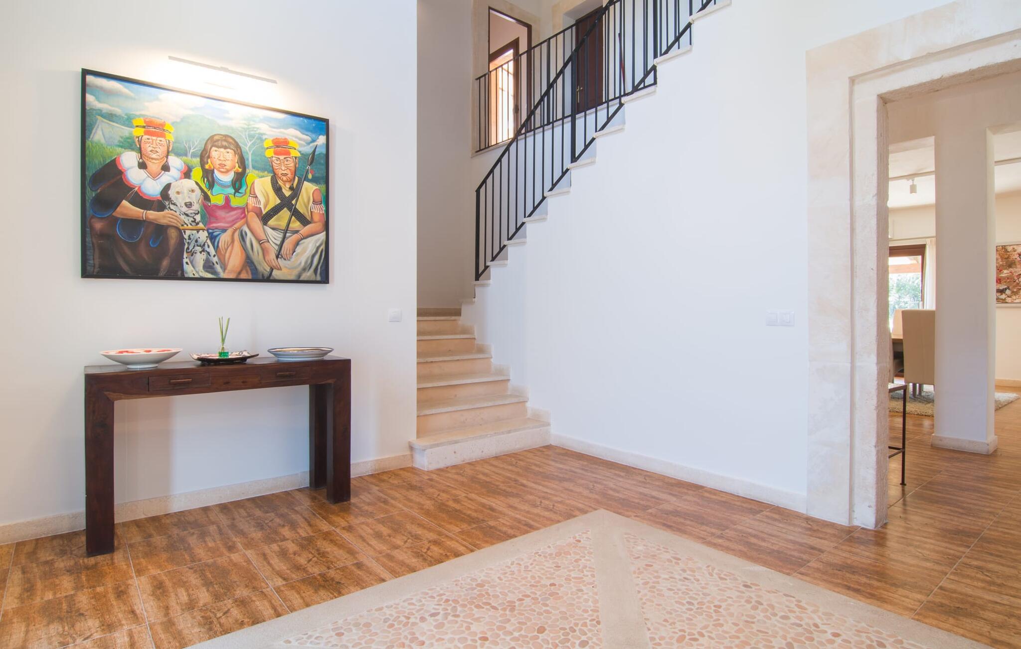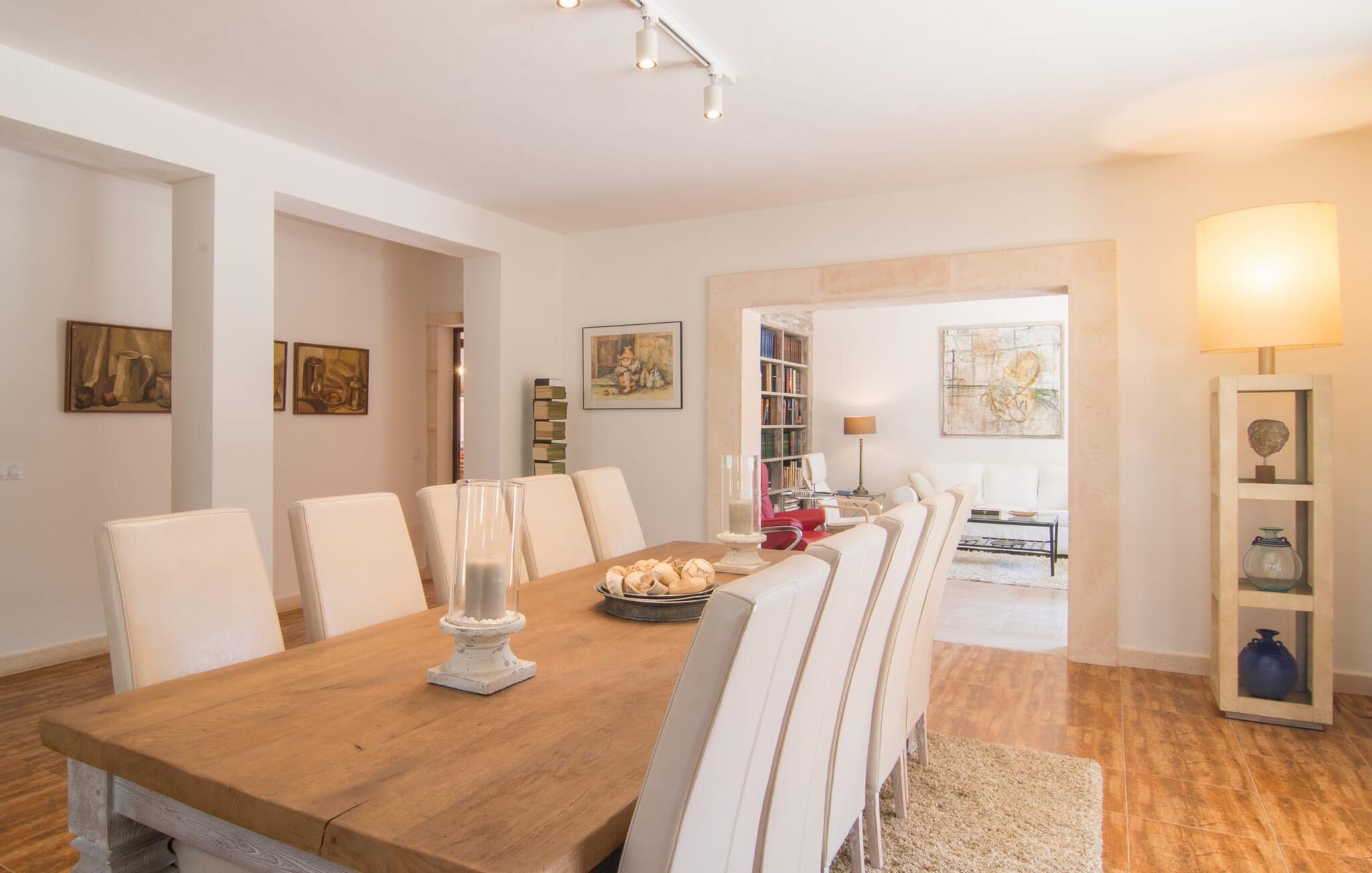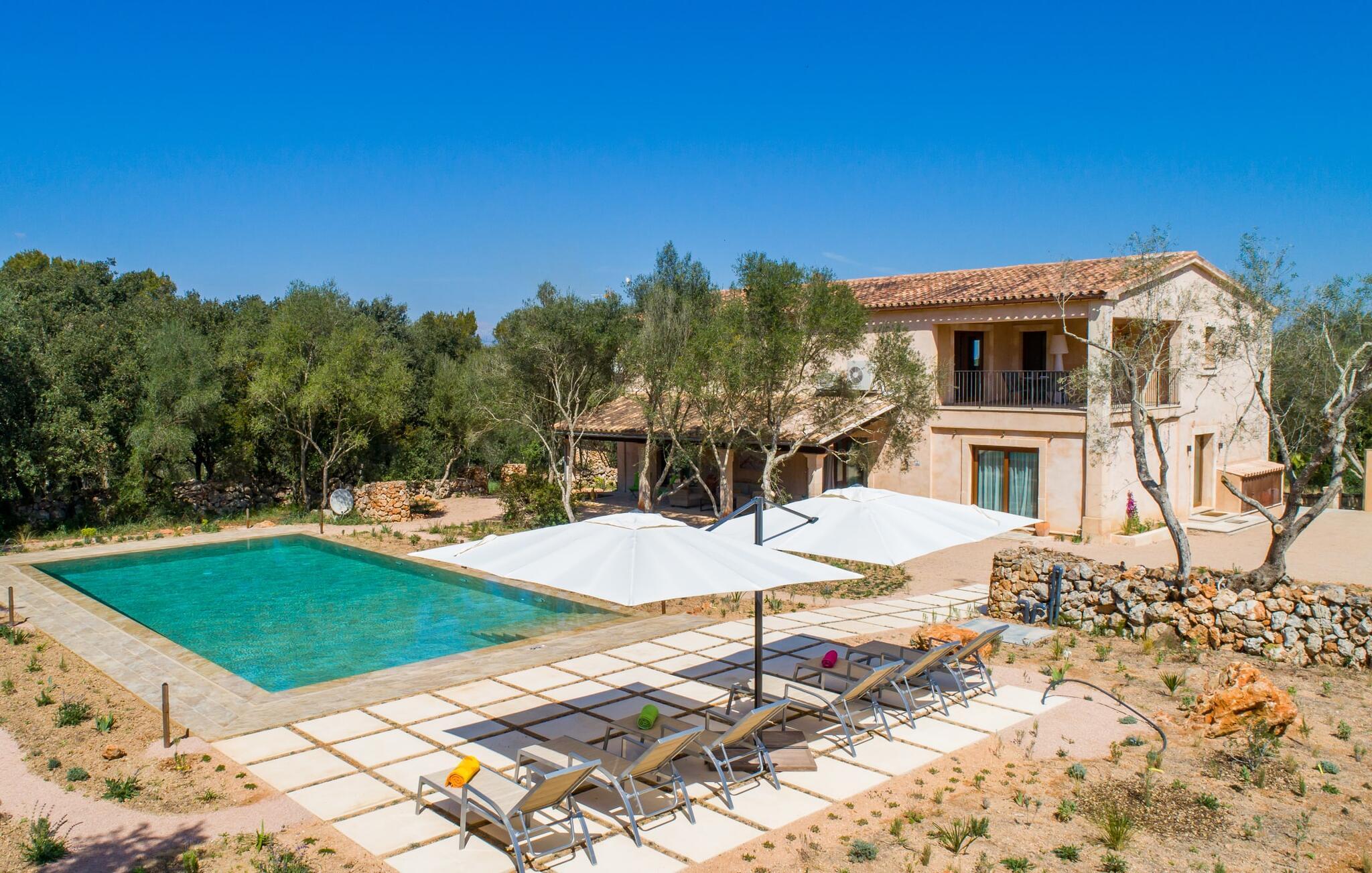 Avslapning er hovedaktiviteten på programmet, så den eksepsjonelt elegante innvendige og utvendige designen vil alltid tilfredsstille dine behov. Midtpunktet er det kombinerte oppholdsrommet. Dette lyse oppholdsrommet med vinduer fra gulv til tak er delt inn i en koselig stue med sofagruppe og TV-hjørne, en stilfull spiseplass foran en hyggelig peis og et rustikt bibliotek, også med Smart-TV. Så mange favorittsteder å velge mellom! Terrakotta, tregulv, buede tak og stær understreker den naturlige atmosfæren i interiøret. Du vil også oppdage denne kvaliteten i det fullt utstyrte kjøkkenet med tremøbler av høy kvalitet. Samtidig minner det om en gammel bondegård med den andre peisen: I tidligere tider var dette det sosiale senteret, da det ofte var det eneste oppvarmede rommet. Etter lange, frie dager vil du etter hvert føle deg trøtt og kan trekke deg tilbake til et av de fire soverommene med klimaanlegg, hvorav de fleste ligger i øverste etasje (ett soverom med bad ligger i første etasje). I første etasje har hvert av de elegante soverommene med fantastisk utsikt også et bad med dusjkabinett eller badekar. Den romslige balkongen med baldakin og utsikt over hagen og bassenget er det ideelle tilfluktsstedet for å lese en god bok. La oss være ærlige, kan du tenke deg noe du måtte gå på kompromiss med? Vi er absolutt strålende fornøyd med Can Madis.