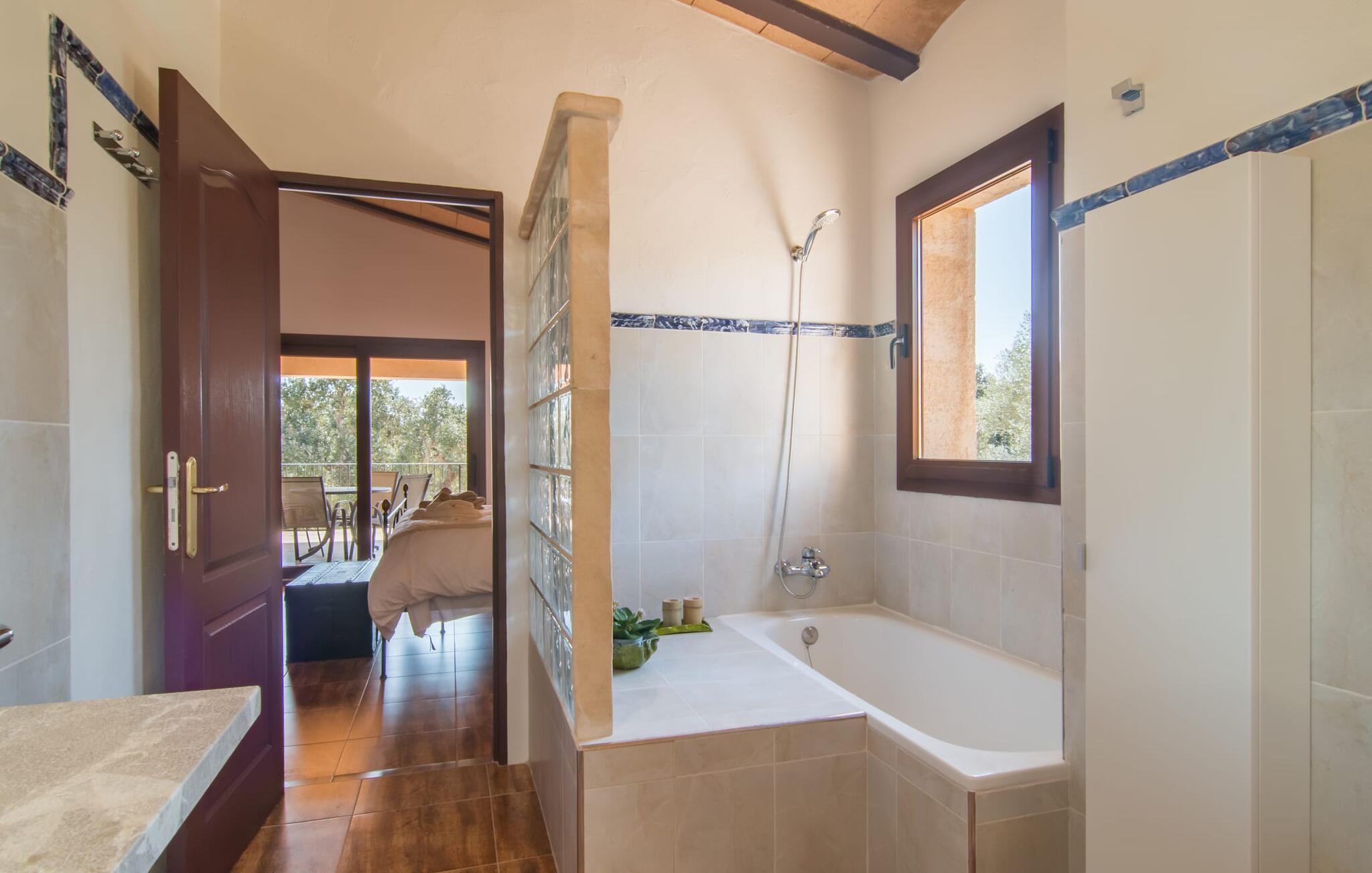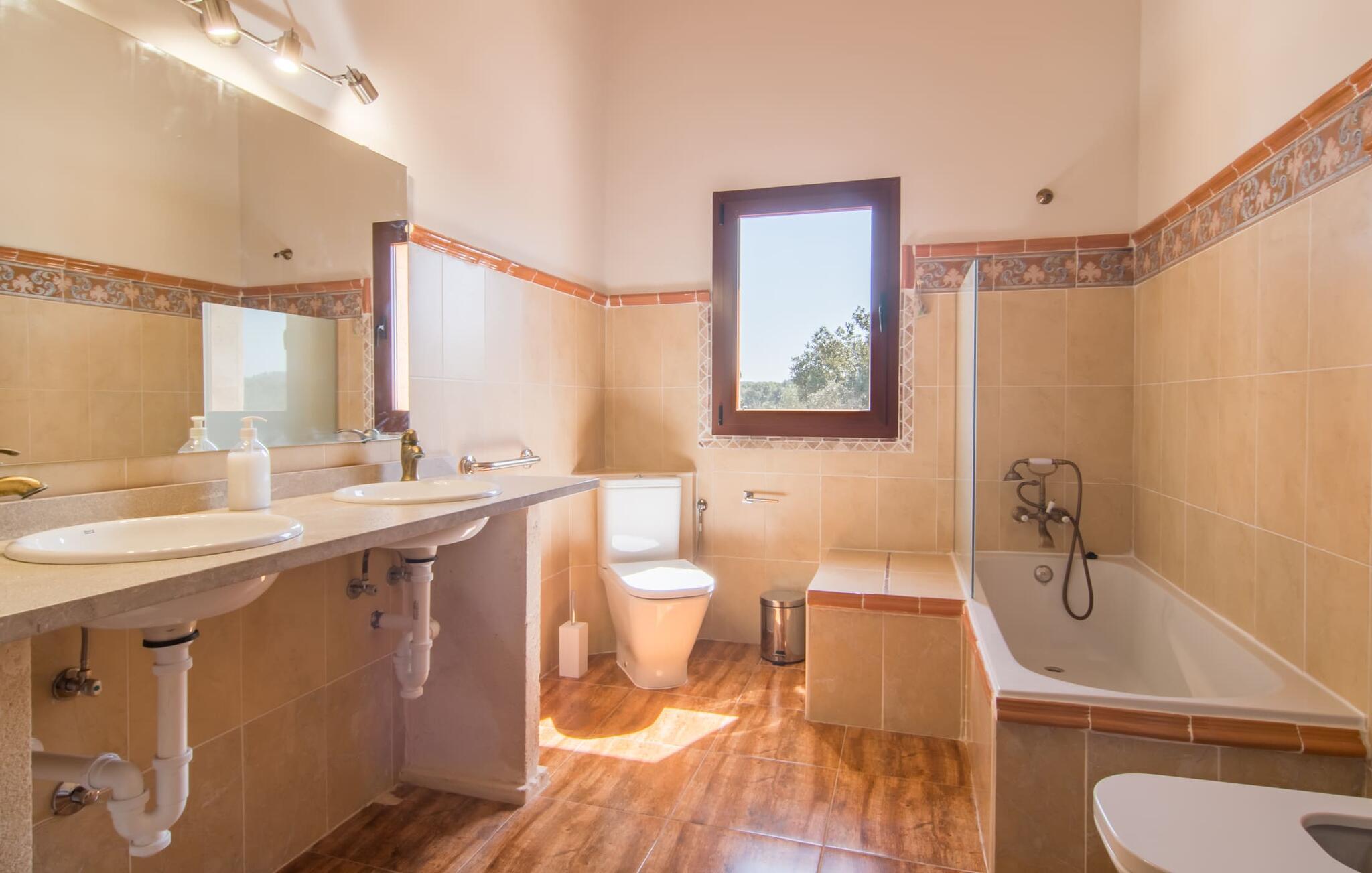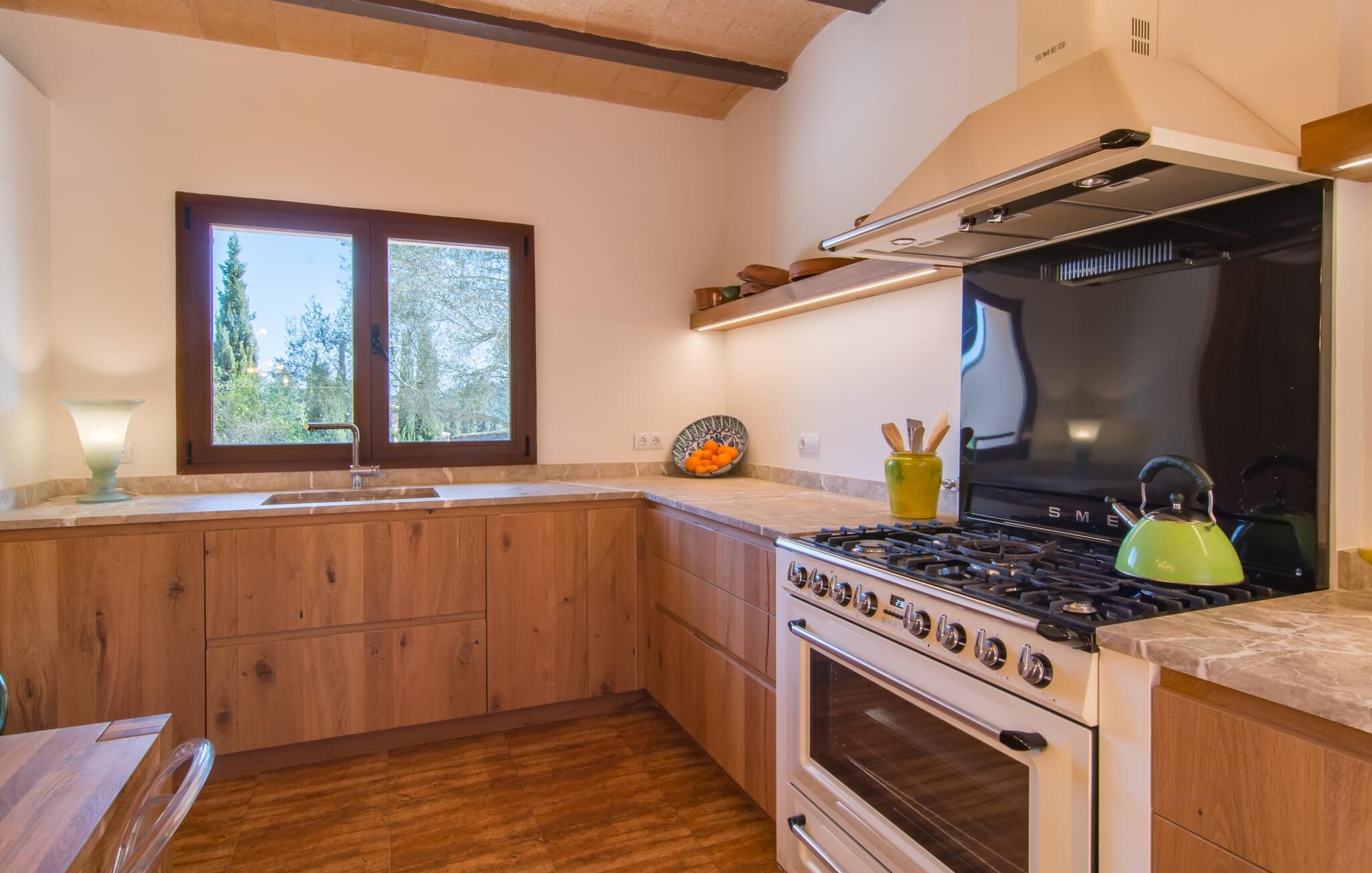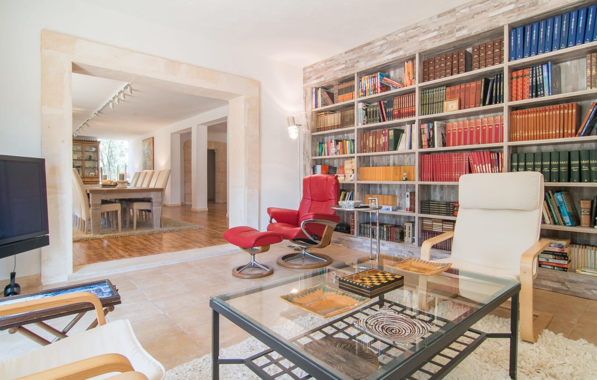 Avslapning er hovedaktiviteten på programmet, så den eksepsjonelt elegante innvendige og utvendige designen vil alltid tilfredsstille dine behov. Midtpunktet er det kombinerte oppholdsrommet. Dette lyse oppholdsrommet med vinduer fra gulv til tak er delt inn i en koselig stue med sofagruppe og TV-hjørne, en stilfull spiseplass foran en hyggelig peis og et rustikt bibliotek, også med Smart-TV. Så mange favorittsteder å velge mellom! Terrakotta, tregulv, buede tak og stær understreker den naturlige atmosfæren i interiøret. Du vil også oppdage denne kvaliteten i det fullt utstyrte kjøkkenet med tremøbler av høy kvalitet. Samtidig minner det om en gammel bondegård med den andre peisen: I tidligere tider var dette det sosiale senteret, da det ofte var det eneste oppvarmede rommet. Etter lange, frie dager vil du etter hvert føle deg trøtt og kan trekke deg tilbake til et av de fire soverommene med klimaanlegg, hvorav de fleste ligger i øverste etasje (ett soverom med bad ligger i første etasje). I første etasje har hvert av de elegante soverommene med fantastisk utsikt også et bad med dusjkabinett eller badekar. Den romslige balkongen med baldakin og utsikt over hagen og bassenget er det ideelle tilfluktsstedet for å lese en god bok. La oss være ærlige, kan du tenke deg noe du måtte gå på kompromiss med? Vi er absolutt strålende fornøyd med Can Madis.