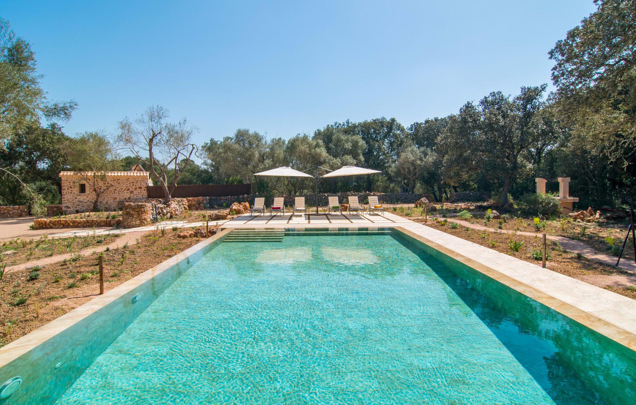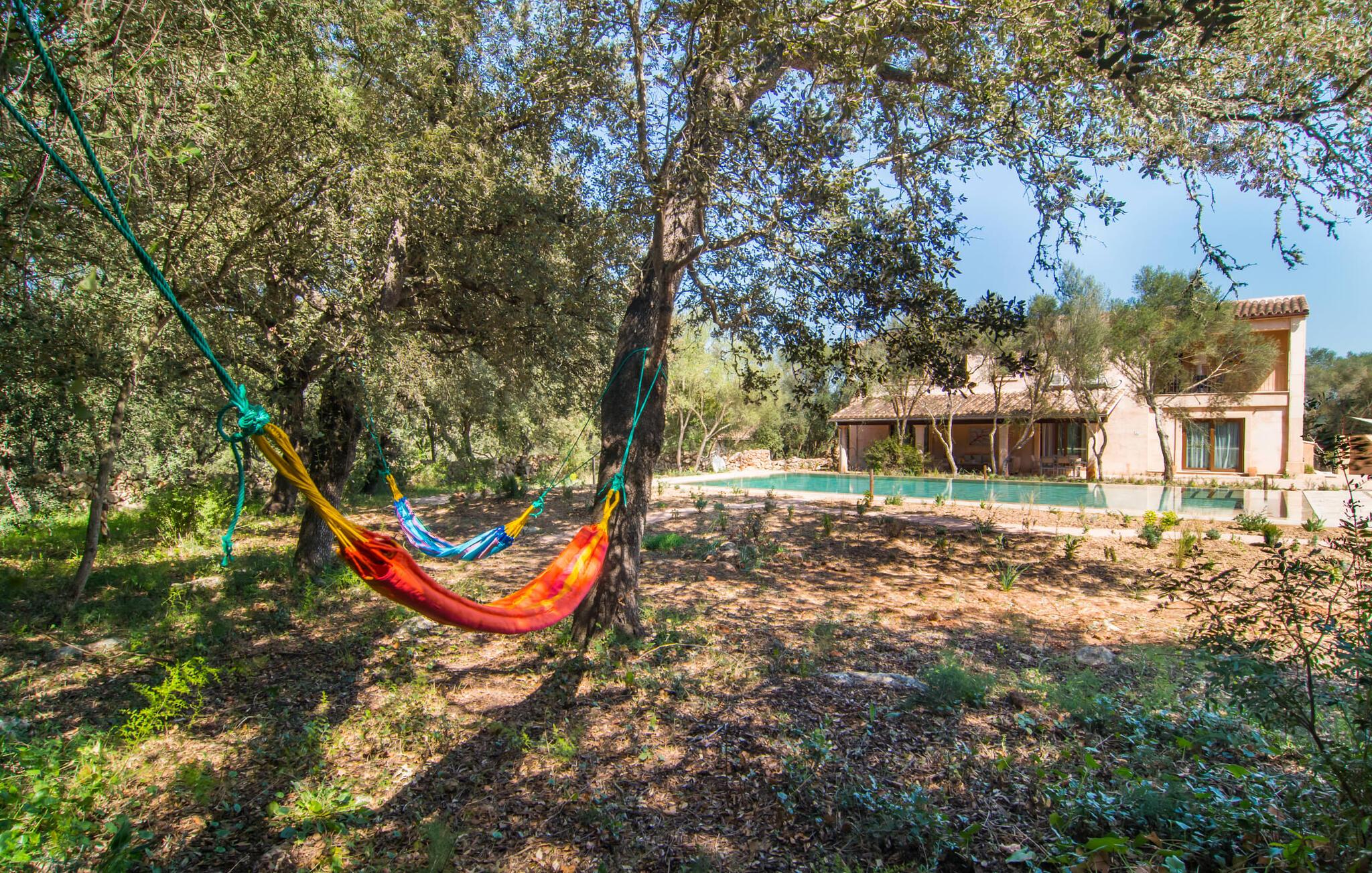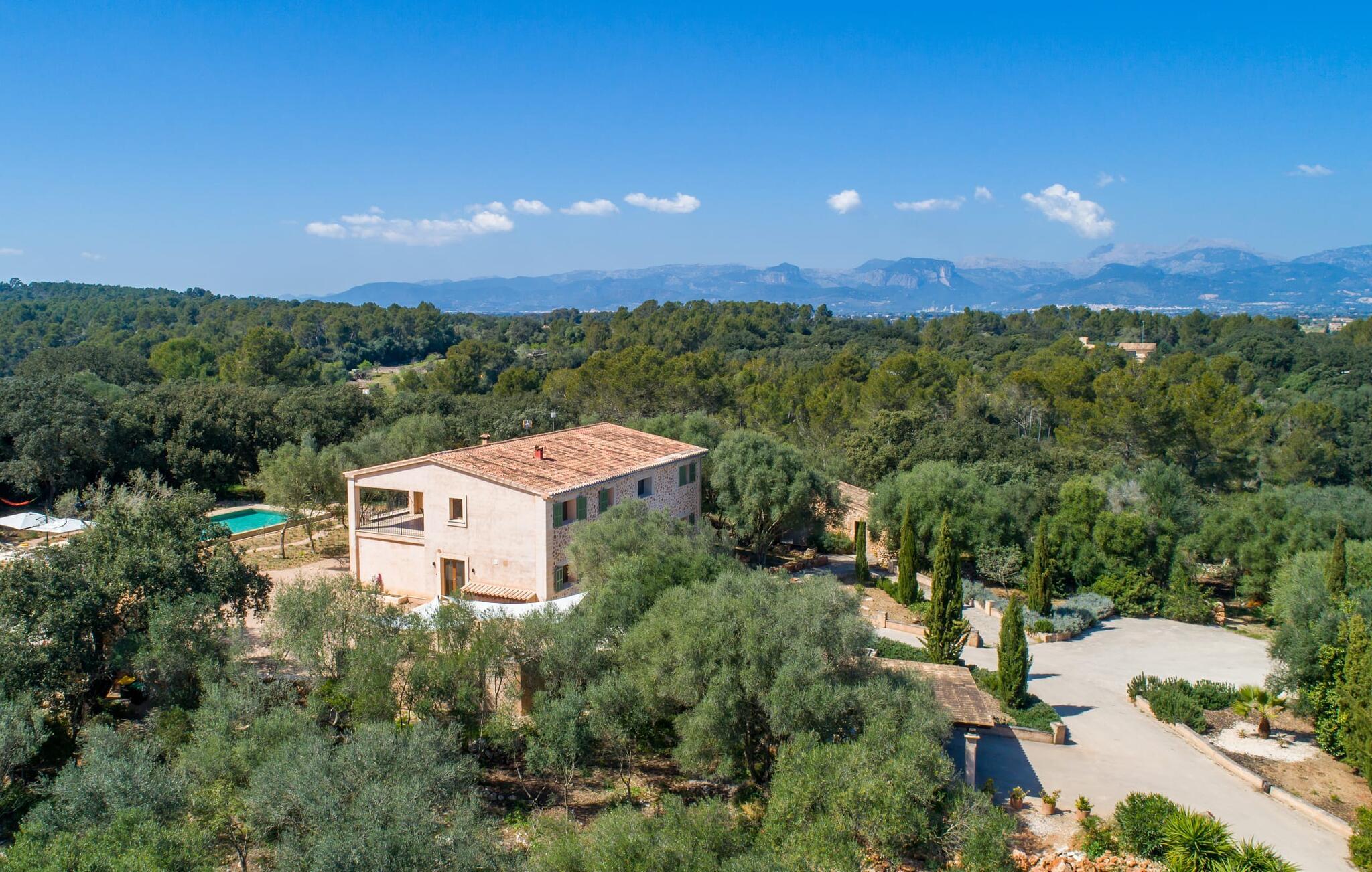 Fargene i Can Madis fanger øyeblikkelig blikket - de uttrykker livlighet, frihet, nærhet til naturen og samtidig en følelse av edel skjønnhet og luksus. Noe vi sjelden unner oss, kanskje altfor sjelden. Derfor bør du unne familien og vennene dine et besøk på Can Madis, en vakker eiendom i hjertet av øya vår. Fiken- og oliventrær, sypresser og utsikt over Tramuntana-fjellene kjennetegner denne middelhavseiendommen. Den nyoppførte sandsteinsbygningen, som skinner gyllent i solen, gjenspeiler tradisjon og modernitet. Det store bassenget med enkel tilgang avrunder det hele. Etter lange dager med utflukter eller fotturer kan du slappe av i boblebadet. Etterpå kan du ta en siesta på en av de komfortable solsengene under den doble parasollen, eller bare slappe av i en av hengekøyene i hagen. Den innebygde grillen i hjørnet fungerer også som peis etter et deilig måltid, og du kan sitte under markisene på de innbydende kurvmøblene ved et langt trebord. Du finner også flere koselige møbler på den overbygde delen av terrassen med spiseplass, avslappet salong og fargerike solsenger.