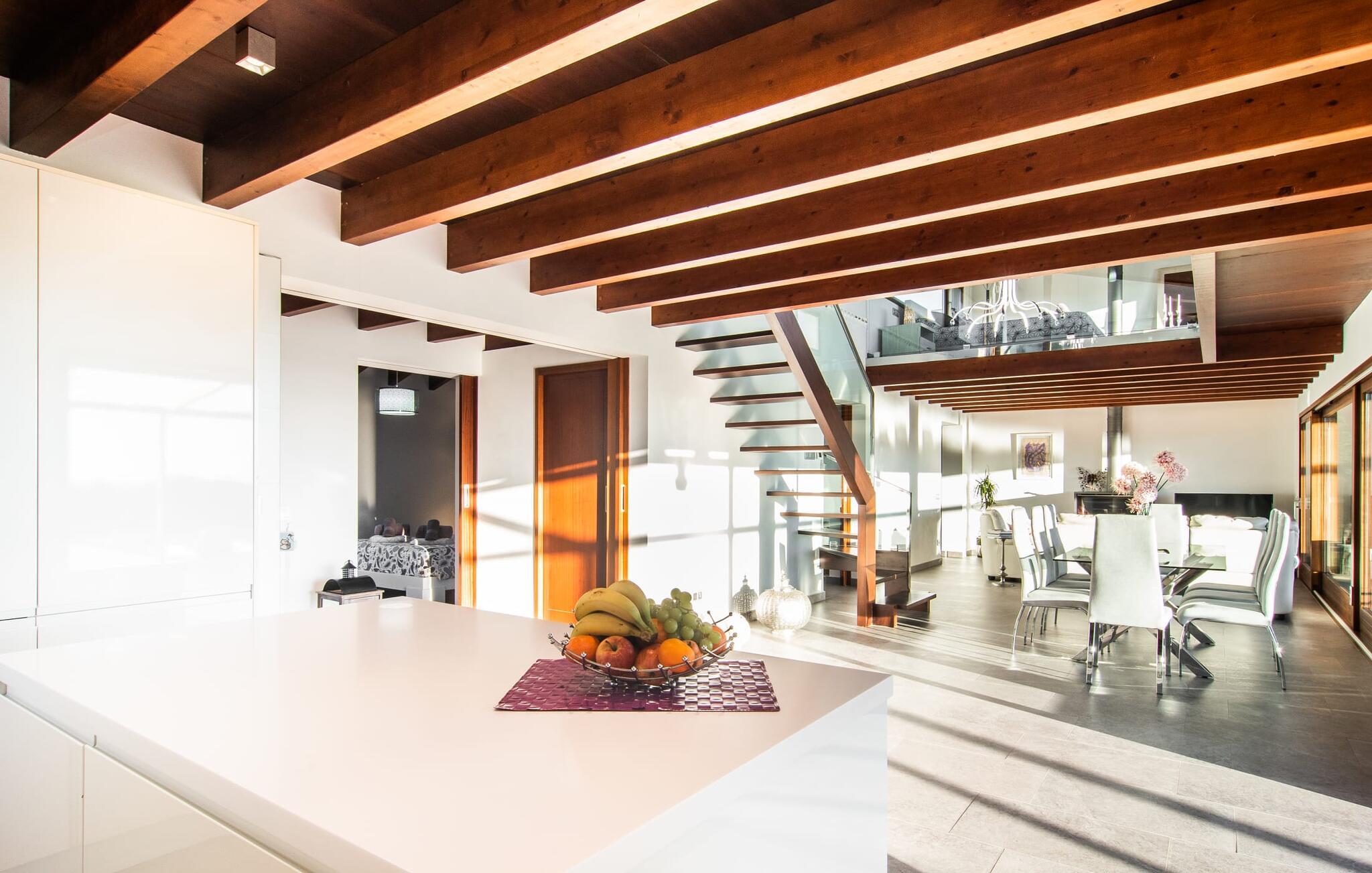 Fincaen har en åpen planløsning, der de fleste rommene flyter over i hverandre, men kan skilles fra hverandre med skyvedører. Store vinduer lar middelhavslyset flomme inn i rommet og skaper en varm og innbydende atmosfære. Boligen er fordelt på to etasjer, som er forbundet med hverandre via en åpen trapp. I første etasje er det stue og spisestue, et kjøkken av høy kvalitet, tre soverom og to bad, hvorav det ene har eget bad. I øverste etasje, som er adskilt av et glassgalleri, er det et ekstra soveområde, et skrivebord for feriearbeid og utgang til en liten, solrik takterrasse.