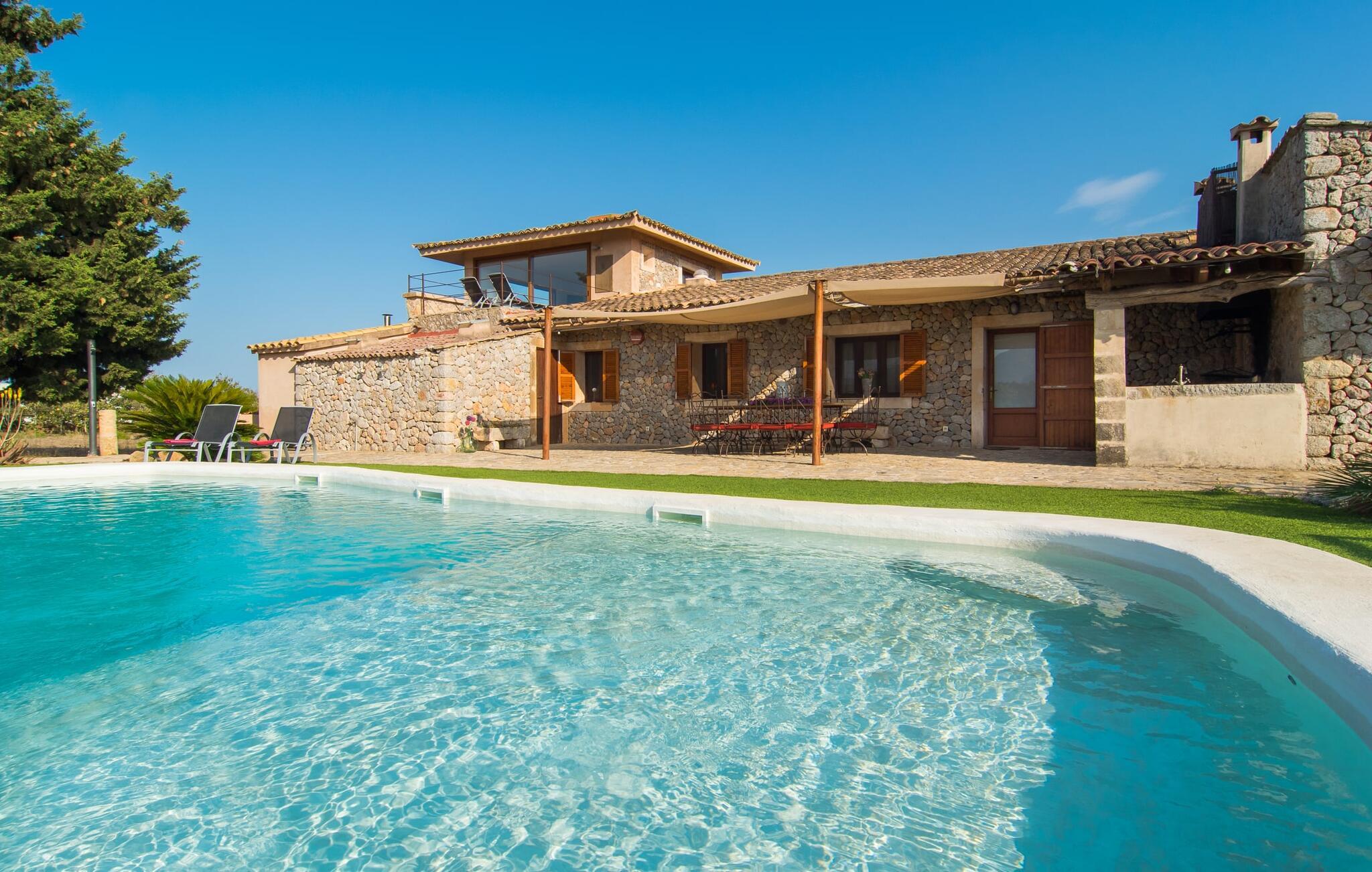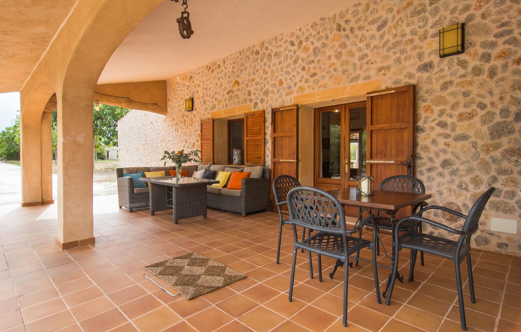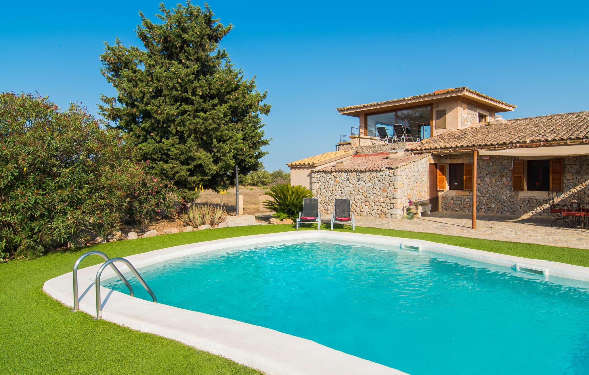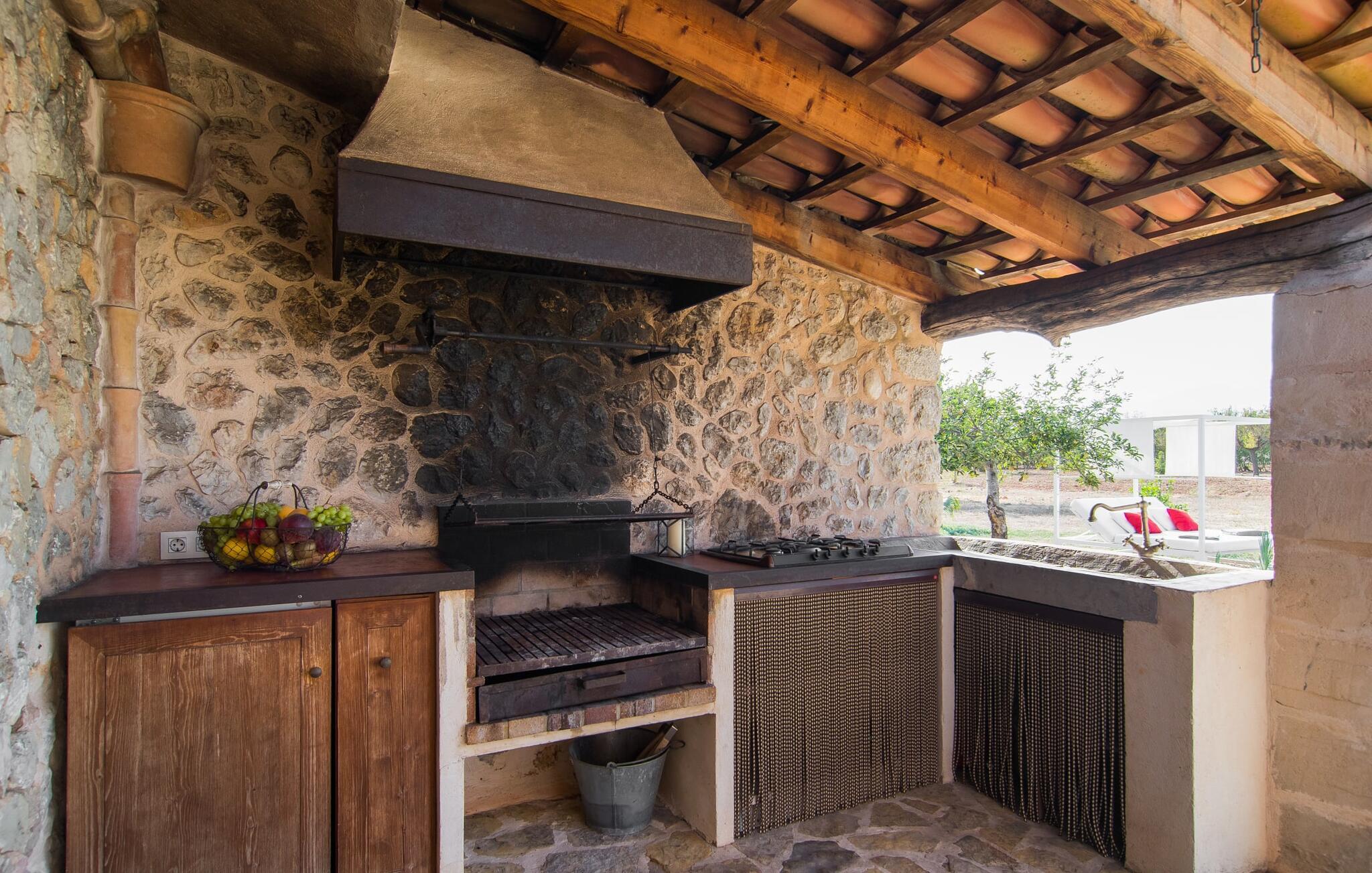 Can Mel har et stort uteområde med svømmebasseng, overbygd terrasse, utekjøkken med grill og vakker utsikt over landskapet og fjellene.