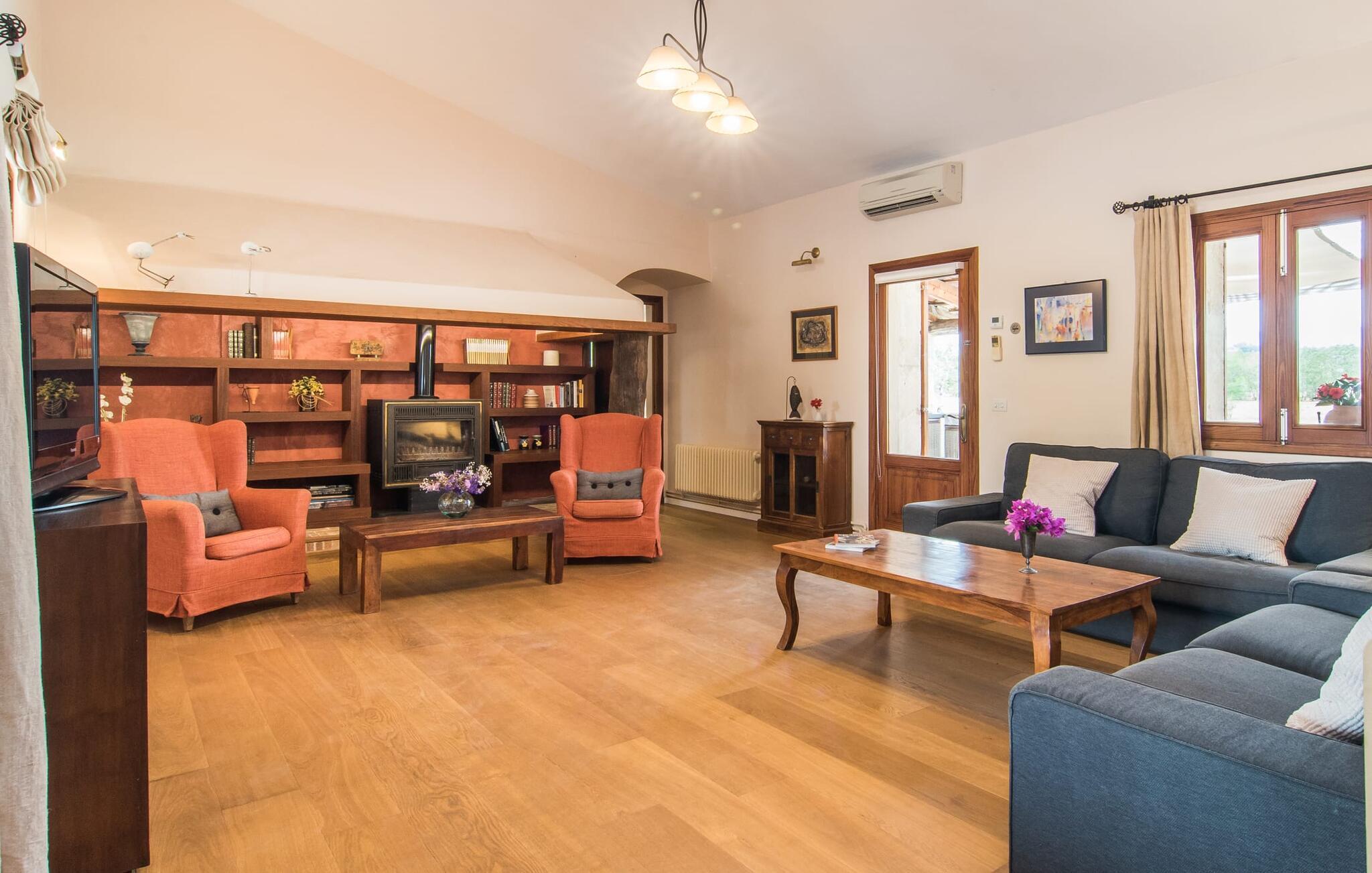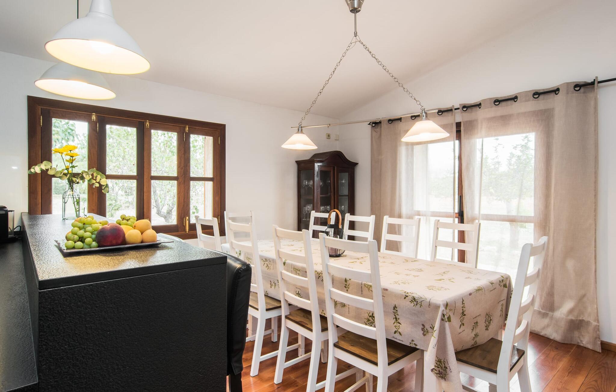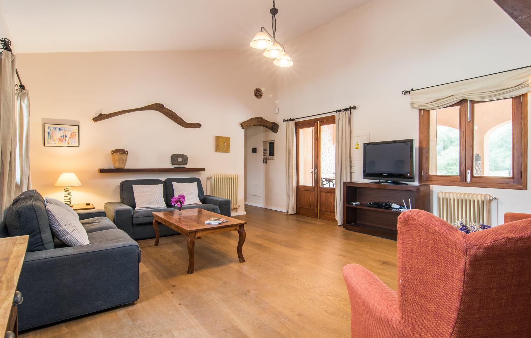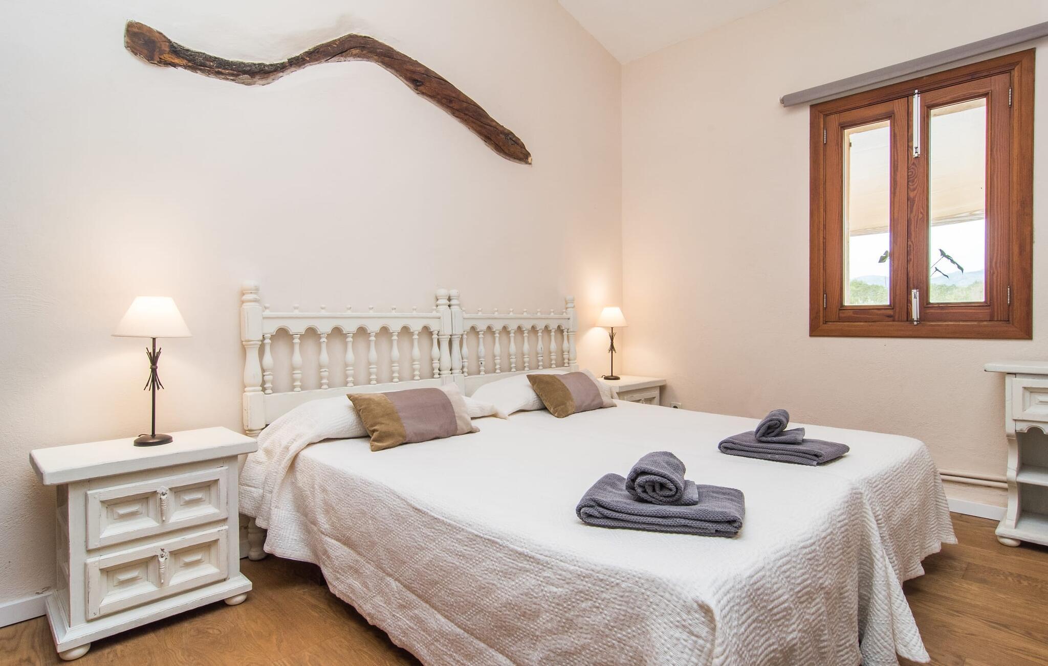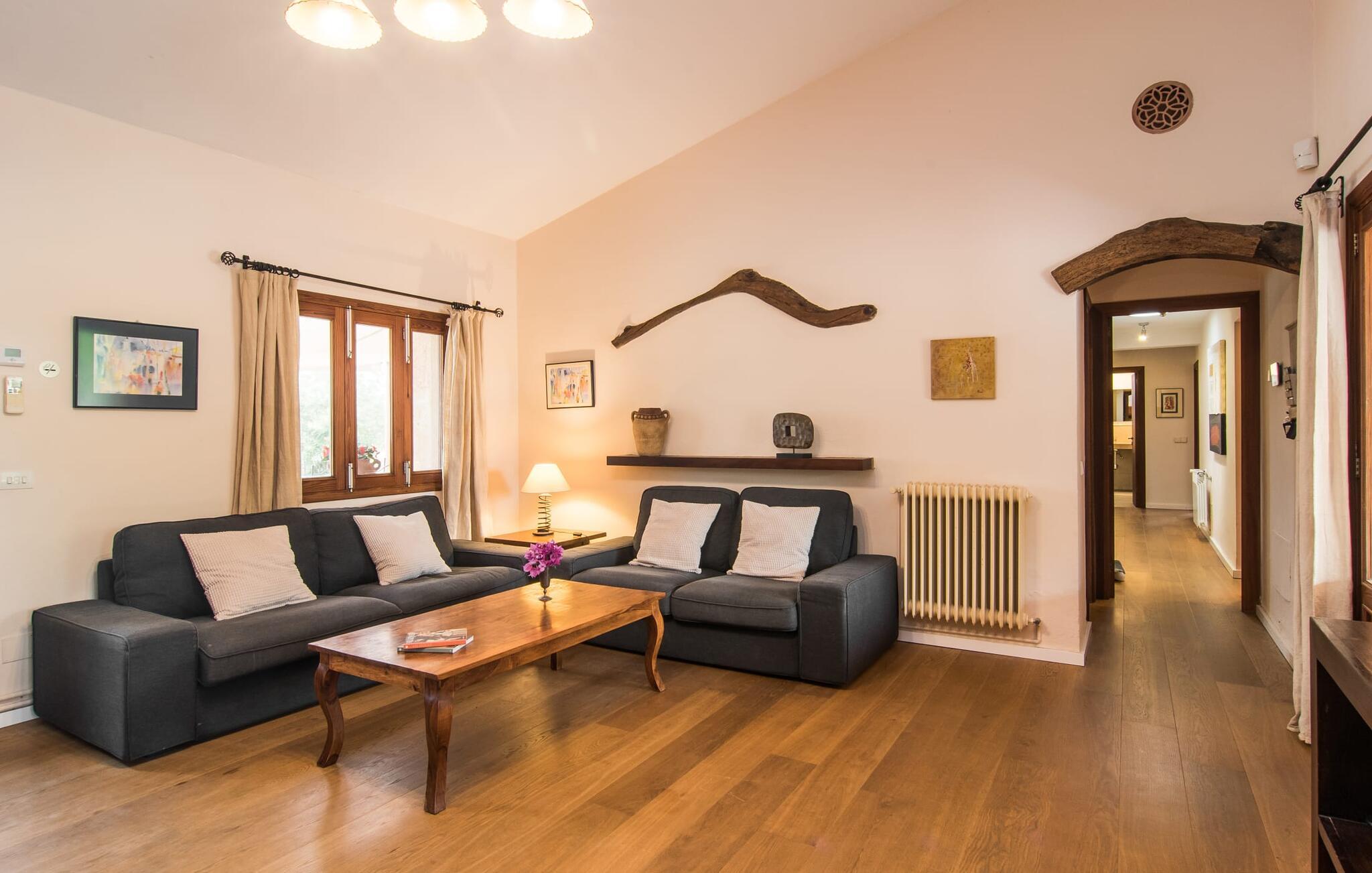 Interiøret i huset er veldig koselig. Romslig stue med peis, fullt utstyrt kjøkken med store vinduer for å nyte utsikten. I første etasje er det også fire soverom og to bad, hvorav det ene har eget bad, samt et praktisk gjestetoalett. Veldig uvanlig: det øverste soverommet med dobbeltseng (også med eget bad) har panoramautsikt takket være XL-vinduene. Terrassen i første etasje har en fantastisk utsikt over landskapet og fjellene. Nyt oppholdet ditt på Can Mel-gården.
