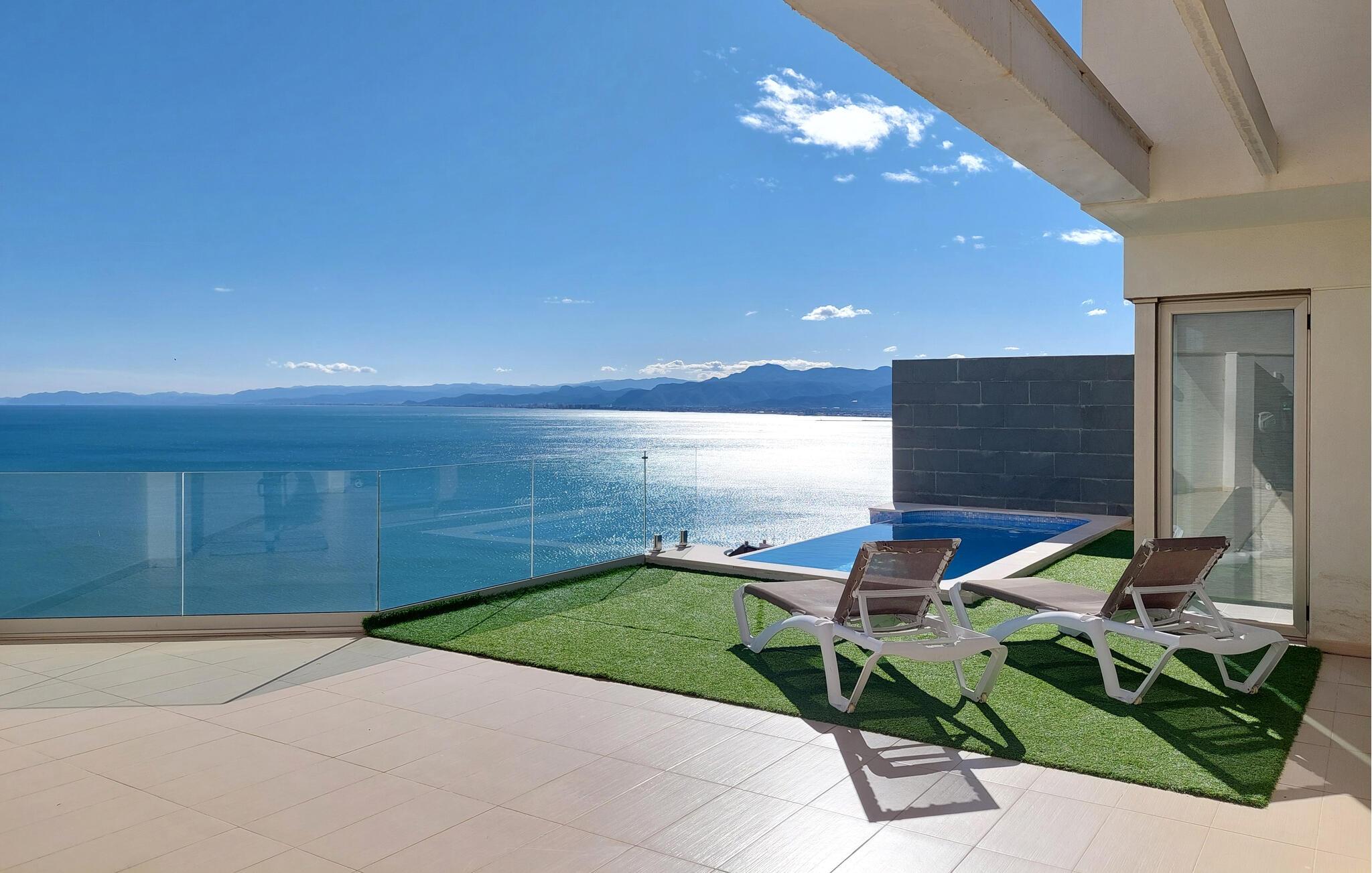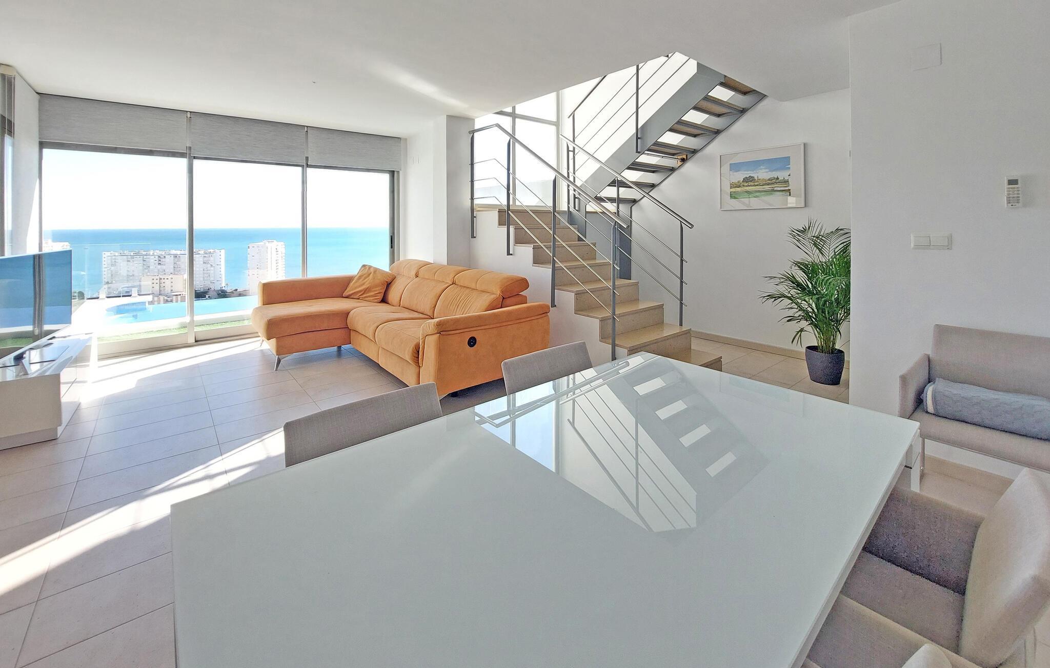 Opplev en unik ferie i dette moderne og romslige feriehuset, som vil glede deg med sin fantastiske panoramautsikt over havet og kysten. De lyse rommene er stilfullt innredet og gir deg maksimal komfort. Fra mange av rommene kan du nyte den spektakulære utsikten over Middelhavet, mens den elegante innredningen og møblene av høy kvalitet skaper en helt spesiell atmosfære.