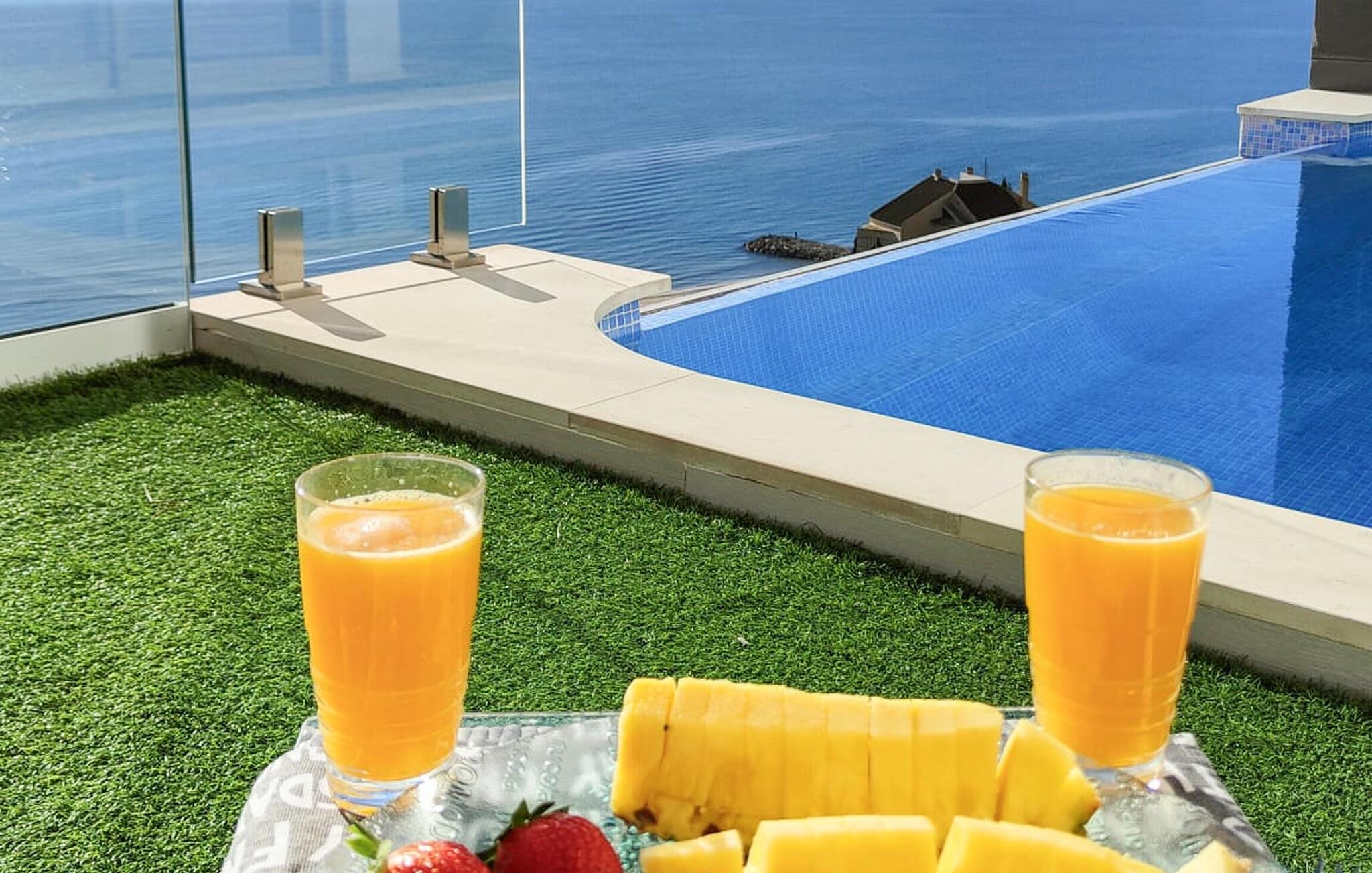 Slapp av i disse elegante og moderne ferieboligene med eksklusiv havutsikt og evighetsbasseng.