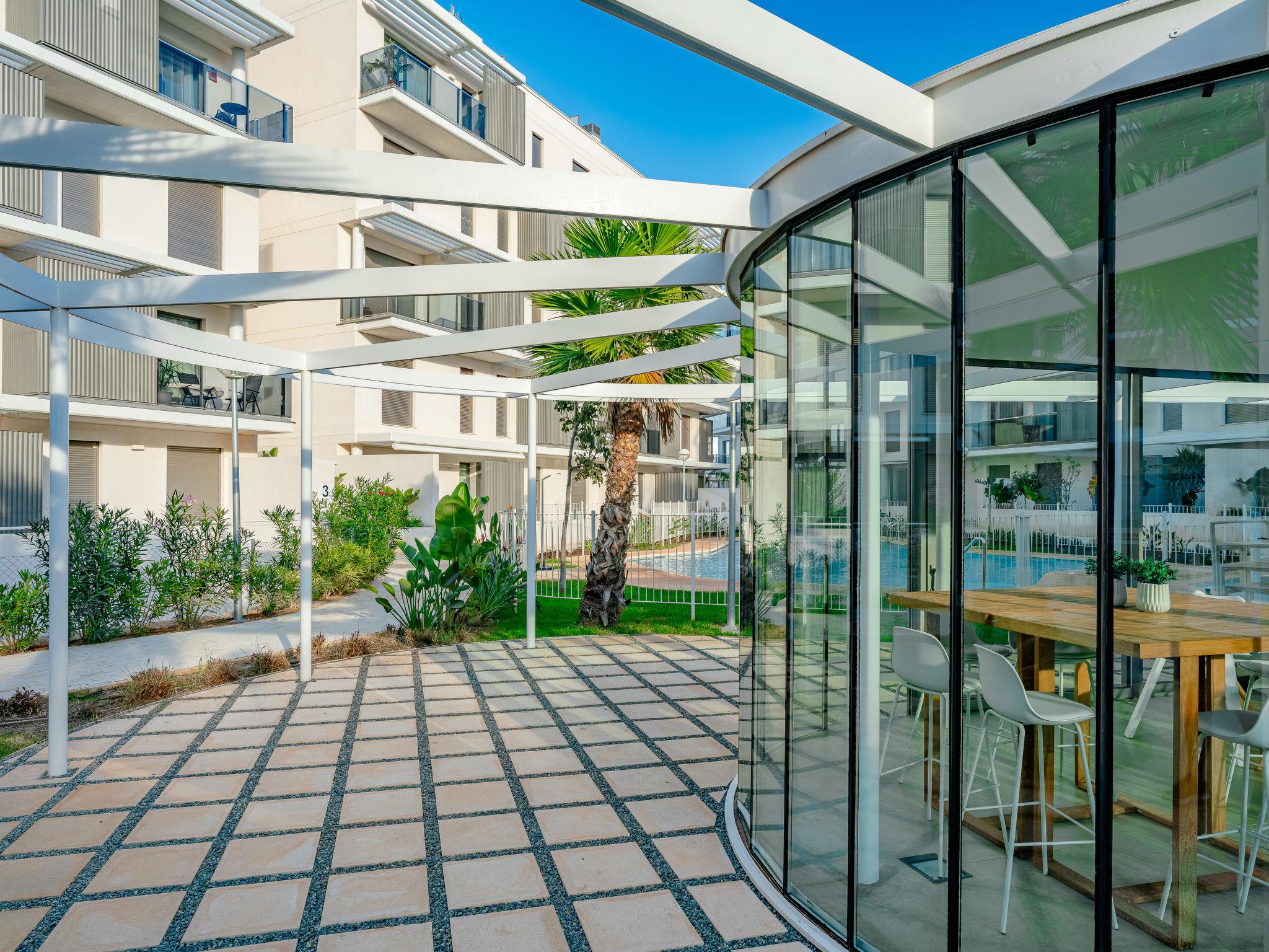 Very large, very modern apartment block "Marina Real III". In the resort 500 m from the centre of Dénia, in a quiet, sunny position, 350 m from the sea, 750 m from the beach. For shared use: large, beautiful, well-kept garden with lawn and trees, 2 swimming pools (20 x 15 m, depth 40 - 210 cm, seasonal availability: 01.Jan. - 31.Dec.) with internal staircase. Unconventional pool shape. Children's pool, outdoor shower, garden furniture, children's playground. In the house: lift. Communal covered parking. Supermarket 100 m, restaurant 500 m, café 450 m, bus stop 1.1 km, railway station 1 km, ferry 2 km, sandy beach "Marineta Cassiana" 700 m. Sports harbour, surf school, sailing school 500 m. The owner does not accept any youth groups.