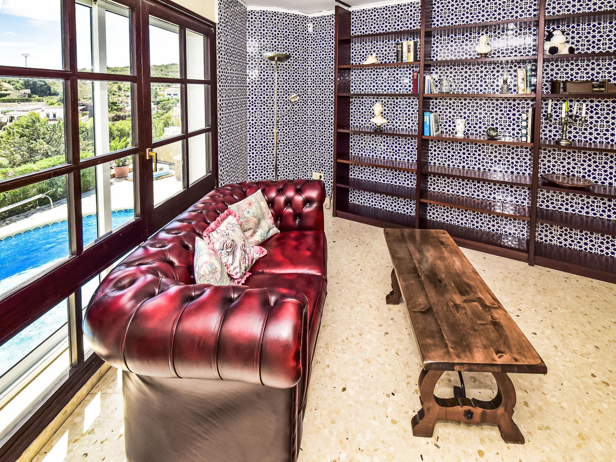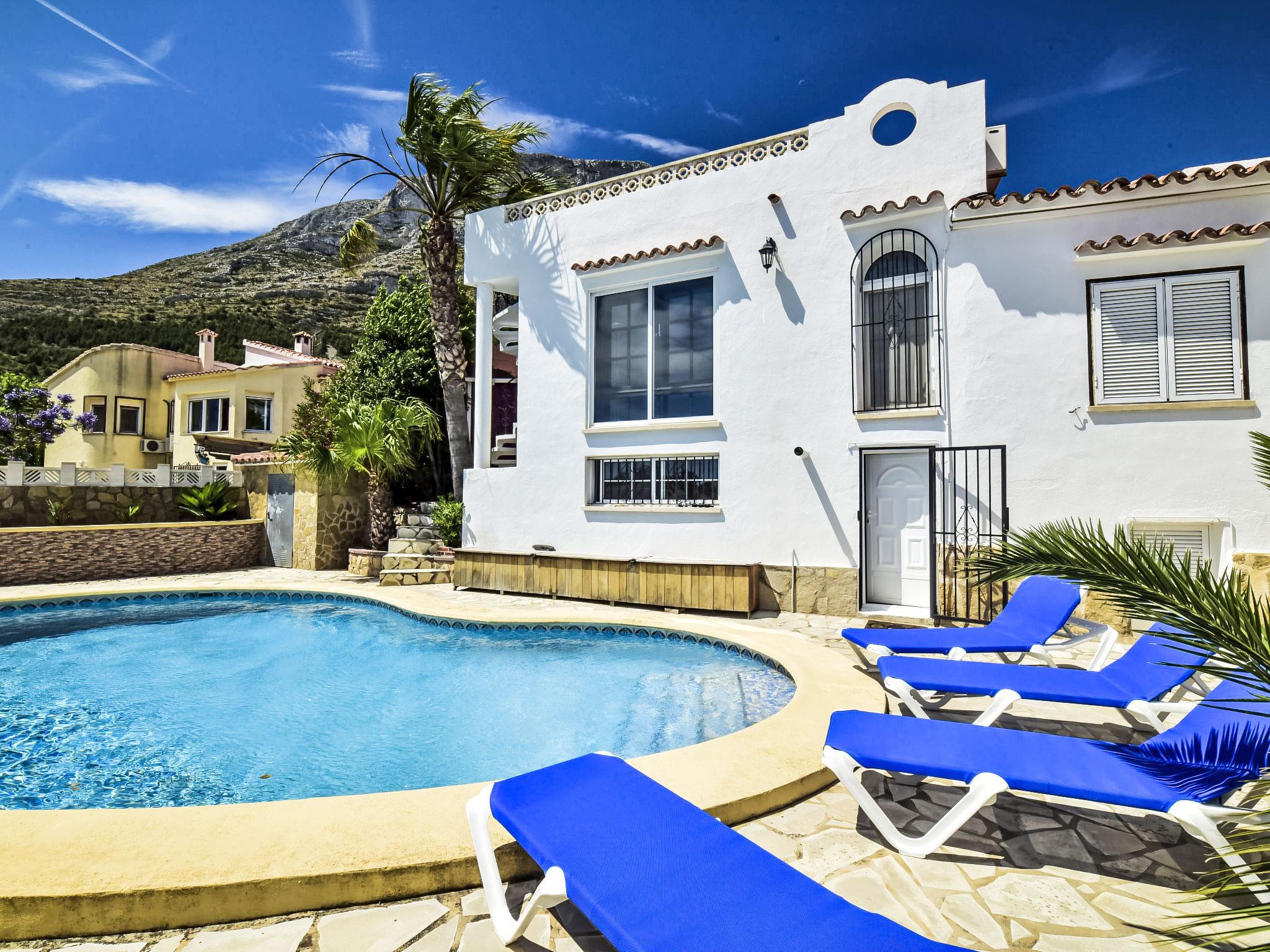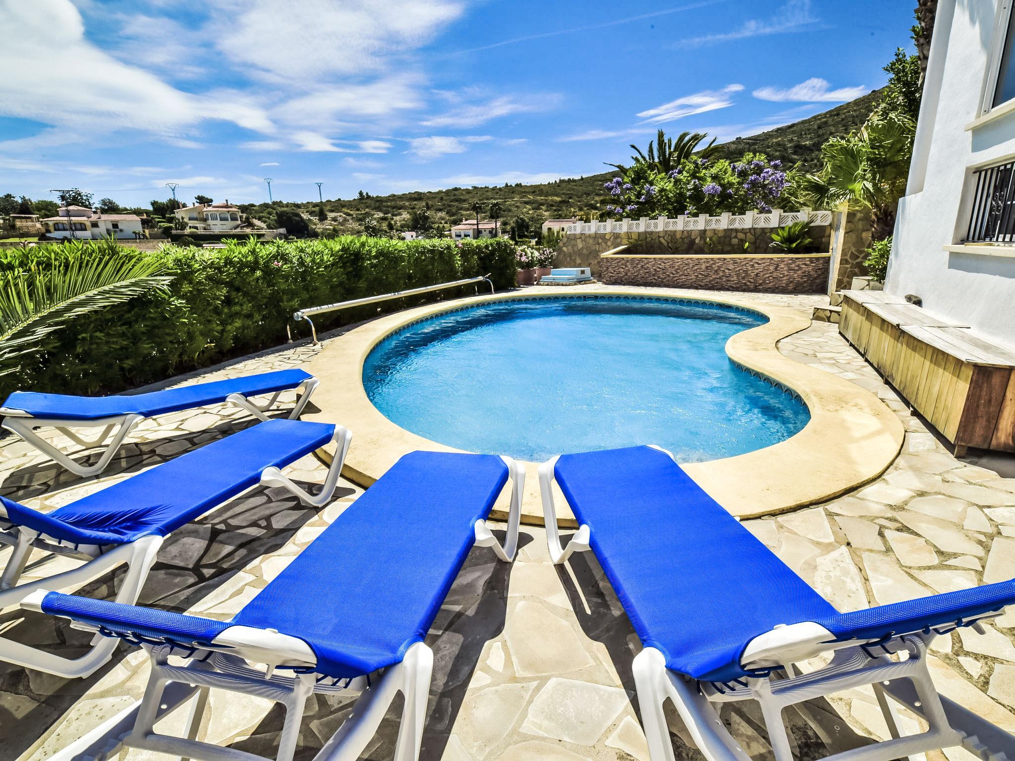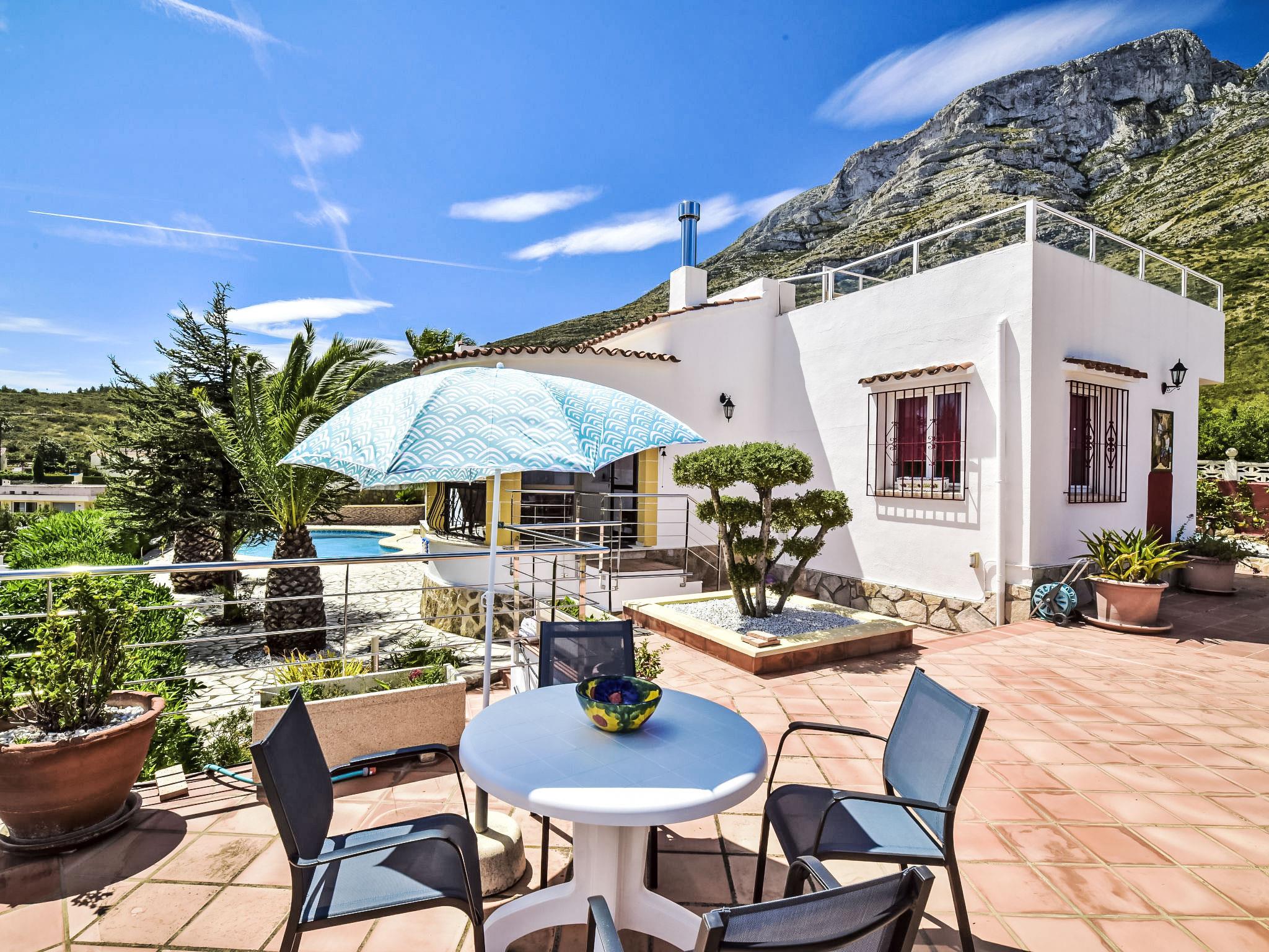Bellavista: Beautiful, cosy house "Bellavista". In the resort 4.5 km from the centre of Dénia, 3 km from the sea, 3.9 km from the beach, in a cul-de-sac. Private: beautiful, well-kept garden with wildlife garden and trees, swimming pool kidney shaped (5 x 10 m, depth 1 - depth 180 cm, seasonal availability: 01.Jan. - 31.Dec.). Stepped path (17 steps) to the house. Parking, single garage. Supermarket 4 km, restaurant 2 km, bar 1.5 km, bus stop 4.5 km, railway station 4.5 km, ferry 4.5 km, sandy beach 4.5 km. Sports harbour 4.5 km, marina 4.5 km, surf school 4.5 km, sailing school 4.5 km. Please note: not suitable for small children. The owner does not accept any youth groups.