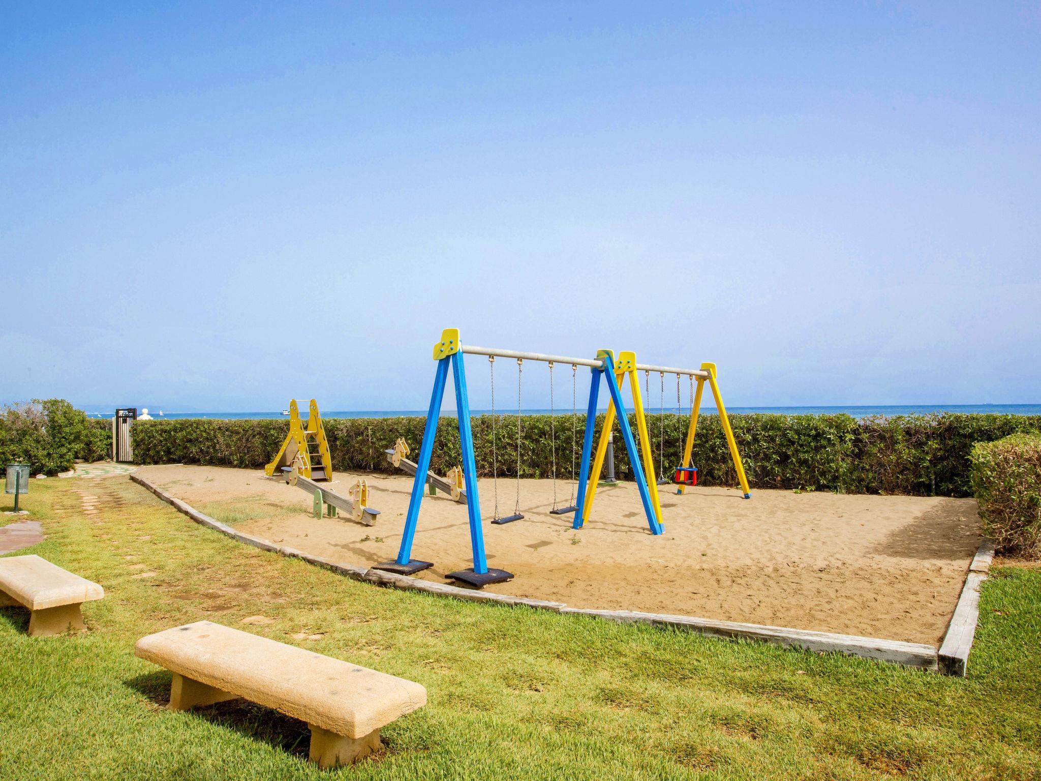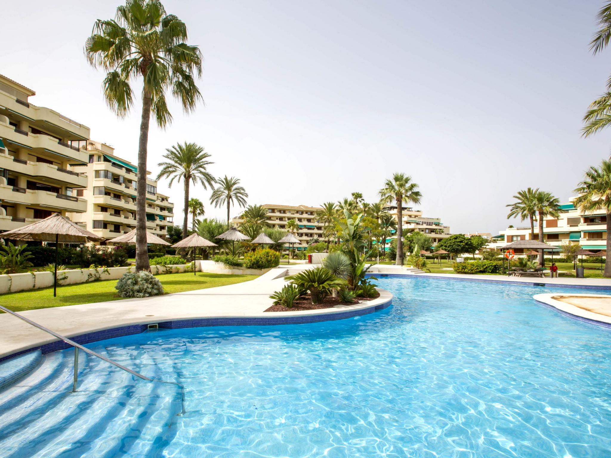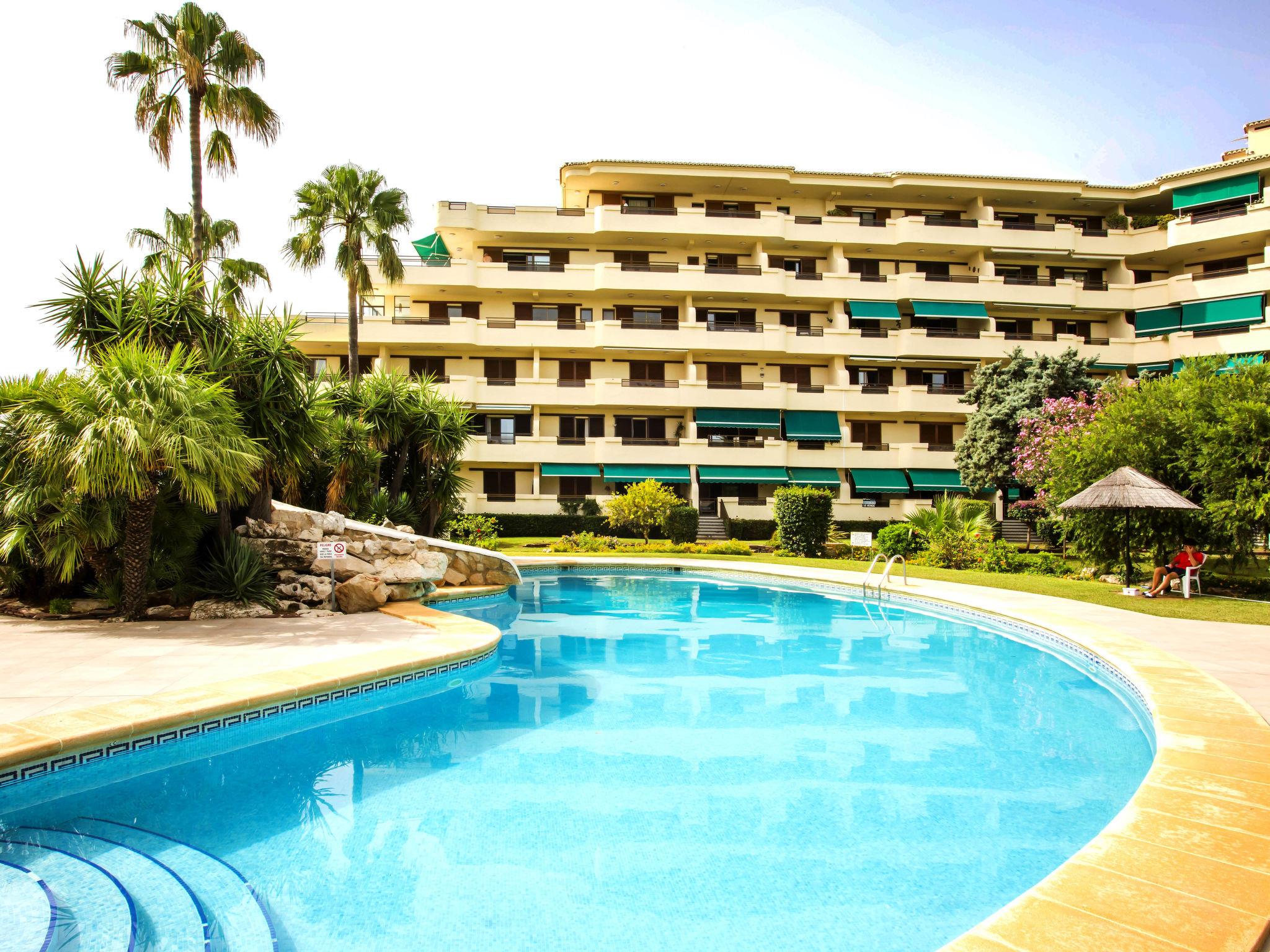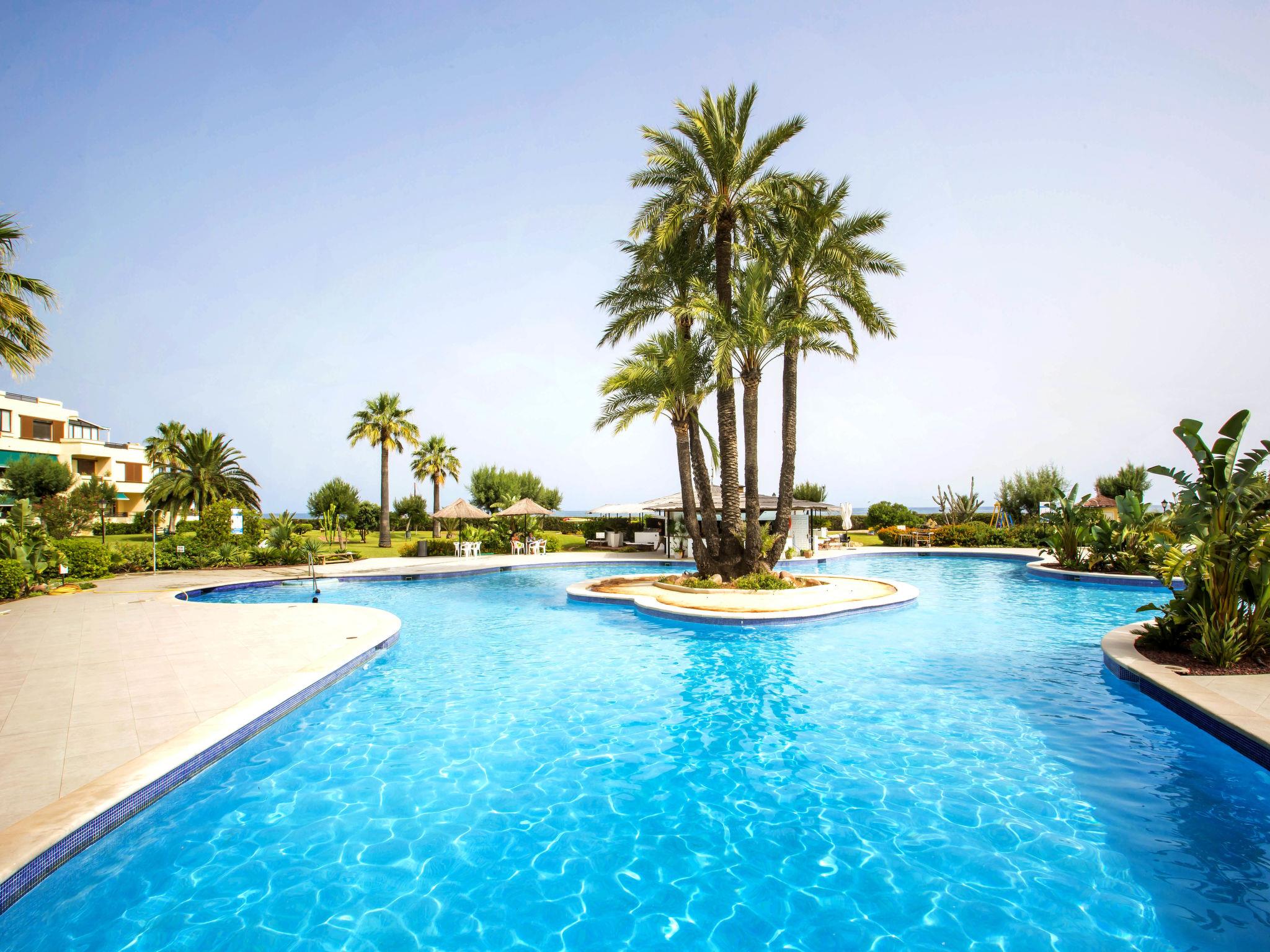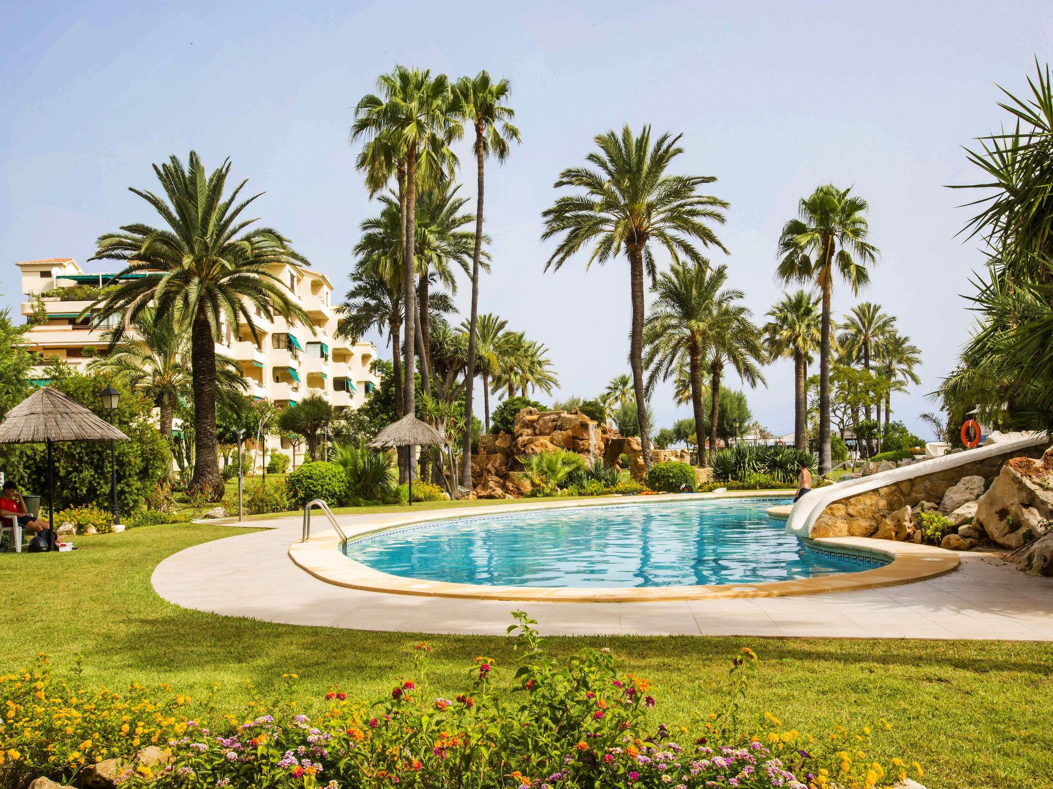 Large, cosy, simple apartment block "Playa Grande". 4 km from the centre of Dénia, 50 m from the sea, from the beach, direct access to the beach. For shared use: property 20'000 m2 (fenced), park with lawn and trees, beautiful garden to relax, 3 swimming pools (37 x 32 m, depth 110 - 180 cm, seasonal availability: 01.Jan. - 31.Dec.) with internal staircase. Unconventional pool shape. Children's pool, outdoor shower, poolhouse with WC, children's playground (slide, swing, sandbox). In the house: reception, restaurant, bar, lift. Shop 50 m, supermarket 180 m, restaurant, bar 20 m, bus stop 200 m, railway station 6.2 km, ferry 5.4 km, sandy beach 50 m. Sports harbour 5 km, marina 5 km, surf school 5 km, sailing school 5 km, tennis 3 km. Please note: suitable for families.