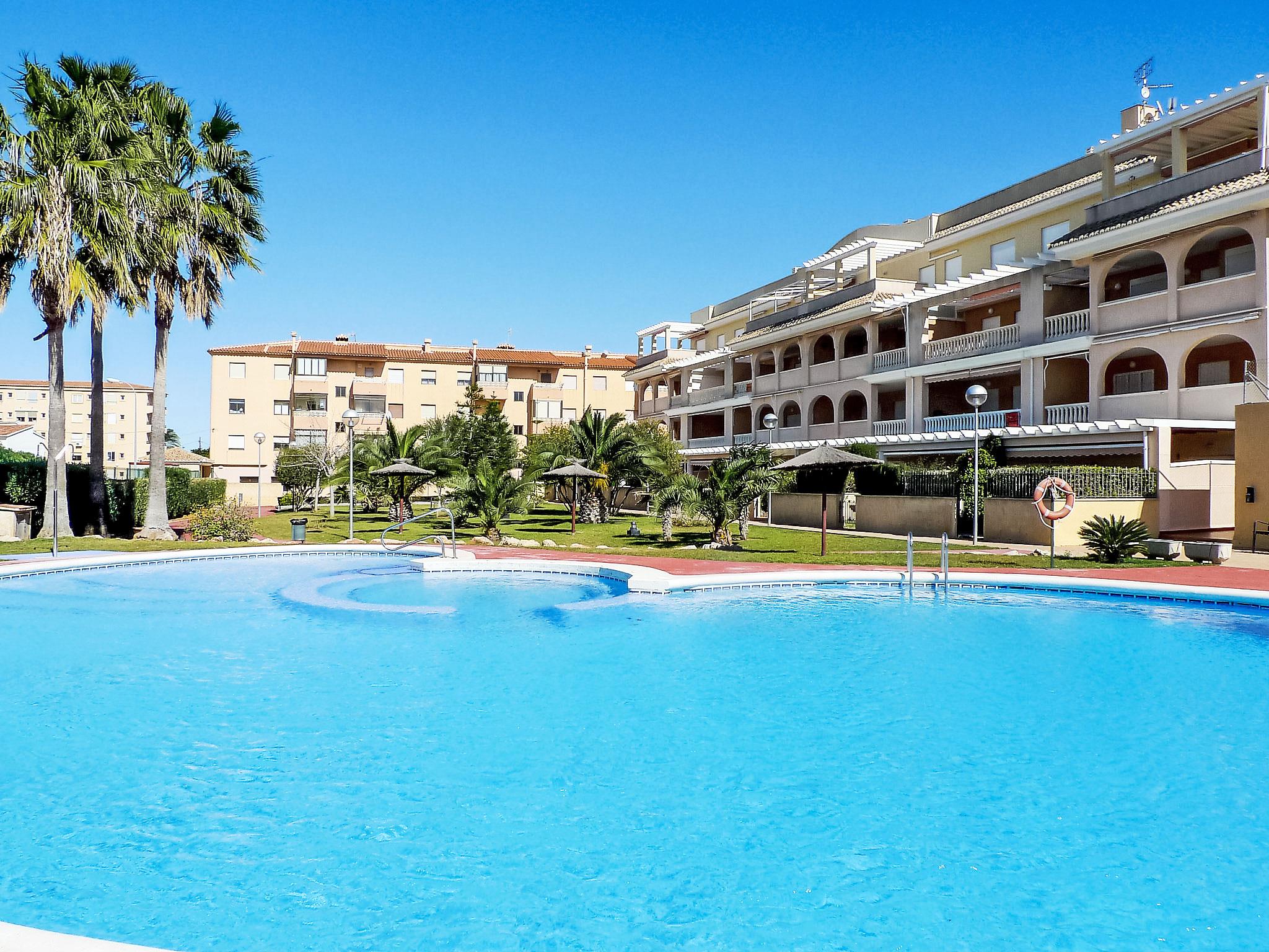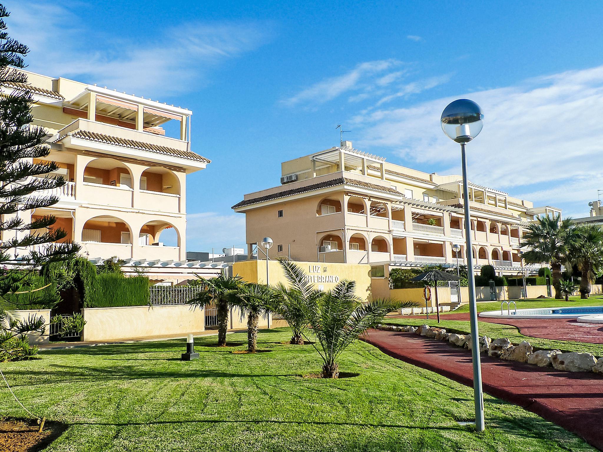 Beautiful, cosy apartment block "Luz del Mediterraneo", 3 storeys, built in 2001. 5 km from the centre of Dénia, in the district Les Marines, 200 m from the sea, 180 m from the beach, west facing position. For shared use: large, beautiful, well-kept garden (fenced) with lawn and plants, swimming pool (20 x 11 m, depth 230 - 80 cm, seasonal availability: 01.Jan. - 31.Dec.). Children's pool, outdoor shower, tennis. In the house: lift. Communal covered parking. Shop 300 m, supermarket 500 m, restaurant 250 m, café 250 m, bus stop 50 m, sandy beach "Els Molins" 250 m. Sports harbour 5 km, golf course (18 hole) 2 km. The owner does not accept any youth groups.