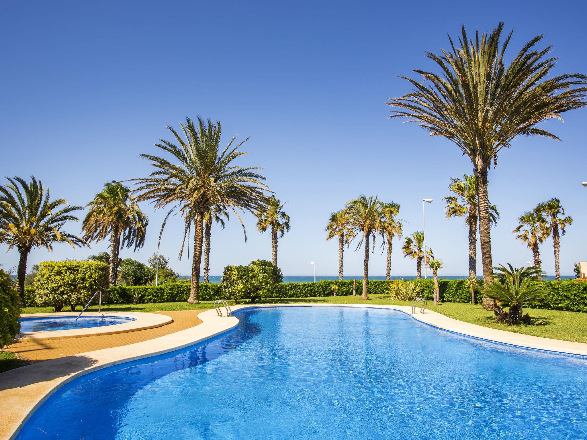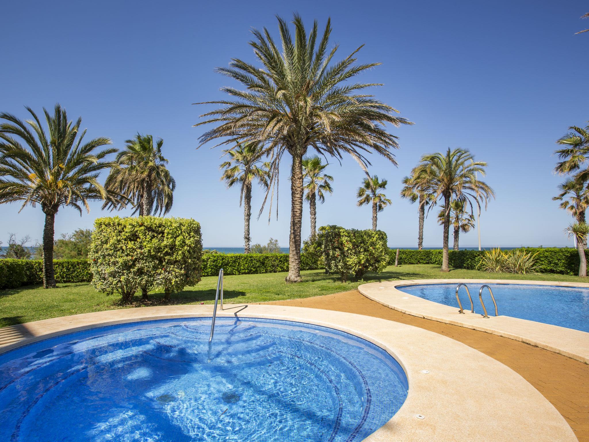 Very large, very beautiful, very comfortable apartment block "Atico Estrella del mar", 2 storeys. In the resort 9 km from the centre of Dénia, in a quiet, sunny position, from the sea, 10 m from the beach, direct access to the beach. For shared use: large, beautiful, well-kept garden with lawn and trees, 2 swimming pools (45 x 16 m, depth 80 - 210 cm, seasonal availability: 01.Jan. - 31.Dec.) with internal staircase. Children's pool, outdoor shower, children's playground (slide, swing), communal covered parking space n 27. Supermarket 450 m, restaurant 200 m, bus stop 250 m, railway station 10.5 km, sandy beach "Les Deveses" 60 m pebble beach "Playa de la Almadraba" 10 m. The owner does not accept any youth groups.
