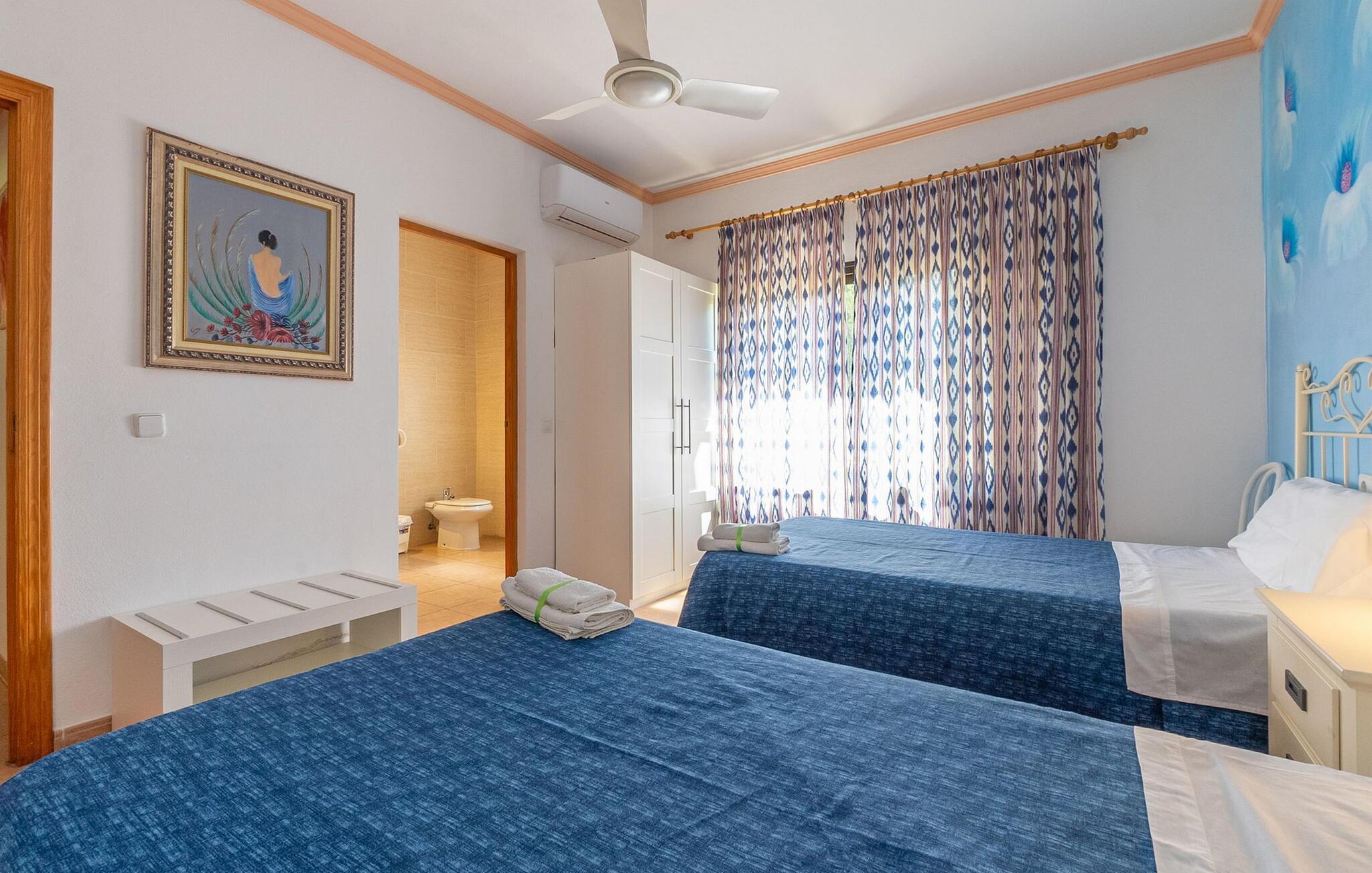 Interiøret er perfekt for flere par eller opptil tre familier, avhengig av hvor mange som bor her. Alle fellesområdene har nok plass til et større antall personer. Stuen er innredet med flere lyse sofaer, og her er det nok plass til at alle kan se en film sammen om kvelden. Og ved det store bordet i den åpne spisestuen finner alle sin favorittplass. Det separate kjøkkenet ved siden av tilbyr akkurat den bekvemmeligheten du trenger for å gjøre selvhusholdningsalternativet morsomt for alle involverte. Her kan man tilberede rettene ved det praktisk plasserte kjøkkenbordet. Den direkte utgangen til hagen og den karibisk-inspirerte bassengterrassen er spesielt attraktiv. Soverommene byr også på den perfekte komforten: Alle rommene har aircondition og eget bad, noe som er spesielt praktisk hvis man reiser i en stor gruppe. Det er fem individuelt innredede soverom, hvorav tre av dem er utstyrt med to enkeltsenger eller en 1,50 meter bred dobbeltseng. Begge tremannsrommene er ideelle som barnerom og har plass til seks barn, noe som tilsvarer seks voksne i dobbeltrommene. Mot et pristillegg kan du også bestille to ekstra barnesenger, noe som gir deg full fleksibilitet når det gjelder å organisere romoppsettet for gruppen din.