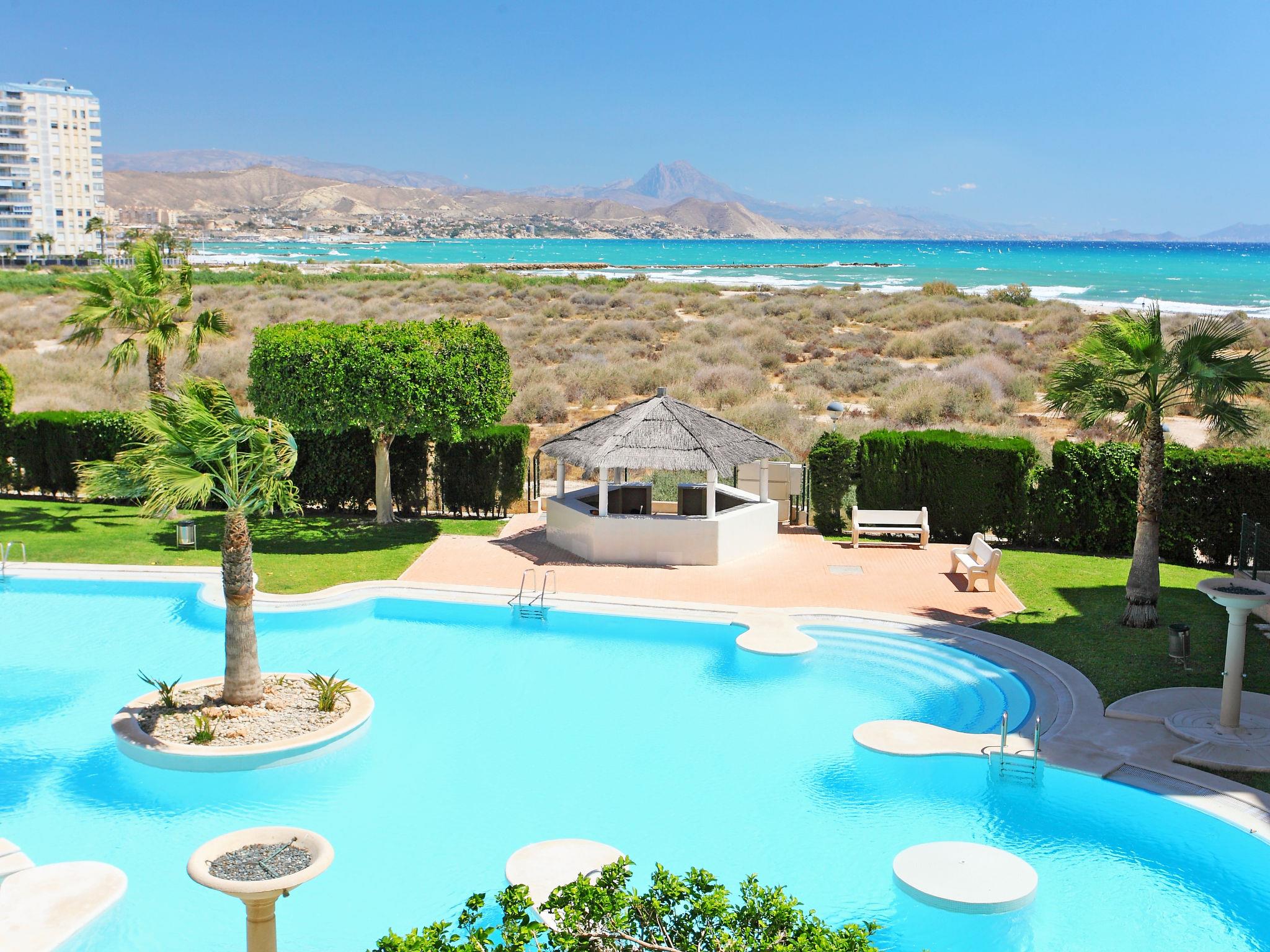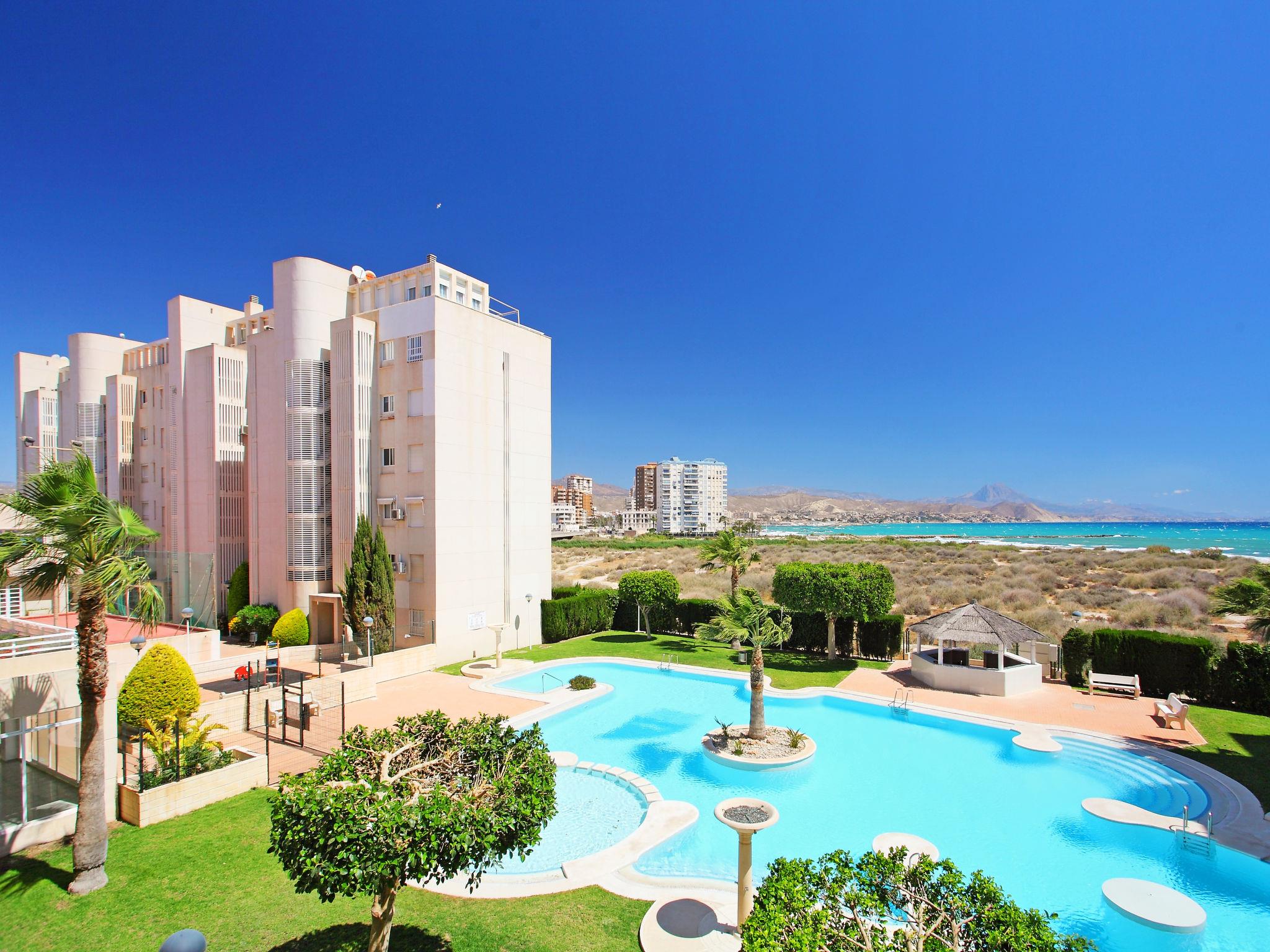 Large, child friendly apartment block "Cabo Mar", 5 storeys. In the resort 500 m from the centre of El Campello, in a quiet, sunny position, 20 m from the sea, 300 m from the beach. For shared use: property (fenced), terraced garden with lawn and plants, swimming pool (12 x 7 m, depth 190 - 30 cm, seasonal availability: 01.Jan. - 31.Dec.) with internal staircase. Children's pool, outdoor shower, tennis (extra), children's playground. In the house: lift. Roofed, parking on the premises. Supermarket 500 m, bar 100 m, bus stop "Campello" 100 m, railway station "Campello" 500 m, sandy beach 300 m, shingle beach 50 m. Golf course (18 hole) 10 km. Nearby attractions: Aqualandia Benidorm 30 km, Alicante 12 km, Terra Mitica Banidorm 30 km, Aeropuerto Alicante 28 km, Elche 40 m, Murcia 95 m. Please note: baby equipment on request. The owner does not accept any youth groups. Neighbourhood highly sensitive to noise. Quietness and good behaviour expected.