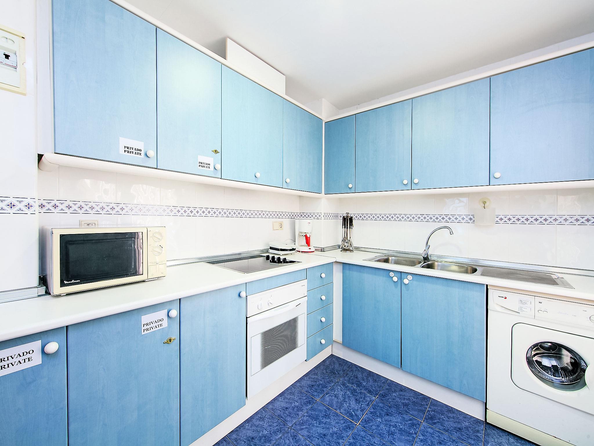 "Cabo Mar", 3-room apartment 60 m2 on 2nd floor, east facing position. Spacious and bright, practical and comfortable furnishings: living/dining room 20 m2 with digital TV and electric heating. Exit to the terrace. 1 room 8 m2 with 1 french bed (150 cm, length 190 cm), bath/bidet/WC, electric heating and fan. 1 room 7 m2 with 1 pull-out bed (2 pers. 2 x 90 cm, length 190 cm), fan. Kitchen (oven, 4 ceramic glass hob hotplates, toaster, kettle, microwave, freezer, electric coffee machine). Shower/WC. Boiler (100 litres). Terrace 6 m2. Terrace furniture. Very beautiful view of the sea, the swimming pool and the garden. Facilities: washing machine, iron. Parking space n 79, height 200 cm, width 500 cm. EGVT-593-A. VT-438729-A // Reg. Nr.: ESFCTU00000305600033638700000000000000000VT-438729-A6