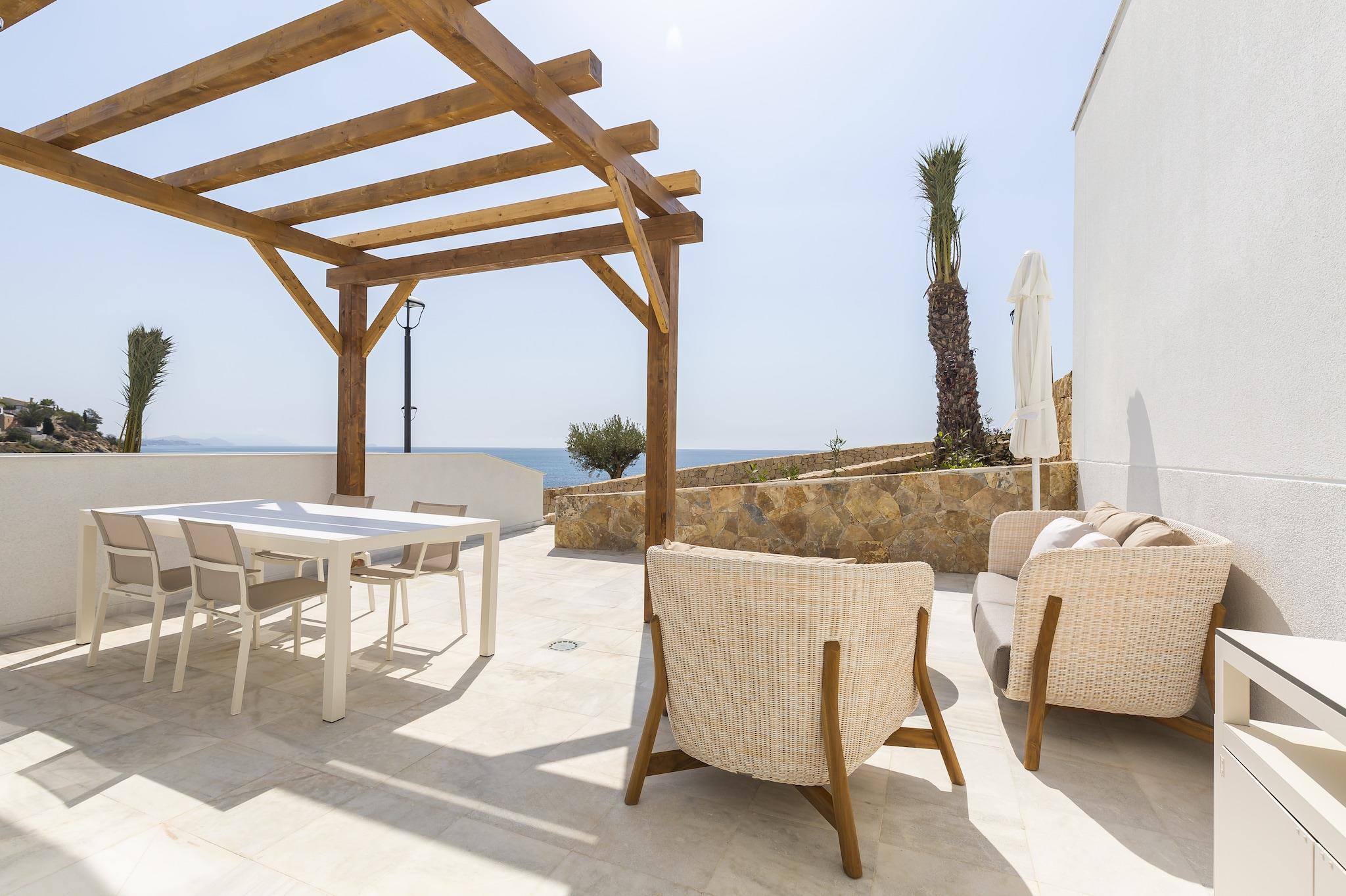 Første etasje: (Stue(dobbel sovesofa(140 x 200 cm), TV(flatskjerm, satellitt), spisebord), åpent kjøkken(komfyr med kokeplater(elektrisk), kaffetrakter(kopper), mikrobølgeovn, oppvaskmaskin, kjøleskap), Sovrum med badrum(Dobbeltseng eller 2 enkeltsenger, badekar eller dusj, håndvask, toalett), terrasse) oppvarming, klimaanlegg, hagemøbler, parkering, svømmebasseng(deles med andre gjester, oppvarmet)