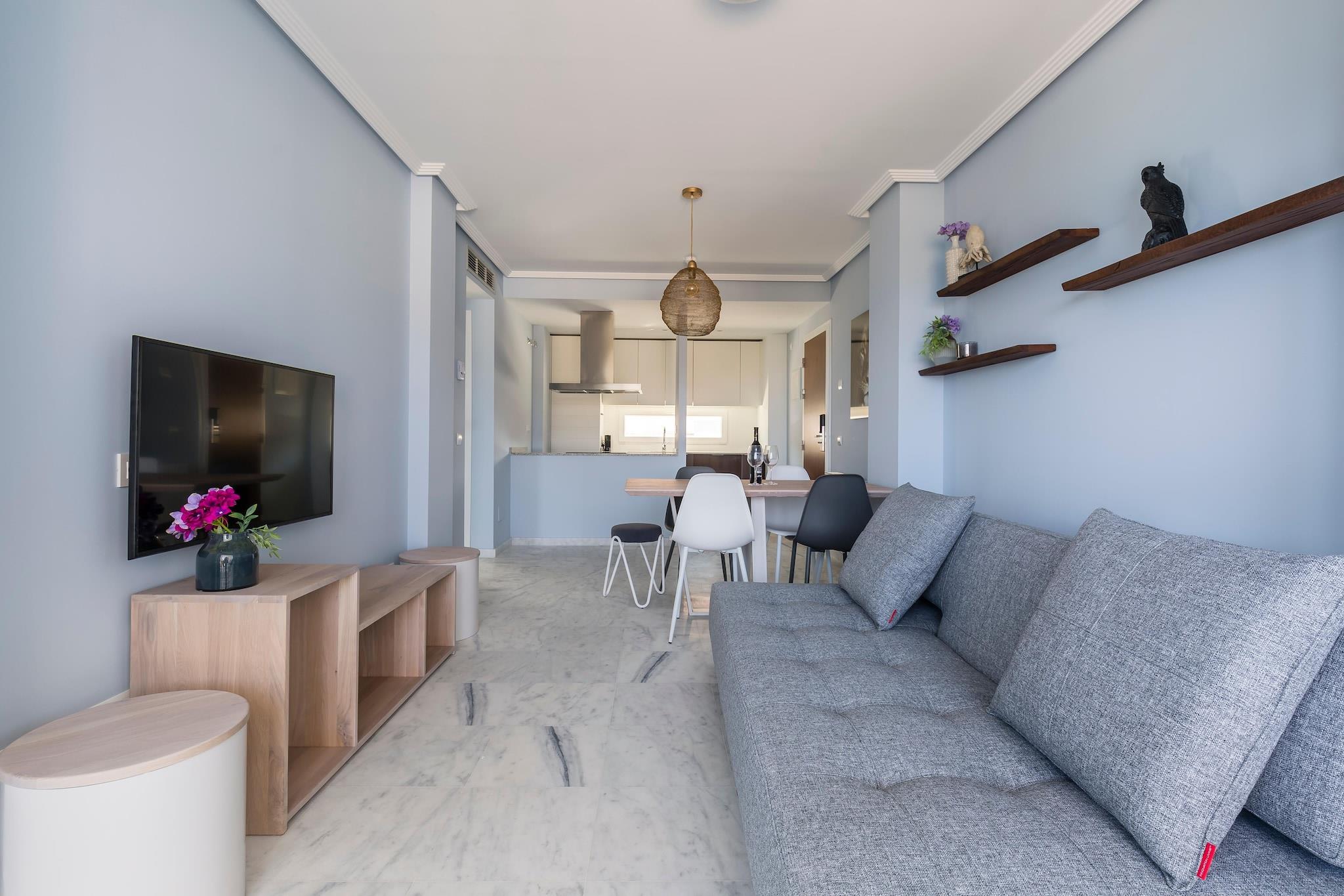 Denne luksusleiligheten på Costa Blanca tilbyr en blanding av moderne eleganse og middelhavssjarm. Stuen med åpen planløsning har marmorgulv og smakfull innredning, og skaper en rolig atmosfære. Gå gjennom terrassedører til en møblert terrasse med delvis utsikt over Middelhavet, perfekt for utendørs servering. Leiligheten har klimaanlegg, noe som sikrer komfort på varme dager, og har et velutstyrt kjøkken med stekeovn, oppvaskmaskin og vaskemaskin. Gjestene kan nyte tilgang til et felles oppvarmet svømmebasseng og underjordisk parkering for ekstra bekvemmelighet. El Campello har 23 kilometer kystlinje, og tilbyr en rekke strender og bukter å utforske. Playa Muchavista er kjent for sin gylne sand og klare vann, ideelt for bading og soling. For en mer tilbaketrukket opplevelse, besøk Cala La Nuza eller Platja de l'Almadrava. Historieentusiaster kan utforske Illeta dels Banyets, et arkeologisk sted med romerske og mauriske ruiner. Byen er også vertskap for maurernes og kristne festivalen, en livlig feiring av lokal historie og kultur. El Campello tilbyr en mangfoldig kulinarisk scene, med restauranter som serverer tradisjonell spansk og middelhavsmat. La Vaquería Mediterránea er kjent for sine autentiske retter og innbydende atmosfære. For en matopplevelse ved stranden tilbyr Xaloc Lounge Restaurant praktfull havutsikt og en meny med lokale spesialiteter. Casa Mar tilbyr koselige omgivelser med et utvalg av tapas og en omfattende vinliste.
