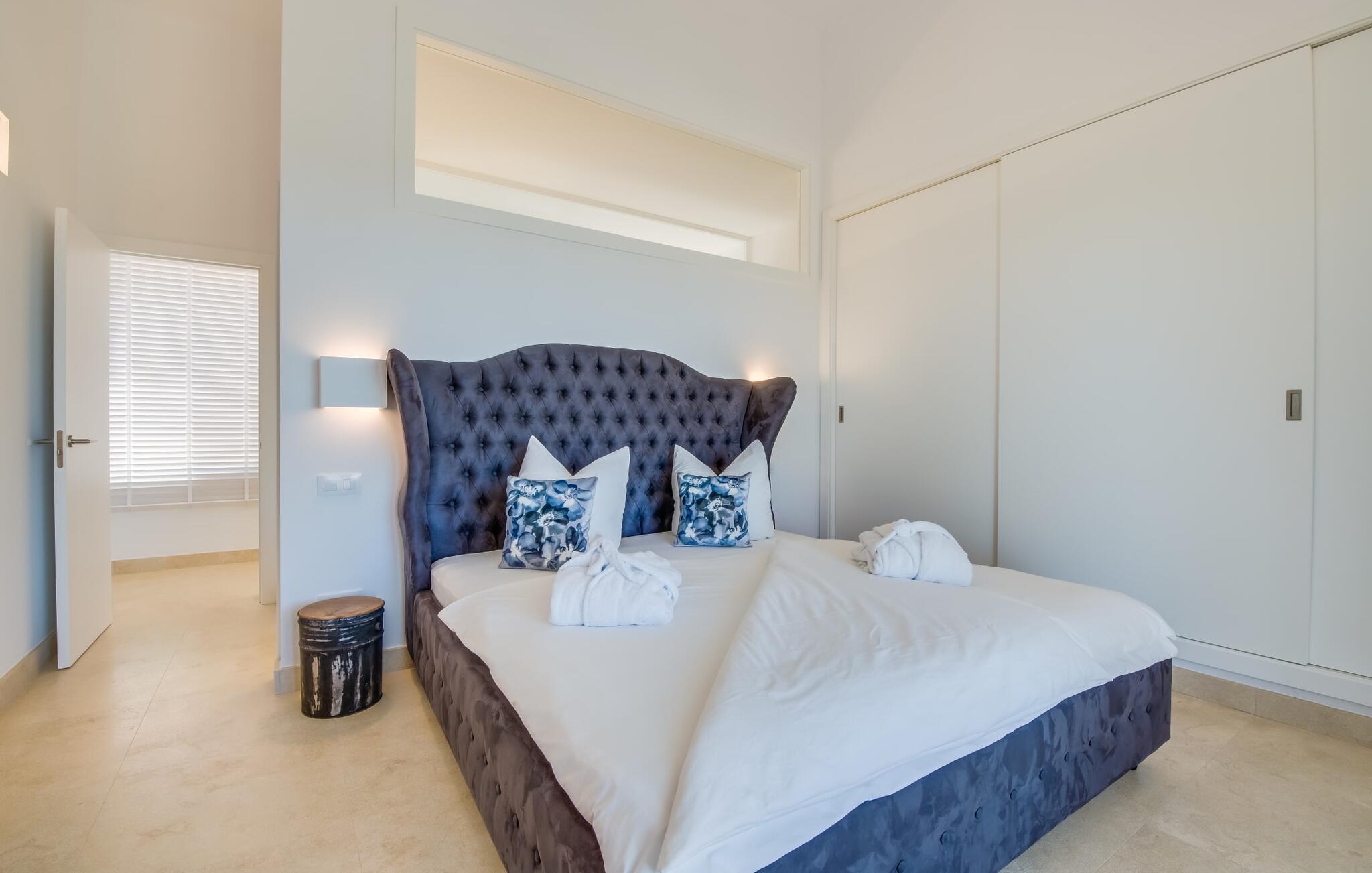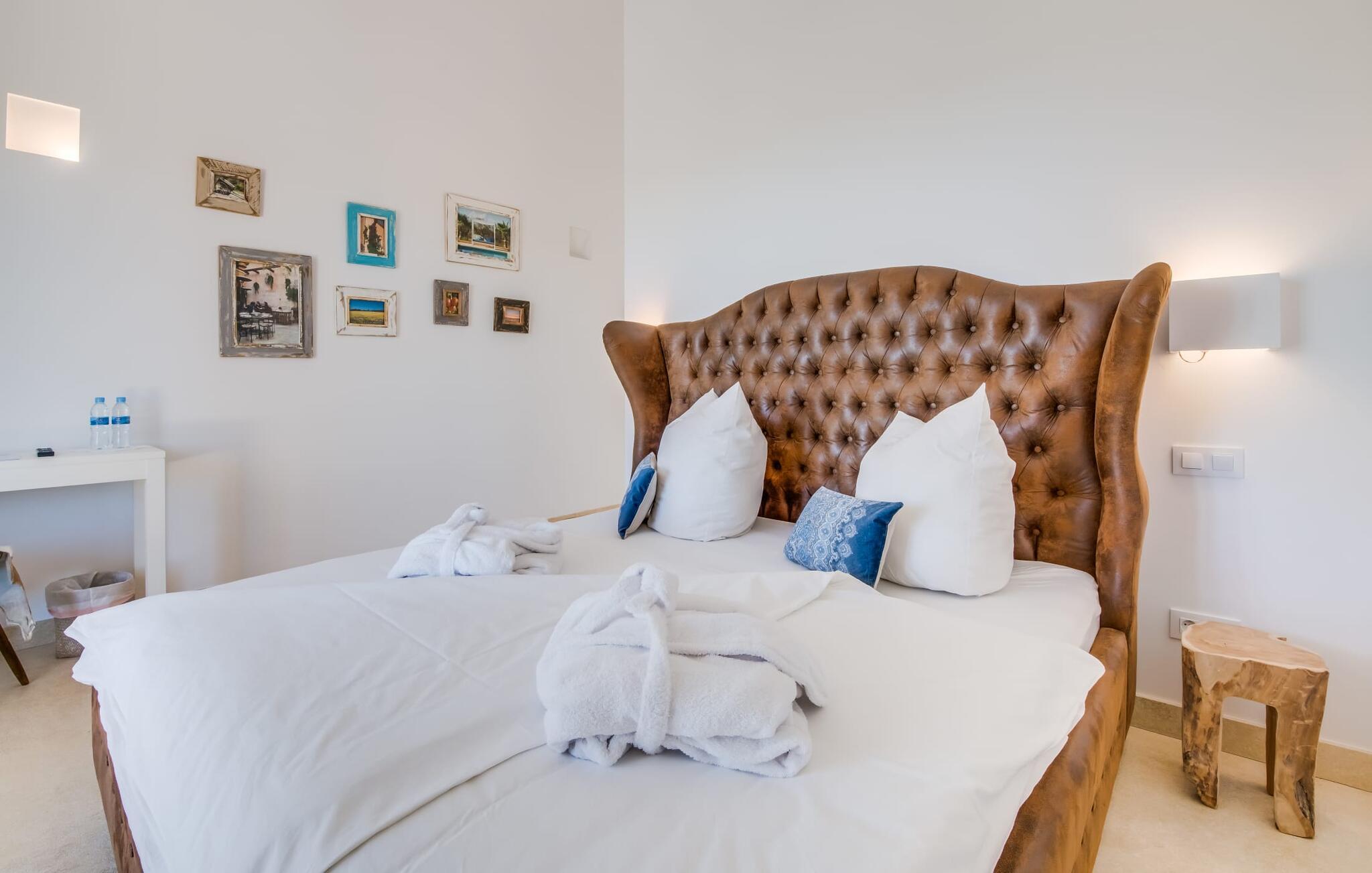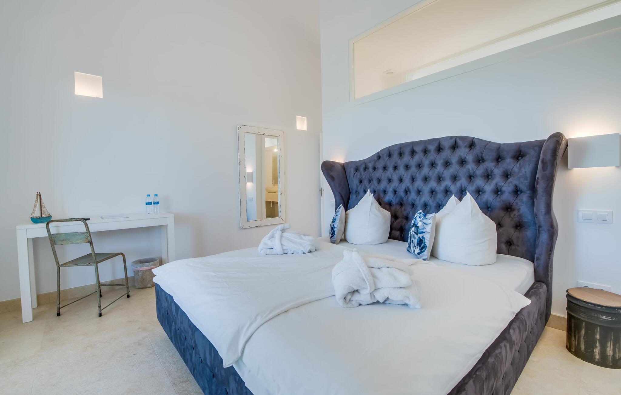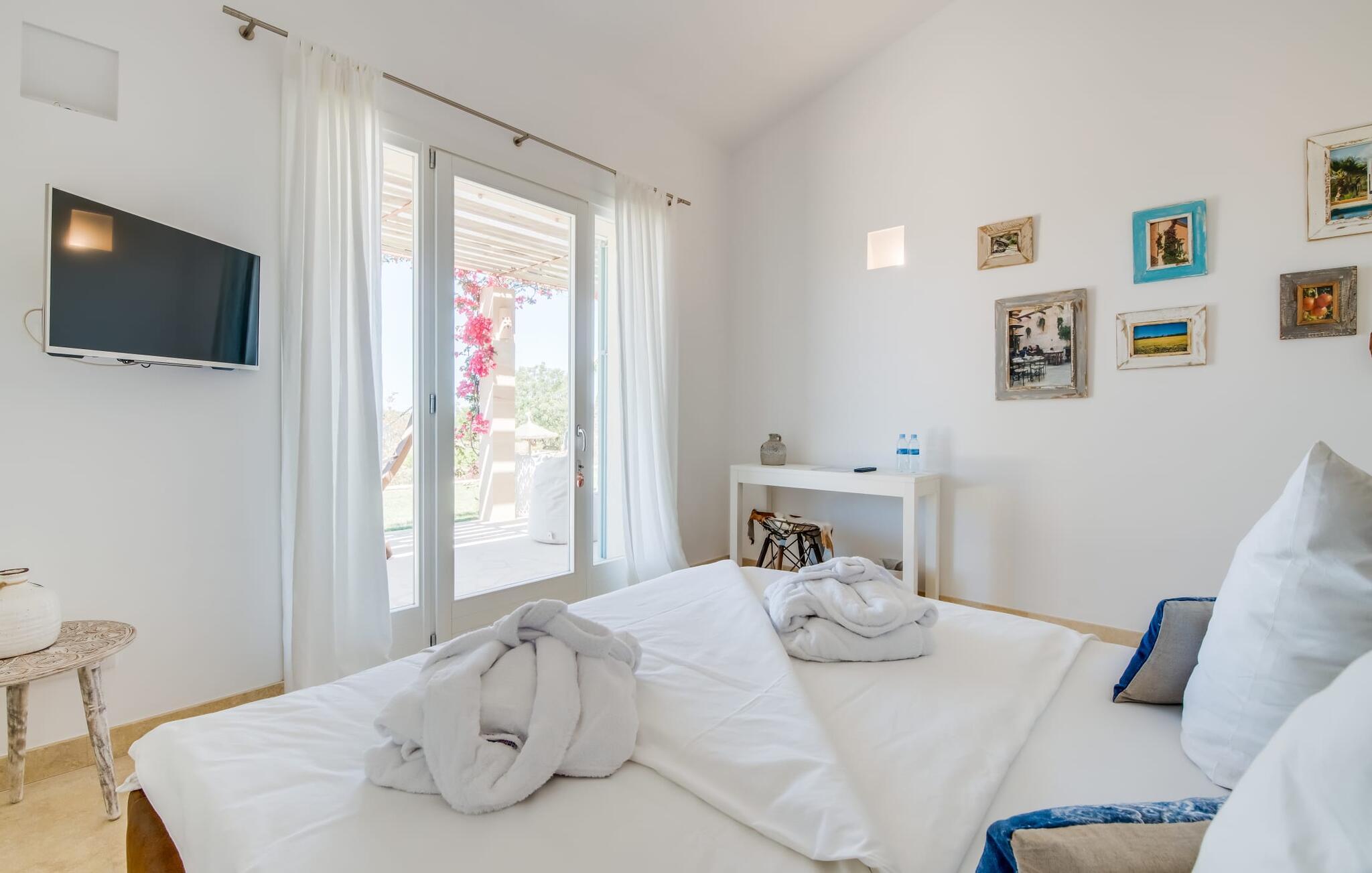 "El Idilio" fokuserer også på lys, luft og fri plass i interiøret! Fincaen er puristisk og elegant innredet med uvanlige gjenstander og tilbehør, og er en stilfull ferieoase for å utforske den sørlige delen av Mallorca og det ideelle stedet for å lade kropp og sjel eller utvikle ideer i et kreativt team. I første etasje er det tre soverom med dobbeltseng (sengestørrelse 1,80 x 2 meter) med eget bad, TV og tilgang til terrassen. Takmonterte vifter sørger for en forfriskende bris når det trengs, og det samme gjør klimaanlegget og gulvvarmen i hele huset og i alle soverommene. Et gjestetoalett og vaskerom ligger også i første etasje, i likhet med det sentrale, todelte oppholdsrommet: en maritim sofasurfing-sone her og en peisestue med en åpen, profesjonelt utstyrt kokeøy der. Utallige glassfronter kan åpnes mot hagen og bassenget, noe som bringer utendørsfølelsen inn i huset. I øverste etasje viser den vennlige tjeneren i livré deg gjerne veien - her venter et annet dobbeltrom med eget bad (også med klimaanlegg) og utsikt over havet og øya Cabrera fra takterrassen. Et Sonus-musikkanlegg sørger for den rette lyden til en sundowner, og et nettbrett er også tilgjengelig for å planlegge din neste utflukt