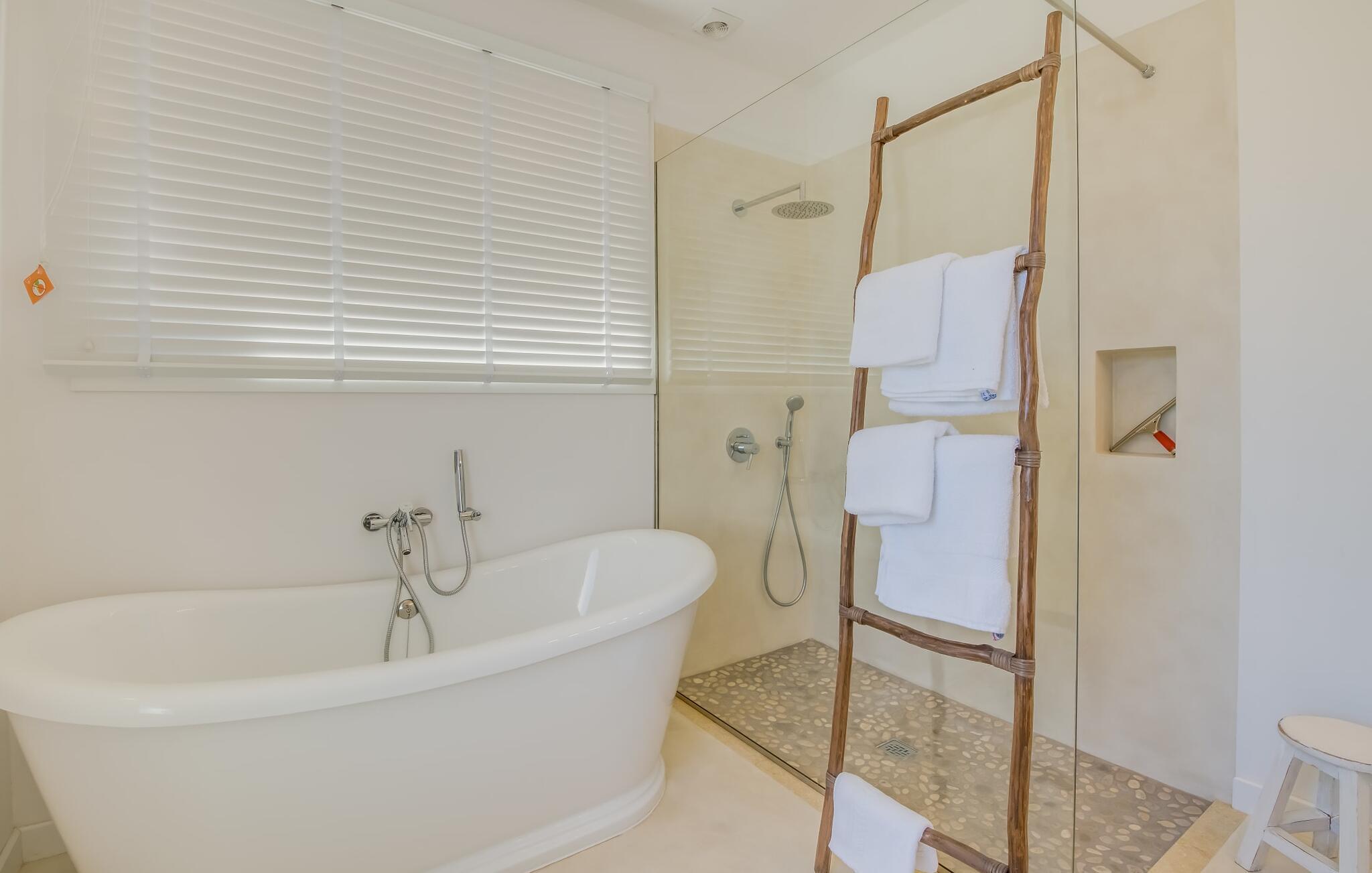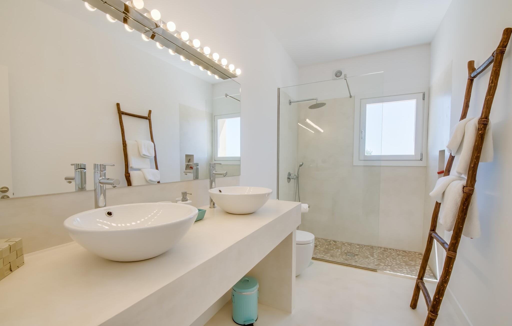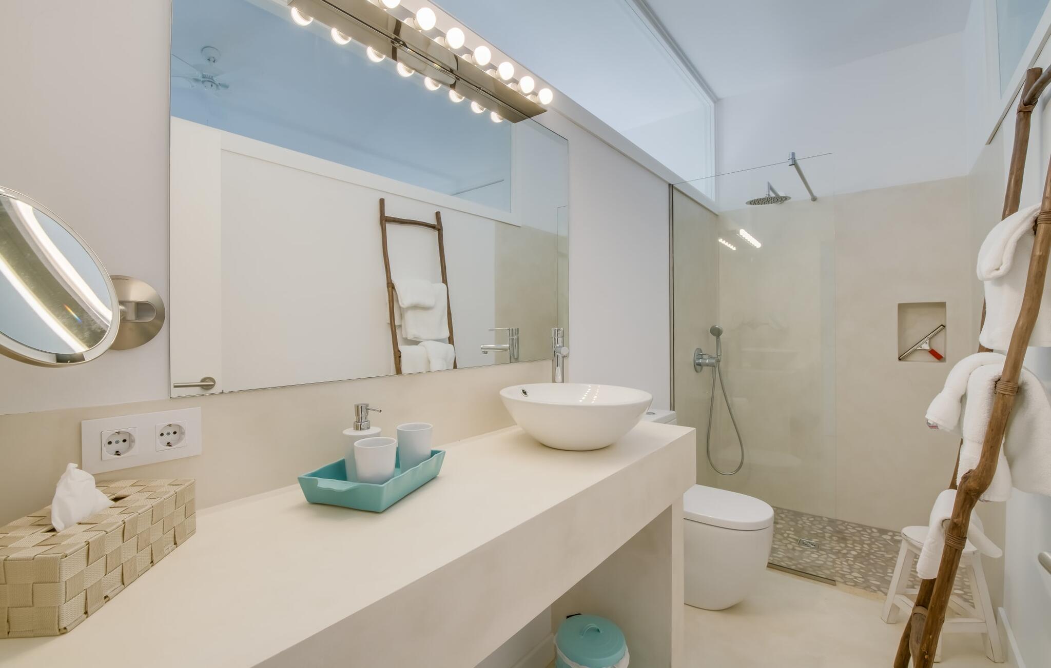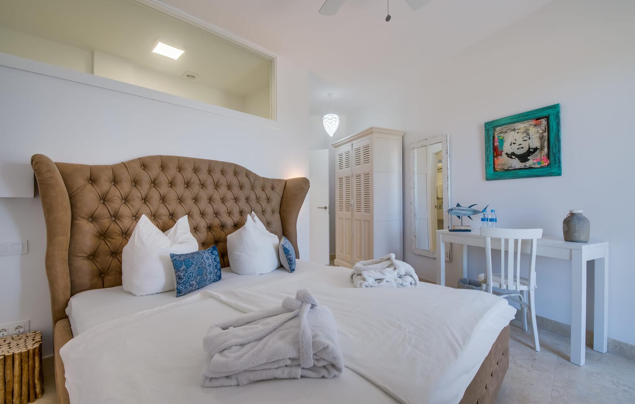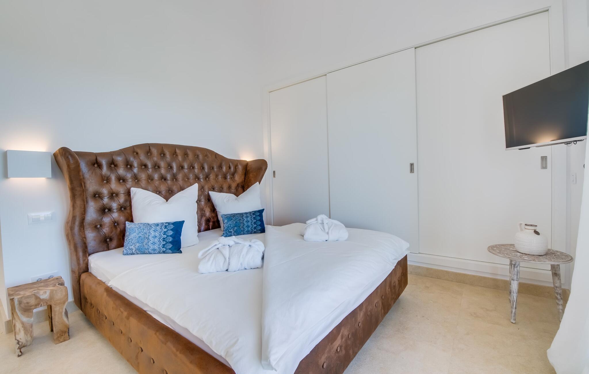 "El Idilio" fokuserer også på lys, luft og fri plass i interiøret! Fincaen er puristisk og elegant innredet med uvanlige gjenstander og tilbehør, og er en stilfull ferieoase for å utforske den sørlige delen av Mallorca og det ideelle stedet for å lade kropp og sjel eller utvikle ideer i et kreativt team. I første etasje er det tre soverom med dobbeltseng (sengestørrelse 1,80 x 2 meter) med eget bad, TV og tilgang til terrassen. Takmonterte vifter sørger for en forfriskende bris når det trengs, og det samme gjør klimaanlegget og gulvvarmen i hele huset og i alle soverommene. Et gjestetoalett og vaskerom ligger også i første etasje, i likhet med det sentrale, todelte oppholdsrommet: en maritim sofasurfing-sone her og en peisestue med en åpen, profesjonelt utstyrt kokeøy der. Utallige glassfronter kan åpnes mot hagen og bassenget, noe som bringer utendørsfølelsen inn i huset. I øverste etasje viser den vennlige tjeneren i livré deg gjerne veien - her venter et annet dobbeltrom med eget bad (også med klimaanlegg) og utsikt over havet og øya Cabrera fra takterrassen. Et Sonus-musikkanlegg sørger for den rette lyden til en sundowner, og et nettbrett er også tilgjengelig for å planlegge din neste utflukt