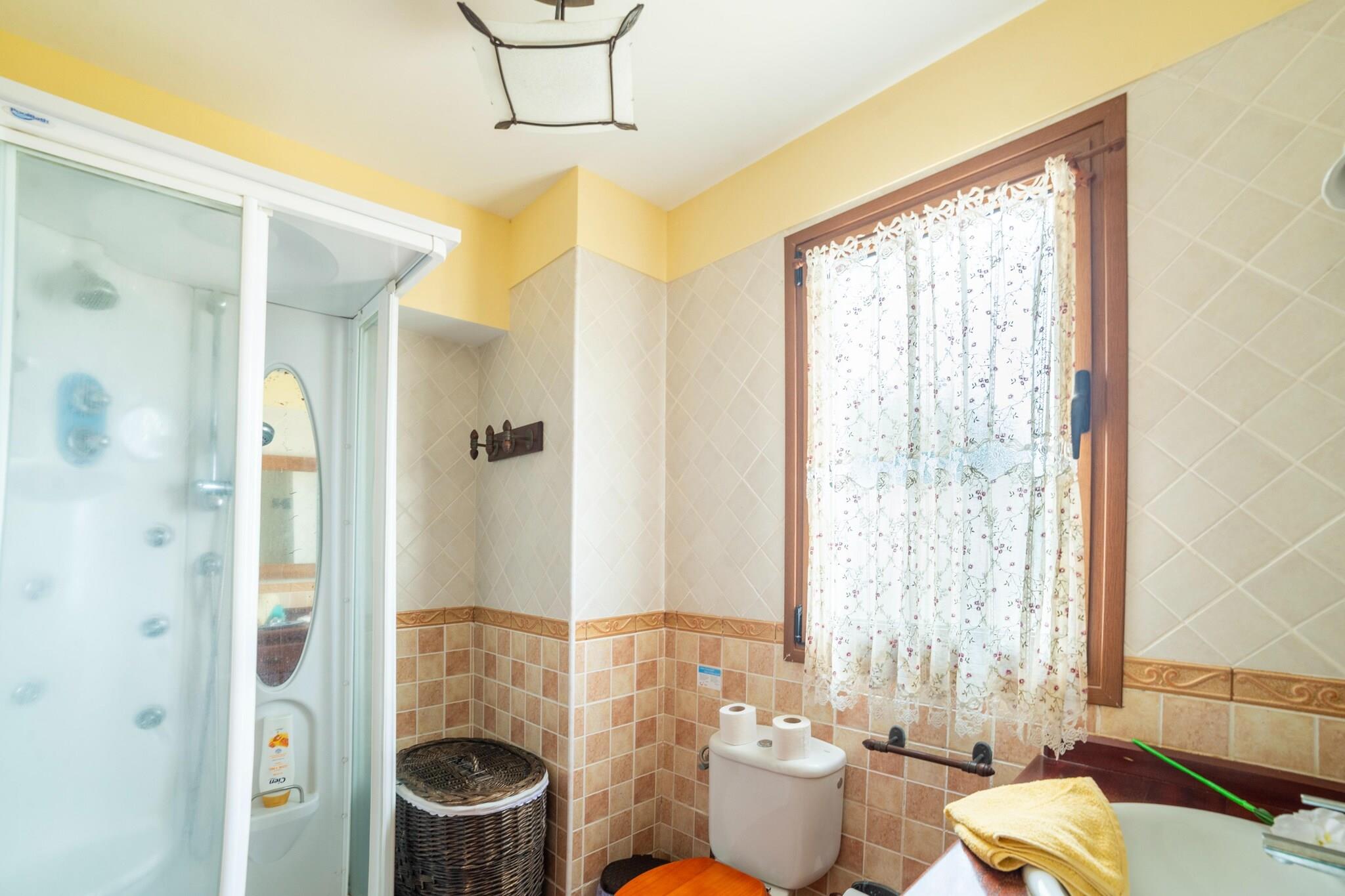 Første etasje: (Inngang(tilgjengelig fra utsiden), åpent kjøkken(komfyr med kokeplater, kjøkkenvifte, kaffetrakter, stekovn, mikrobølgeovn, oppvaskmaskin, kjøleskap med fryser, vaskemaskin), Stue/spisestue(TV(flatskjerm), spisebord, sittehjørne), soveværelse(enkeltseng, enkeltseng), bad(badekar med dusj, håndvask, toalett), terrasse) i 2. etasje: (soveværelse(dobbeltseng), soveværelse(dobbeltseng), bad(badekar med dusj, håndvask, toalett, bidet)) franske dører, terrasse, hage(privat), hagemøbler, grill, parkering, svømmebasseng(privat, utendørs, opened from Jan upto and including Dec), strykejern
