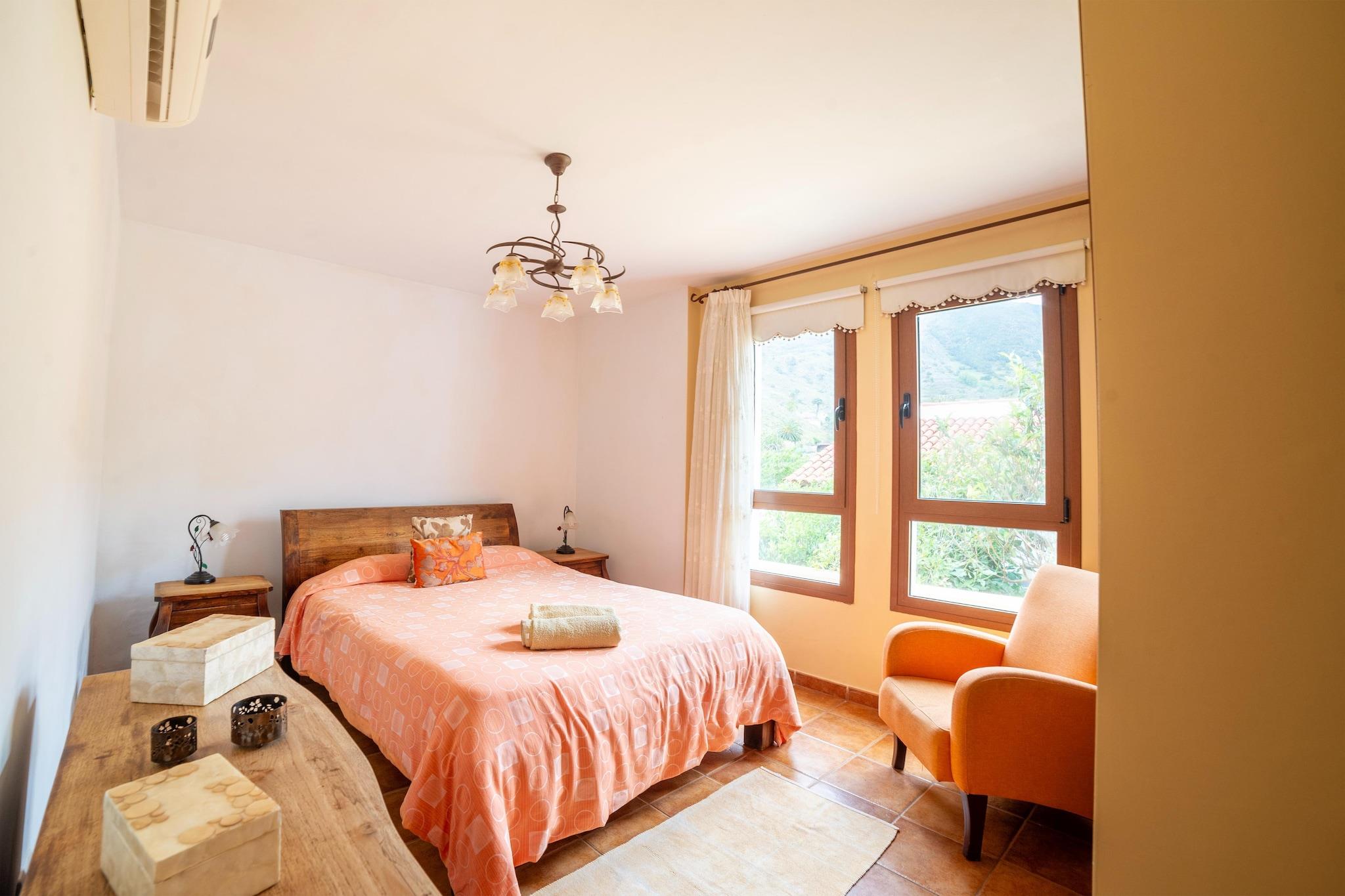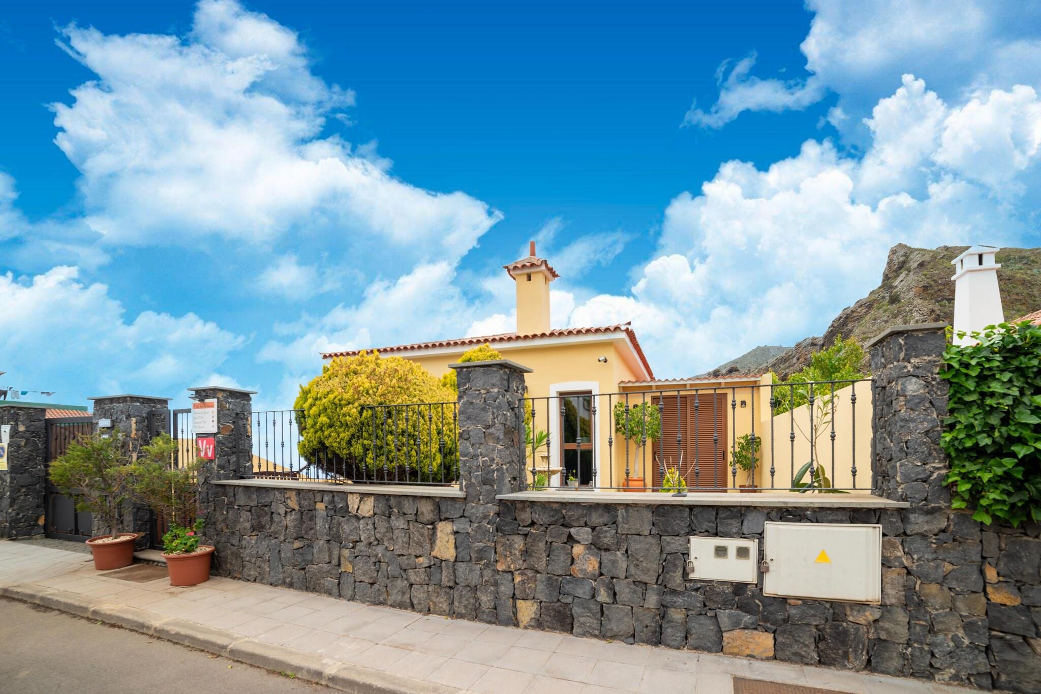 Denne ferievillaen ligger midt blant de frodige, grønne fjellene på nordvestlige Tenerife, og tilbyr et fristed med enestående ro. Fra det øyeblikket du går ut på terrassen, fengsler det majestetiske landskapet deg og inviterer deg til å slappe av og nyte skjønnheten som omgir deg. Når du ser ut over landskapet, smelter synet av havet i det fjerne sømløst sammen med det private bassenget, og skaper et fascinerende panorama som garantert vil fortrylle deg gjennom hele oppholdet. Til tross for den bortgjemte beliggenheten, har villaen en beleilig beliggenhet innen rekkevidde av lokale fasiliteter, inkludert butikker, restauranter og attraksjoner. Den sjarmerende byen Garachico, med sin historiske arkitektur og naturlige bassenger, ligger bare en kort kjøretur unna, mens den pulserende byen Puerto de la Cruz tilbyr et vell av kulturelle opplevelser og underholdningsmuligheter. Innvendig har villaen tre romslige dobbeltrom og to bad, noe som gir god plass til at du og dine kjære kan slappe av i komfort. For de som elsker å underholde, gir det private bassenget og grillområdet den perfekte rammen for avslappende sammenkomster og minneverdige øyeblikk med familie og venner. Enten du slapper av ved bassengkanten eller nyter et måltid under stjernene, er hvert øyeblikk her forutbestemt til å bli verdsatt. Et tillegg på EURO30 per natt per gjest må betales av gjesten til i henhold til fakturaen/leieavtalen som er delt.