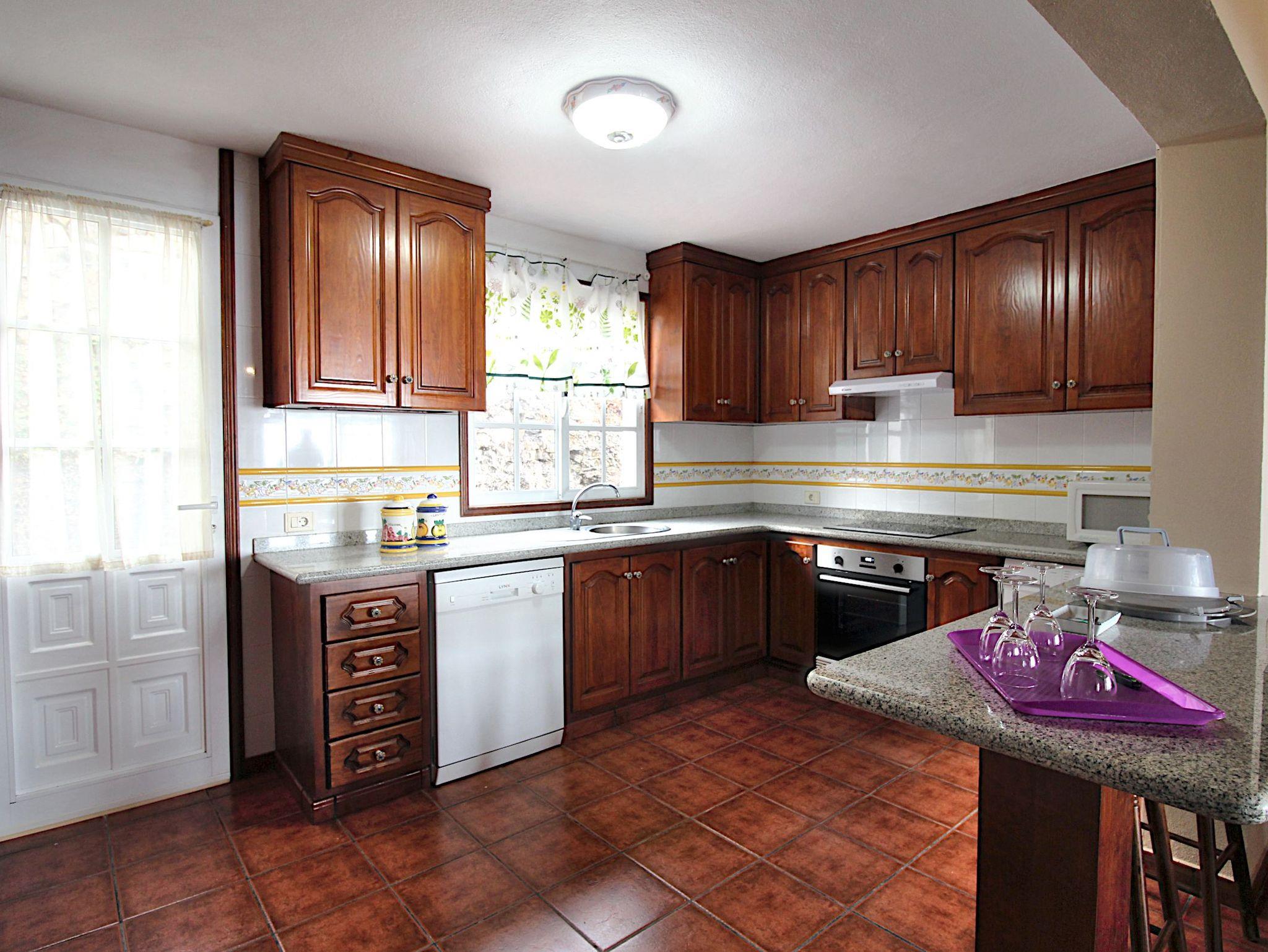 Die Küche schließt direkt an den Wohnbereich an. Von der Küche gelangt man durch eine Tür zur hinteren Terasse, wo sich auch eine Grillmöglichkeit befindet.