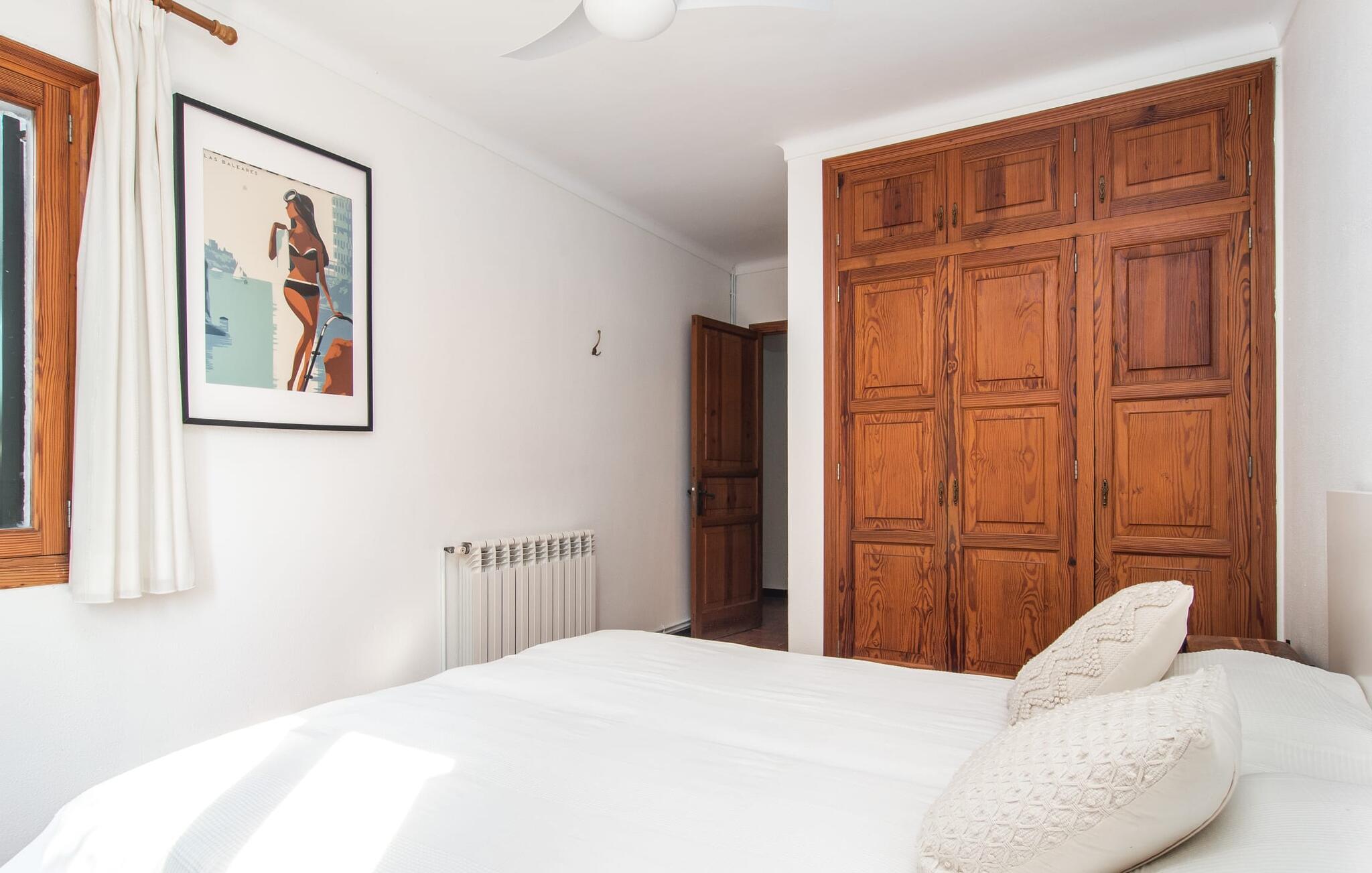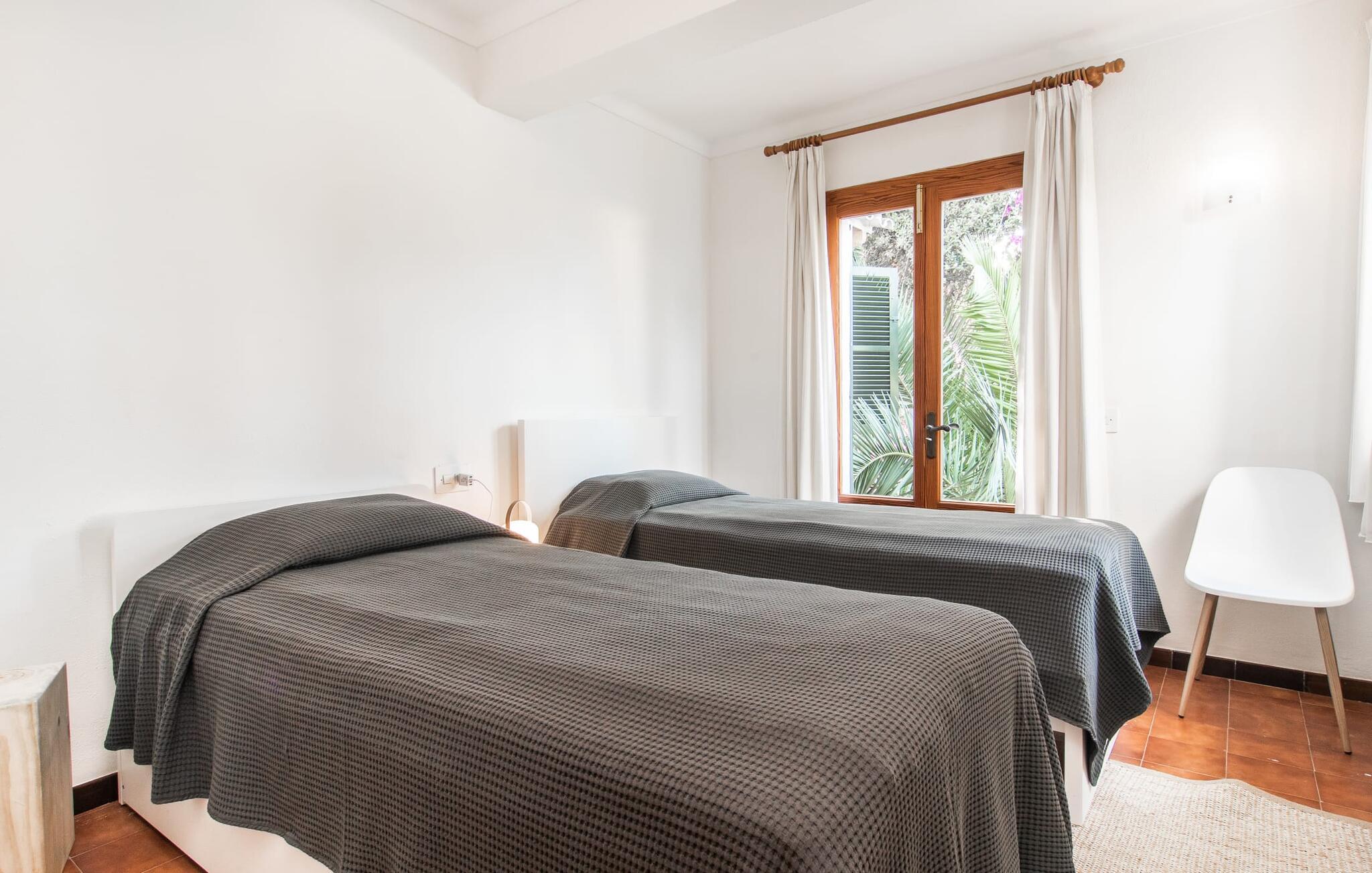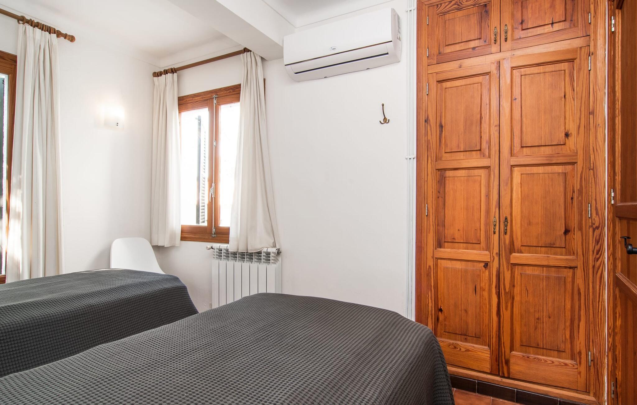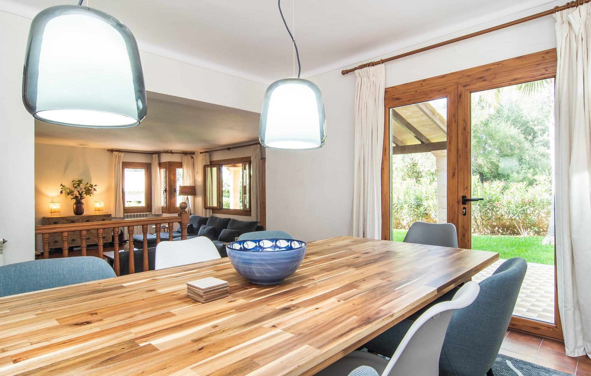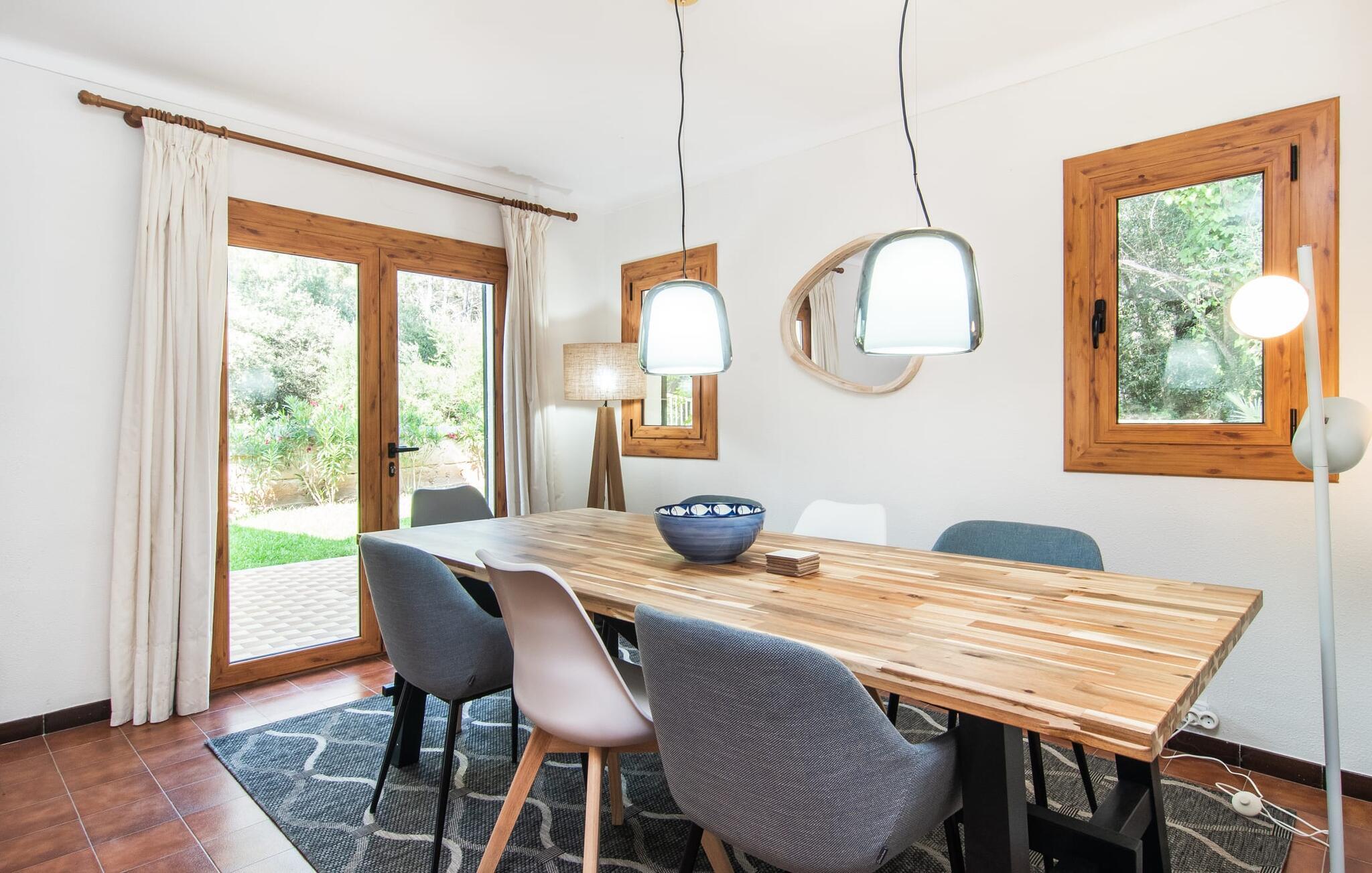 Interiøret i feriehuset har en god romfordeling og romslige rom med mye naturlig lys. Stuen er møblert med en koselig sofa og moderne sitteplasser. Sjarmen fra 1970-tallet er bevisst bevart her og skaper en koselig atmosfære. To trappetrinn opp ligger en lys og vennlig spisestue med tilgang til et romslig, fullt utstyrt kjøkken med en annen spiseplass. Et annet stort rom, som er egnet som spisestue, har utgang til terrassen. De tre doble soverommene er svært romslige og utstyrt med garderober og klimaanlegg. Takket være skodder kan de mørklegges helt for å nyte avslappende siestaer i den varme årstiden. Ett av soverommene har eget bad. Det er også et separat bad med dusj og et vaskerom i første etasje. Villaen ligger i et velholdt boligområde på Victòria-halvøya nordøst på Mallorca. To barnevennlige strender ligger henholdsvis 3 og 5 minutter unna med bil. De kan også lett nås til fots på 15 minutter. Middelalderbyen Alcúdia med gode shoppingmuligheter ligger 4 km unna. Den lange sandstranden i Alcúdiabukten ligger en 10-minutters kjøretur unna.