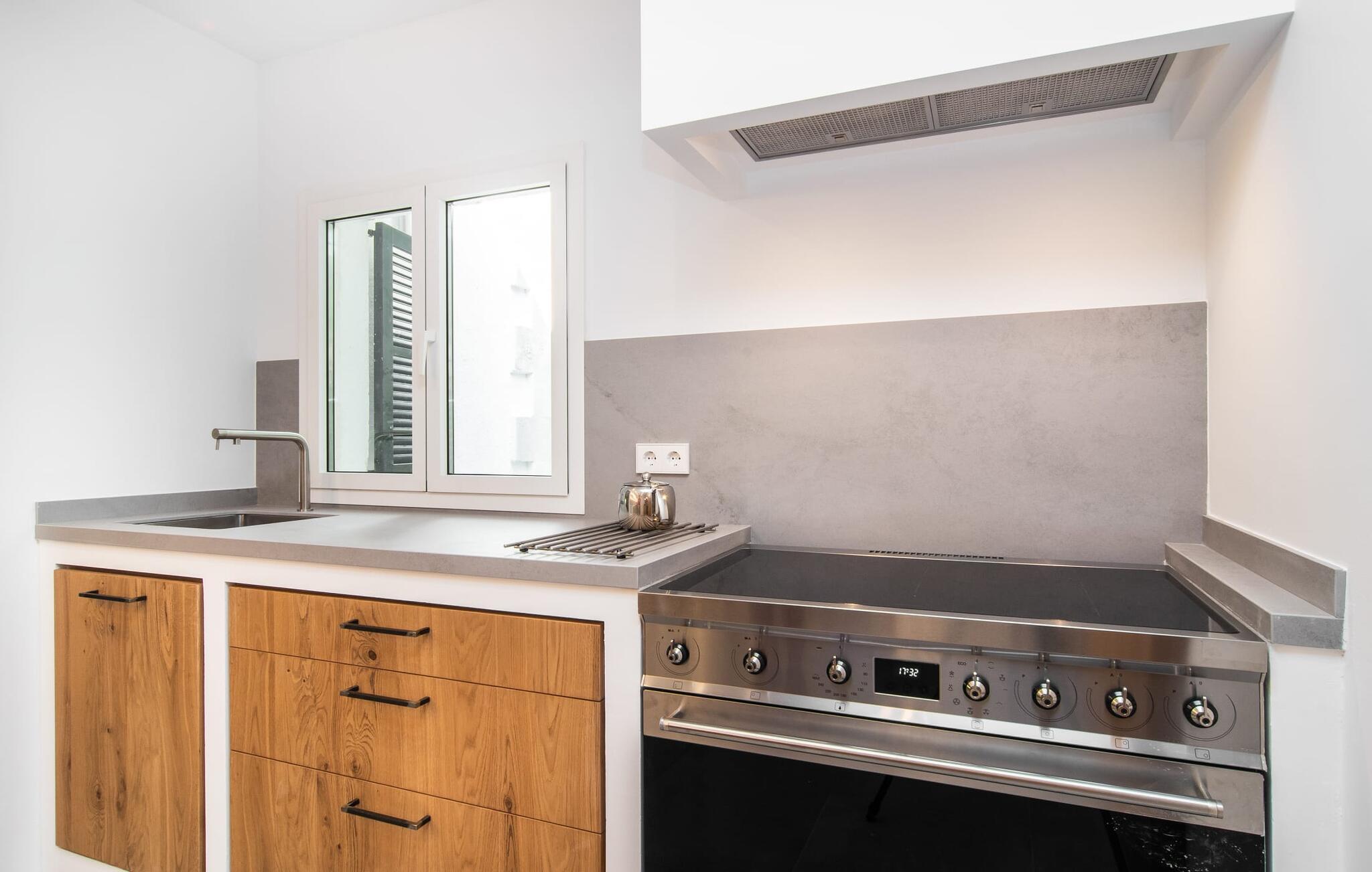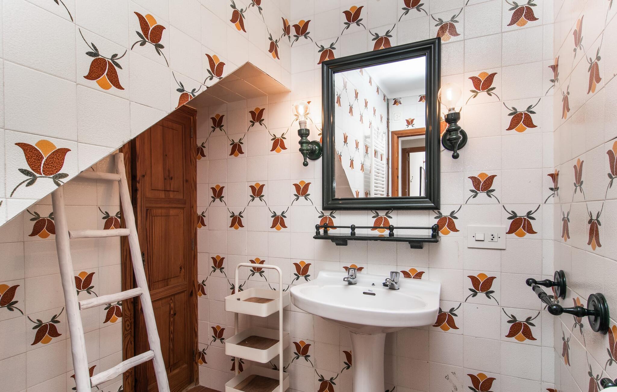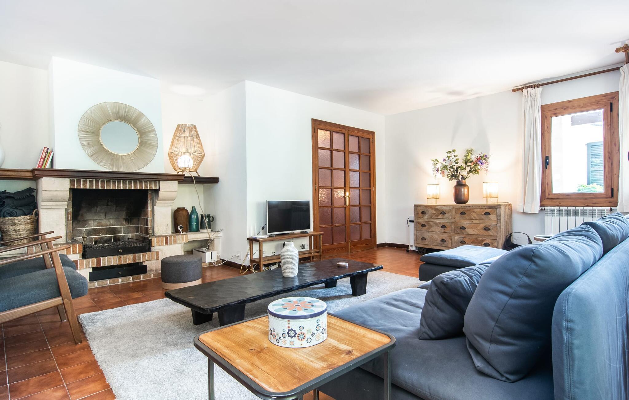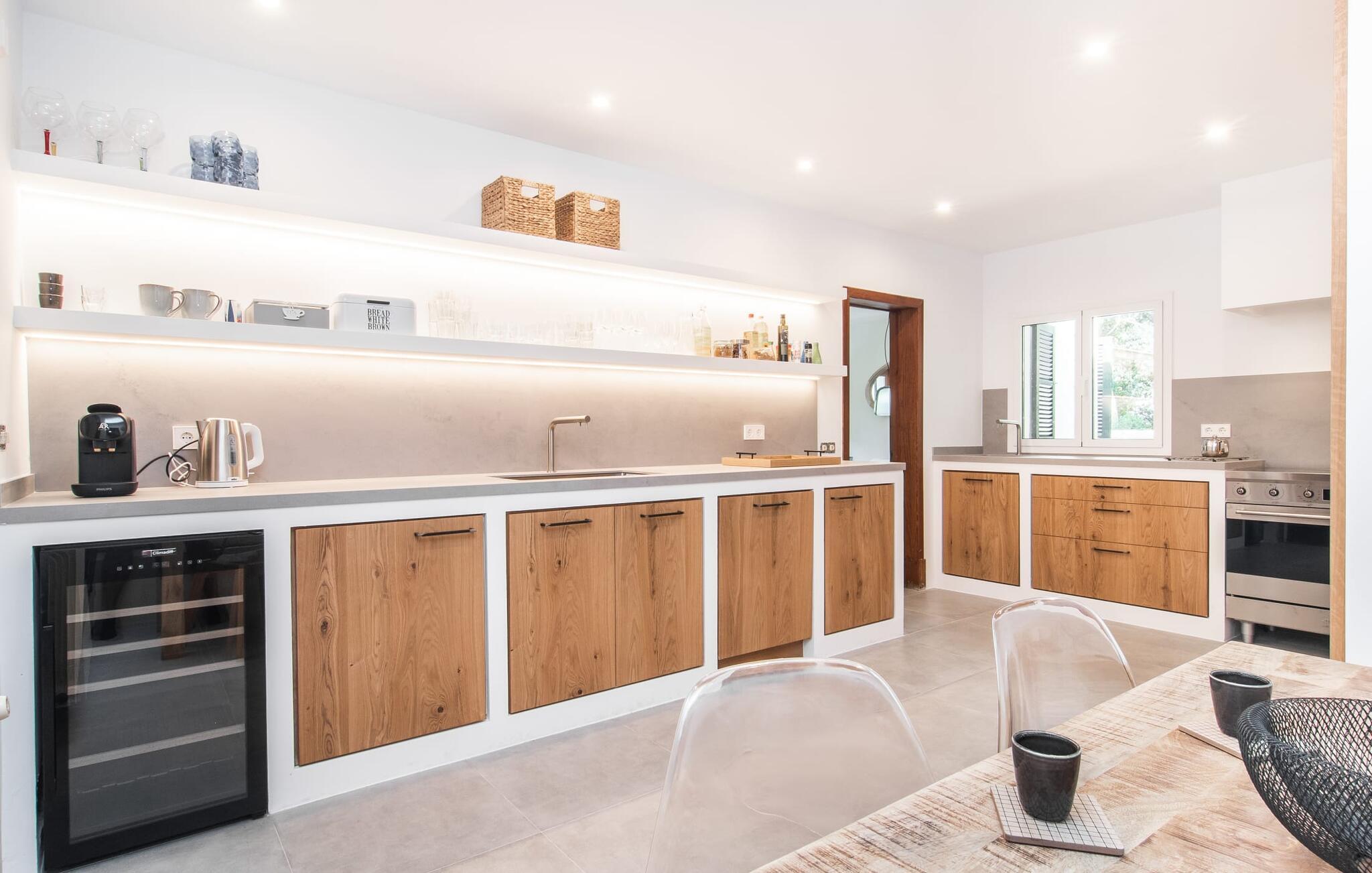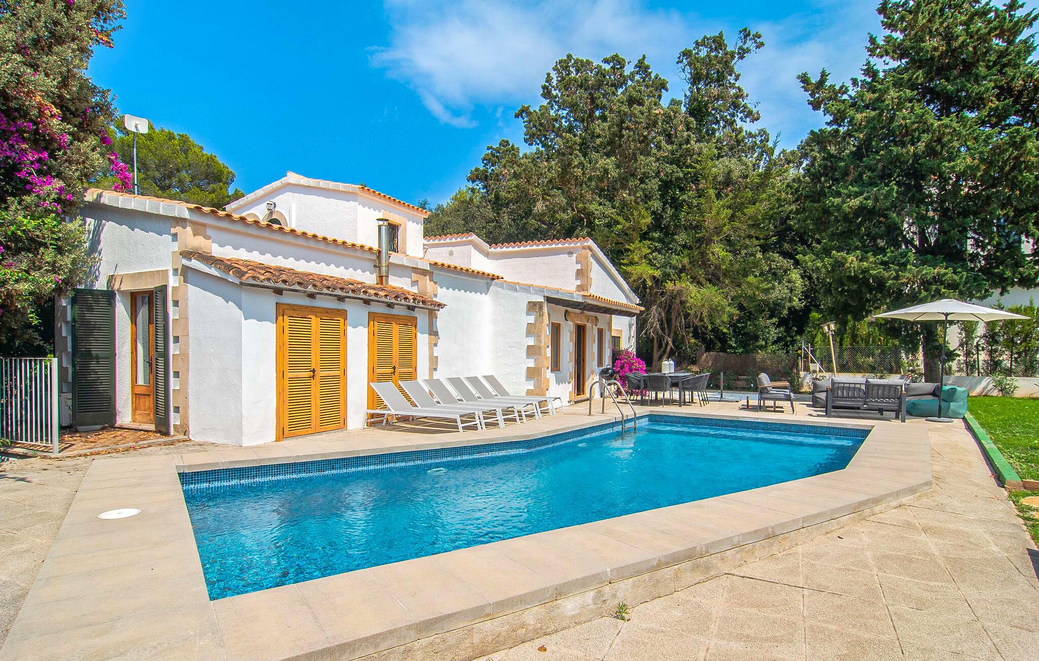 Interiøret i feriehuset har en god romfordeling og romslige rom med mye naturlig lys. Stuen er møblert med en koselig sofa og moderne sitteplasser. Sjarmen fra 1970-tallet er bevisst bevart her og skaper en koselig atmosfære. To trappetrinn opp ligger en lys og vennlig spisestue med tilgang til et romslig, fullt utstyrt kjøkken med en annen spiseplass. Et annet stort rom, som er egnet som spisestue, har utgang til terrassen. De tre doble soverommene er svært romslige og utstyrt med garderober og klimaanlegg. Takket være skodder kan de mørklegges helt for å nyte avslappende siestaer i den varme årstiden. Ett av soverommene har eget bad. Det er også et separat bad med dusj og et vaskerom i første etasje. Villaen ligger i et velholdt boligområde på Victòria-halvøya nordøst på Mallorca. To barnevennlige strender ligger henholdsvis 3 og 5 minutter unna med bil. De kan også lett nås til fots på 15 minutter. Middelalderbyen Alcúdia med gode shoppingmuligheter ligger 4 km unna. Den lange sandstranden i Alcúdiabukten ligger en 10-minutters kjøretur unna.