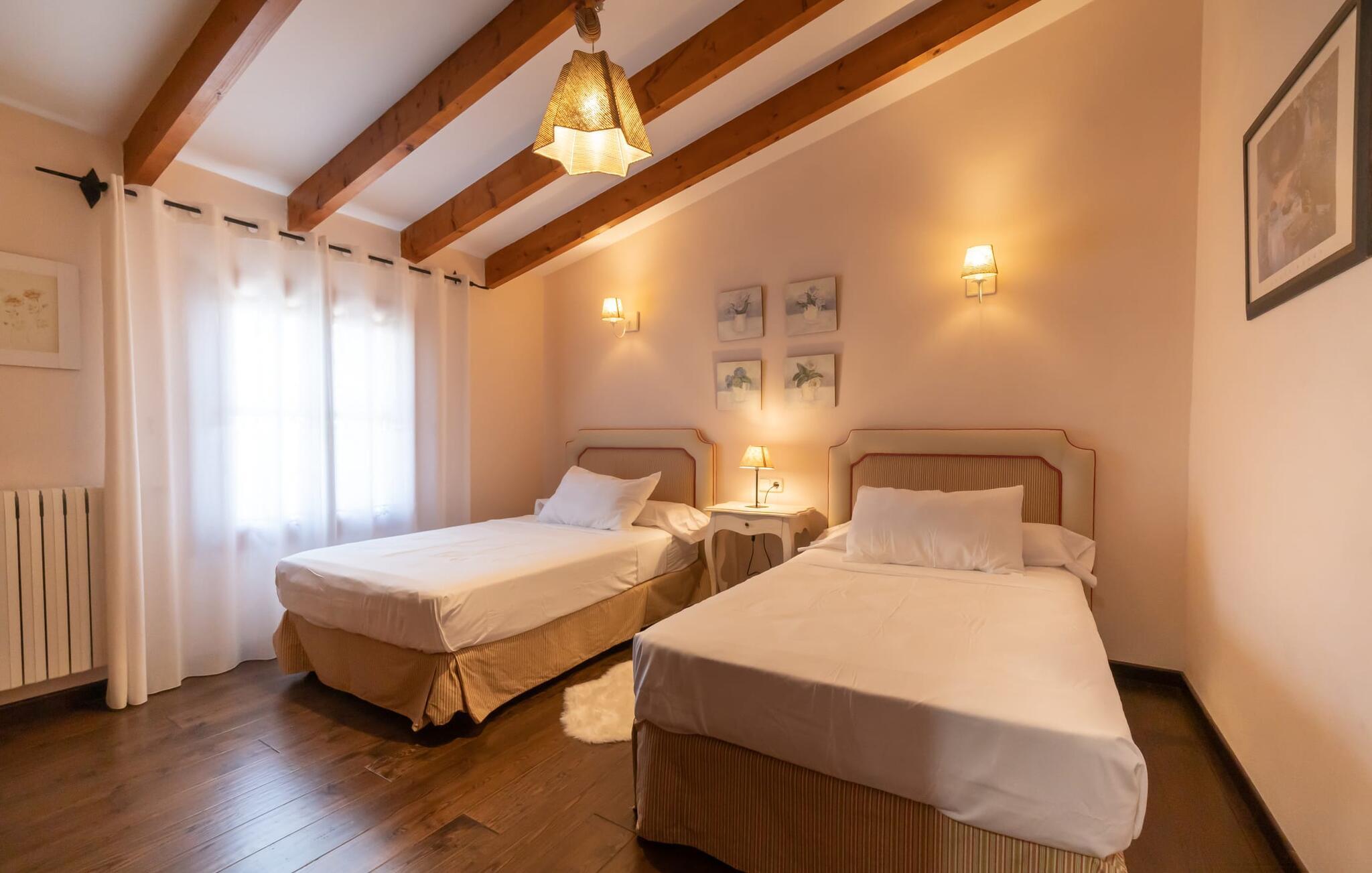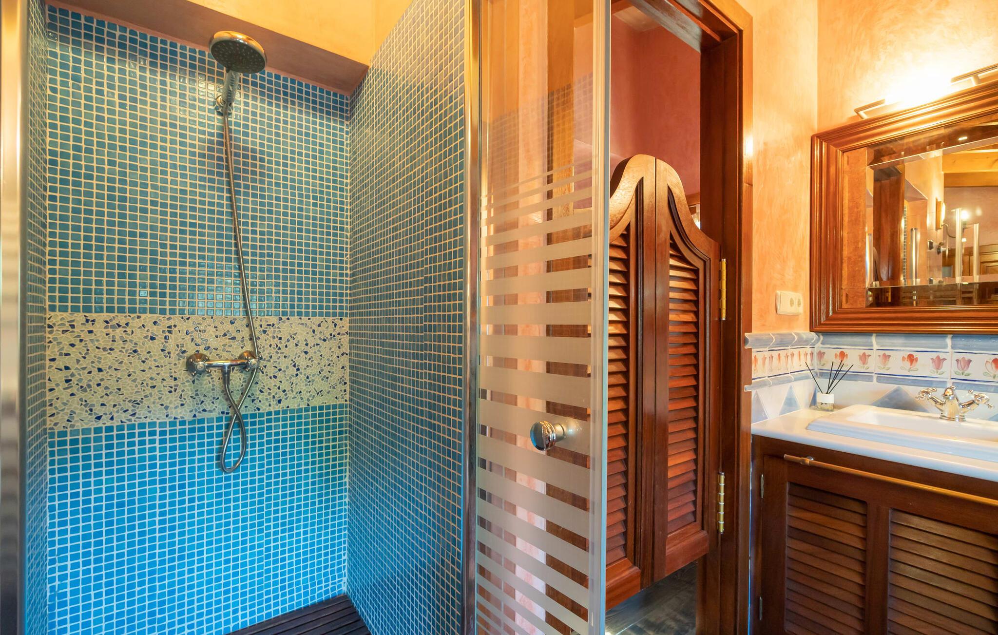 Innvendig har dette klimatiserte gårdshuset sentralvarme og en lys, romslig planløsning med detaljer i tre og stein. Det smakfulle, klassisk elegante interiøret har en stue og spisestue innrammet av rustikke natursteinvegger med ulike sittegrupper, TV, spillebord og en stor peis. Kjøkkenet er utstyrt med hvitevarer av høy kvalitet og har et bord for felles måltider.