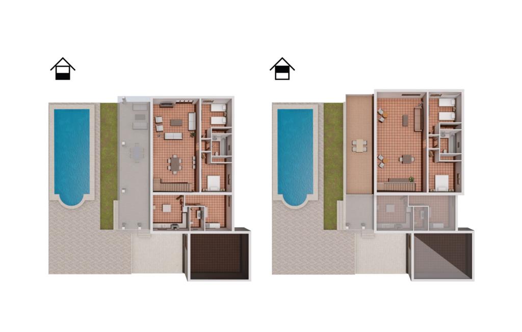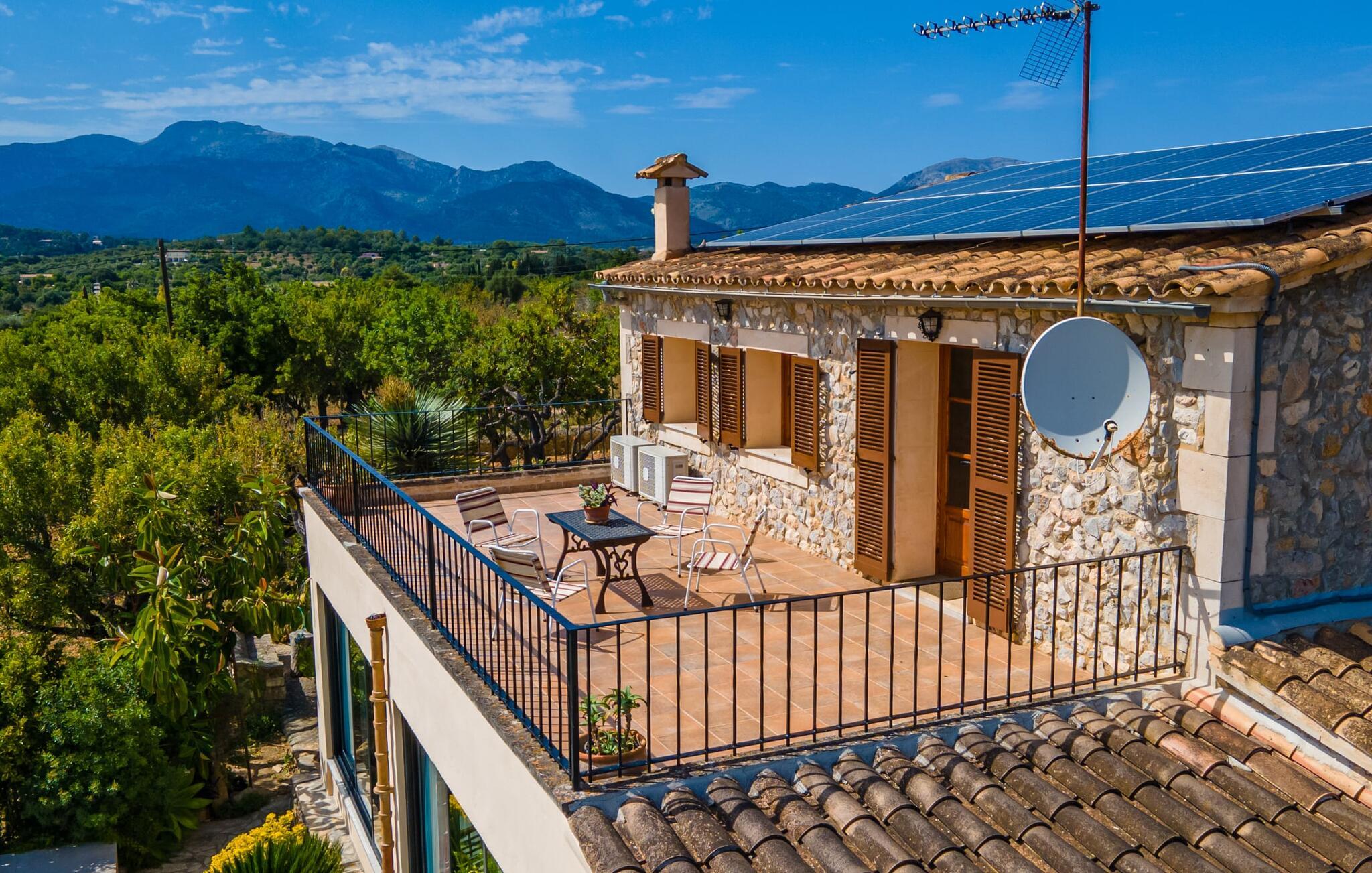 Det er også mye å si om selve Villa Els Ametllers, som ligger vakkert til. Vi liker spesielt villaens uteområde. Ikke bare er det asurblå bassenget, som er omgitt av en terrasse i naturstein og lett tilgjengelig via en trapp, helt fantastisk, men også de mange sittemulighetene i uteområdet er imponerende. Man kan nærmest si at oppholdsrommene strekker seg utover den inngjerdede terrassen. De mange benkene er flott plassert som balustrader i kanten av terrassen. De lette gardinene i varme beige toner gir skygge når det er nødvendig. Et glassbord med komfortable stoler utgjør en flott uteservering. Den store terrassen har så mye plass at det også er plass til en sval lounge ved siden av den historiske, mursteinsbygde fontenen. Et lite table-pour-deux er tilgjengelig for morgenkaffen. Over denne fantastiske terrassen er det en stor solrik balkong av samme størrelse. Her er det en annen sittegruppe med 4 stoler, egnet for avslapping om kvelden eller for soling om dagen. Herfra kan du komfortabelt nyte utsikten over den vakre grønne Plà og fjellene.