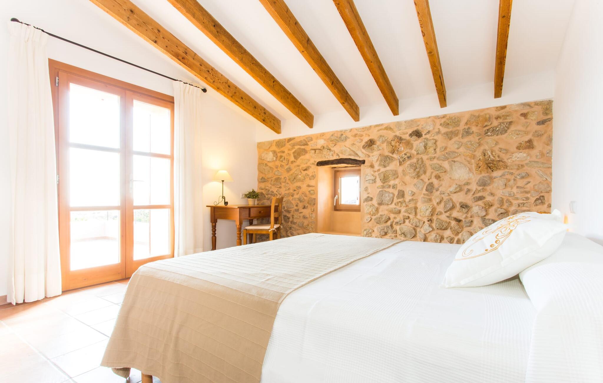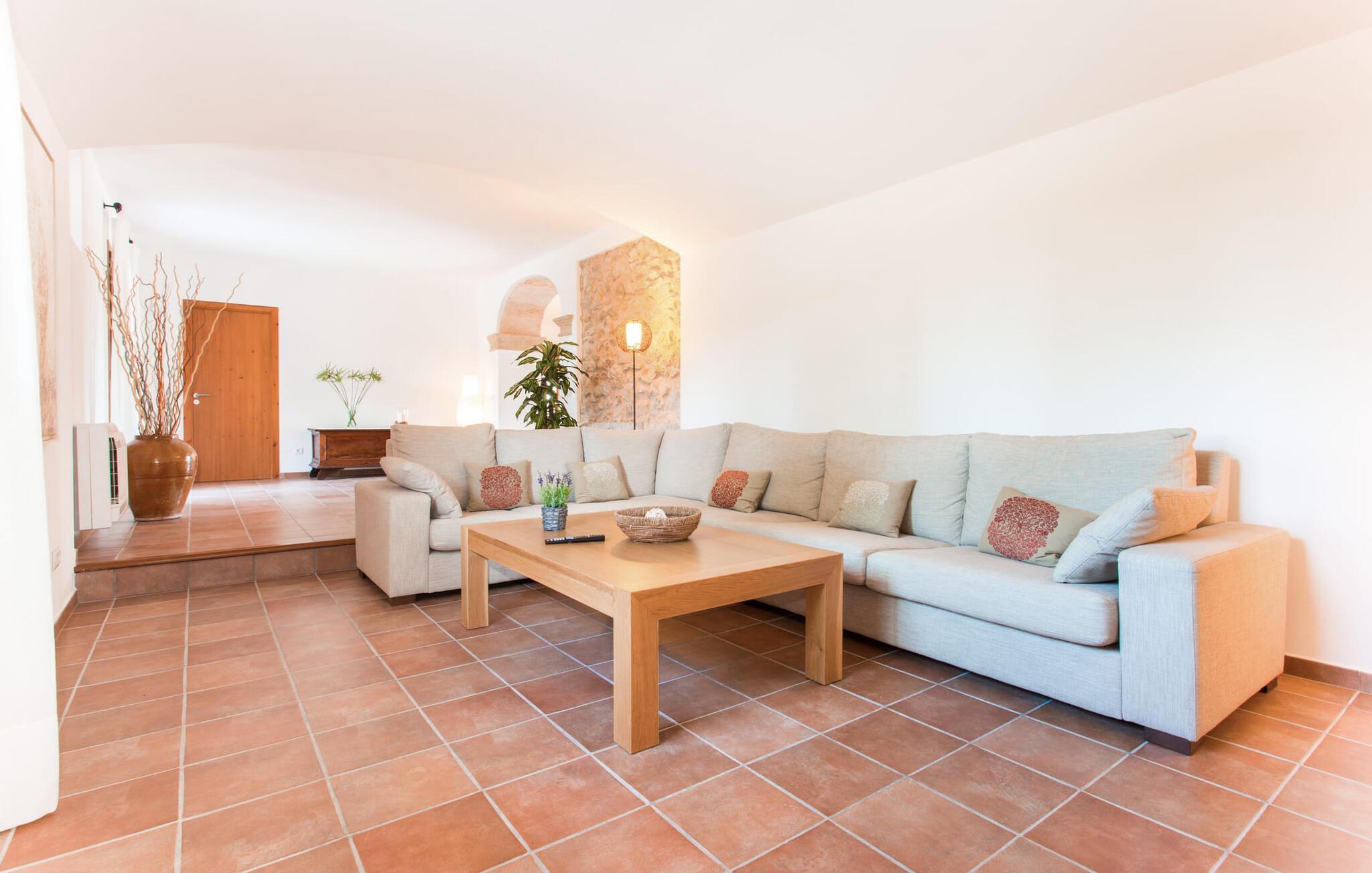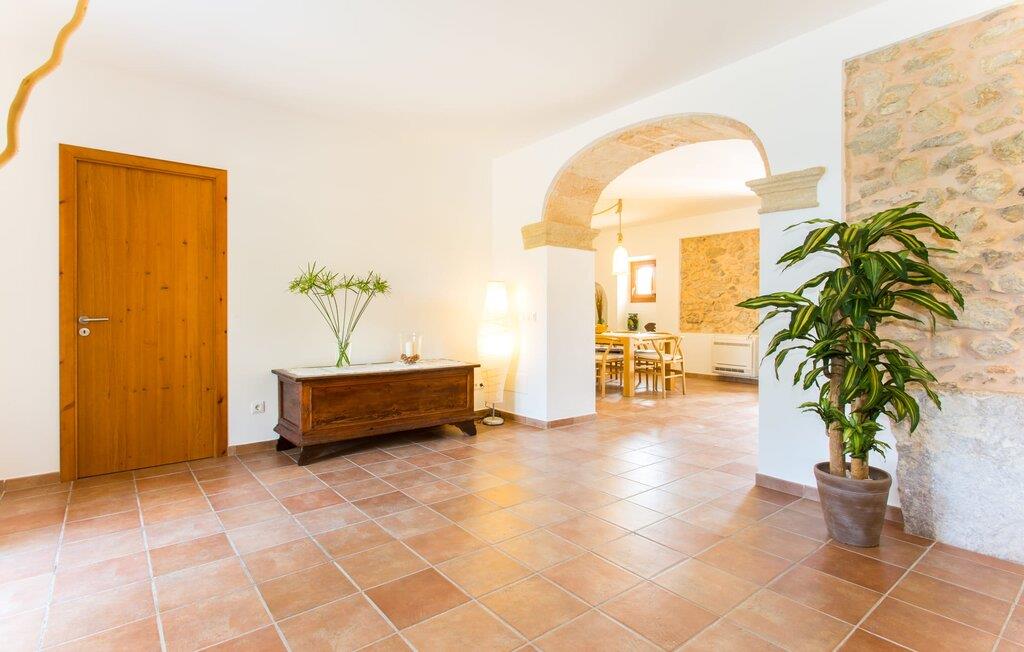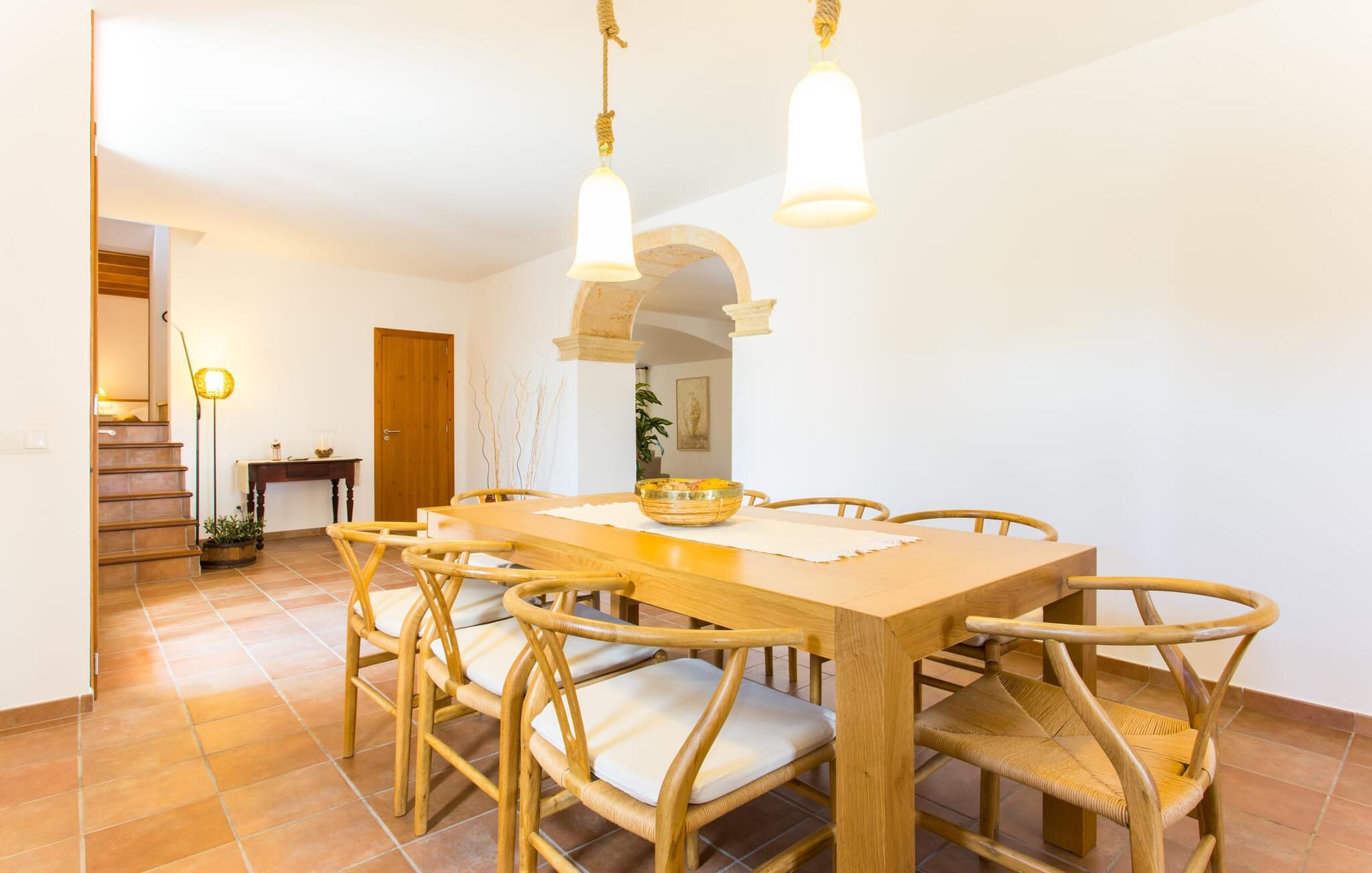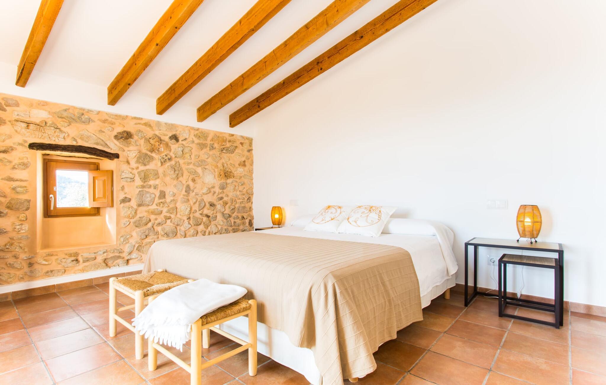 Husets første etasje har noen vakre flislagte gulv. I nesten alle rom er en vegg i det minste delvis kledd med tradisjonelt murverk. Huset er perfekt plassert for å få mest mulig ut av sollyset, selv innendørs, og alle rommene føles lyse og lette. Den store stuen er innbydende og komfortabelt møblert. Stuen er innredet slik at den vender mot TV-en og peisen. Her kan du slappe av i timevis, uansett vær ute. I tilknytning til dette rommet ligger et kjøkken som åpner opp mot spiseplassen, fullt utstyrt for å oppfylle alle ønsker. I spisestuen er det et bord til - et annet flott sted for gode samtaler i godt selskap! De andre rommene i underetasjen består av to soverom med klimaanlegg, et bad og et ekstra toalett. I andre etasje finner du en annen stue med TV og ytterligere tre soverom med klimaanlegg, som er komfortabelt og lekkert innredet. De er ideelle for en avslappende natts søvn etter dagens eventyr. Alle badene, både oppe og nede, er utstyrt med moderne innredning, mange vinduer og varmt, lyst lys. Fra takterrassen har man en fantastisk utsikt over det fascinerende landskapet som omgir fincaen, og man kommer ut via det største rommet i øverste etasje.