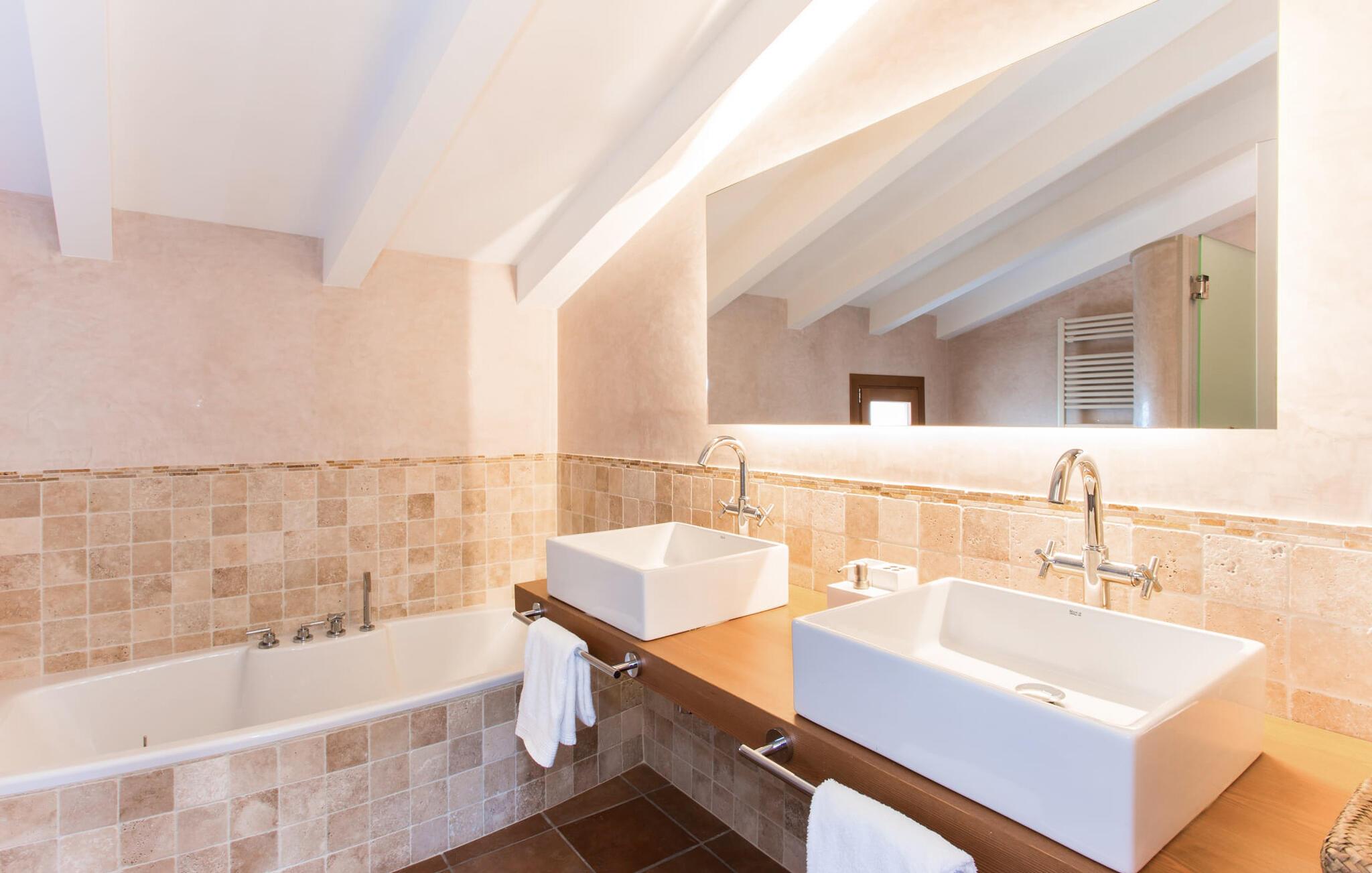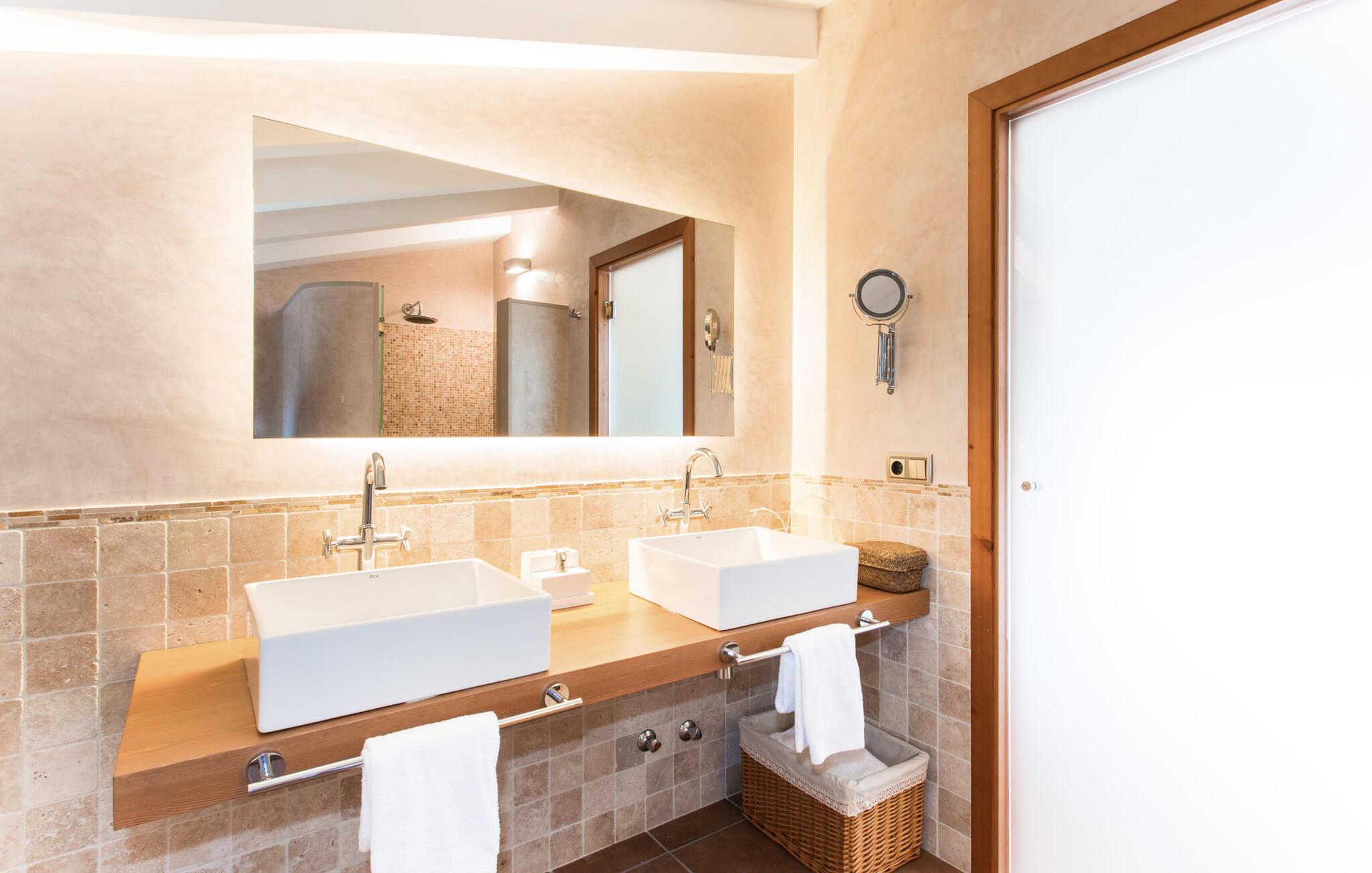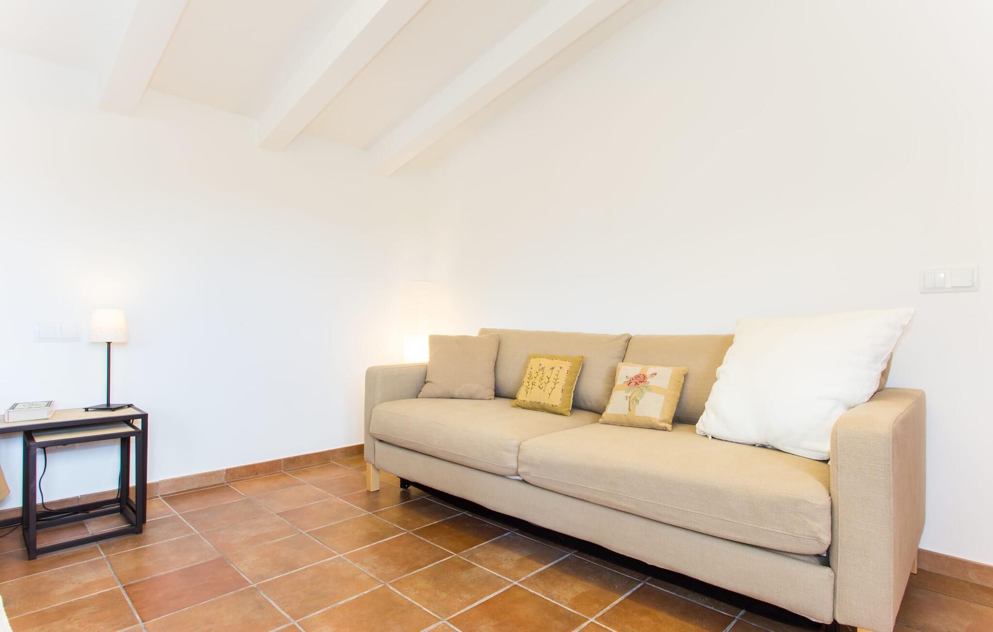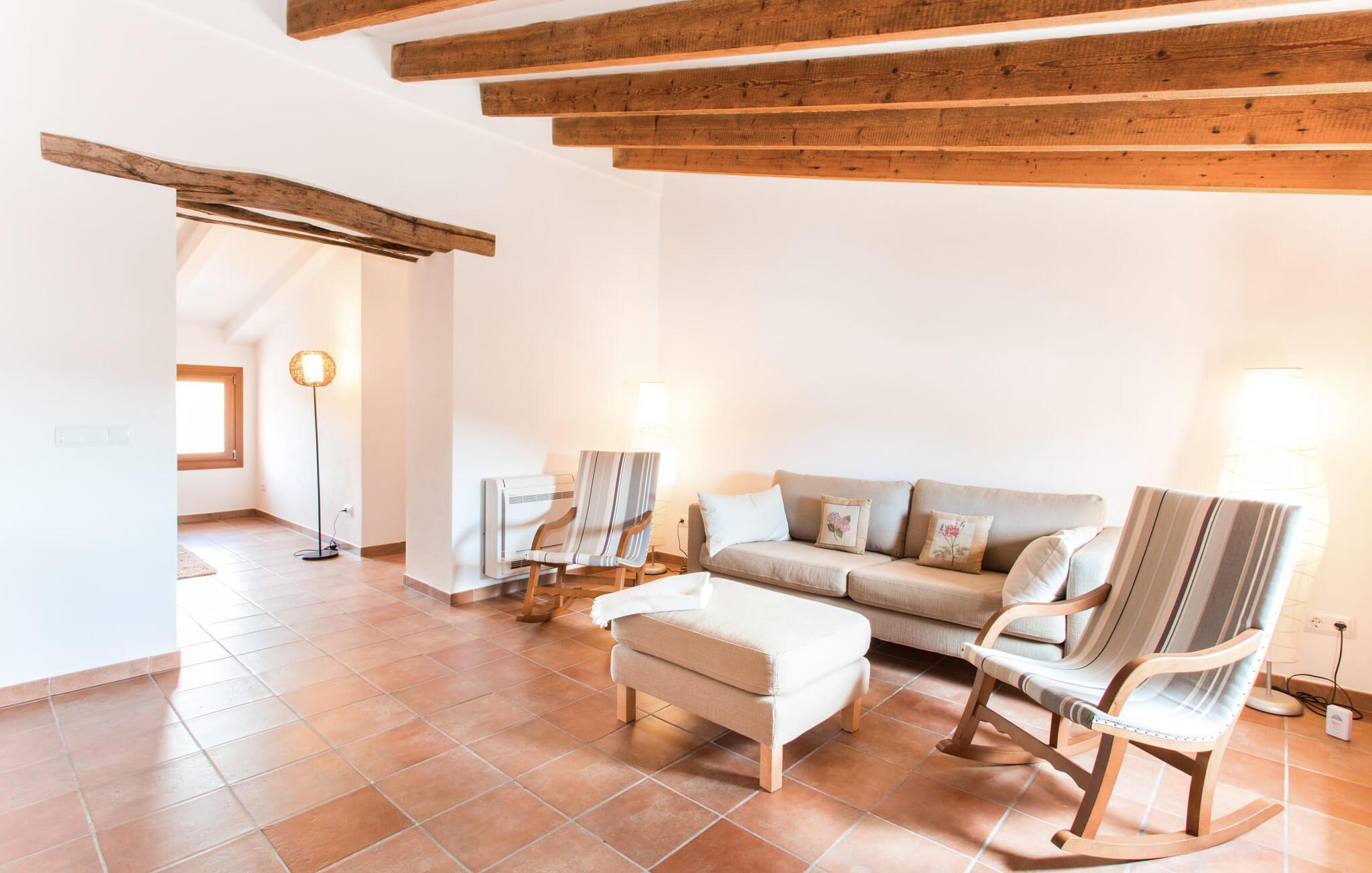 Husets første etasje har noen vakre flislagte gulv. I nesten alle rom er en vegg i det minste delvis kledd med tradisjonelt murverk. Huset er perfekt plassert for å få mest mulig ut av sollyset, selv innendørs, og alle rommene føles lyse og lette. Den store stuen er innbydende og komfortabelt møblert. Stuen er innredet slik at den vender mot TV-en og peisen. Her kan du slappe av i timevis, uansett vær ute. I tilknytning til dette rommet ligger et kjøkken som åpner opp mot spiseplassen, fullt utstyrt for å oppfylle alle ønsker. I spisestuen er det et bord til - et annet flott sted for gode samtaler i godt selskap! De andre rommene i underetasjen består av to soverom med klimaanlegg, et bad og et ekstra toalett. I andre etasje finner du en annen stue med TV og ytterligere tre soverom med klimaanlegg, som er komfortabelt og lekkert innredet. De er ideelle for en avslappende natts søvn etter dagens eventyr. Alle badene, både oppe og nede, er utstyrt med moderne innredning, mange vinduer og varmt, lyst lys. Fra takterrassen har man en fantastisk utsikt over det fascinerende landskapet som omgir fincaen, og man kommer ut via det største rommet i øverste etasje.