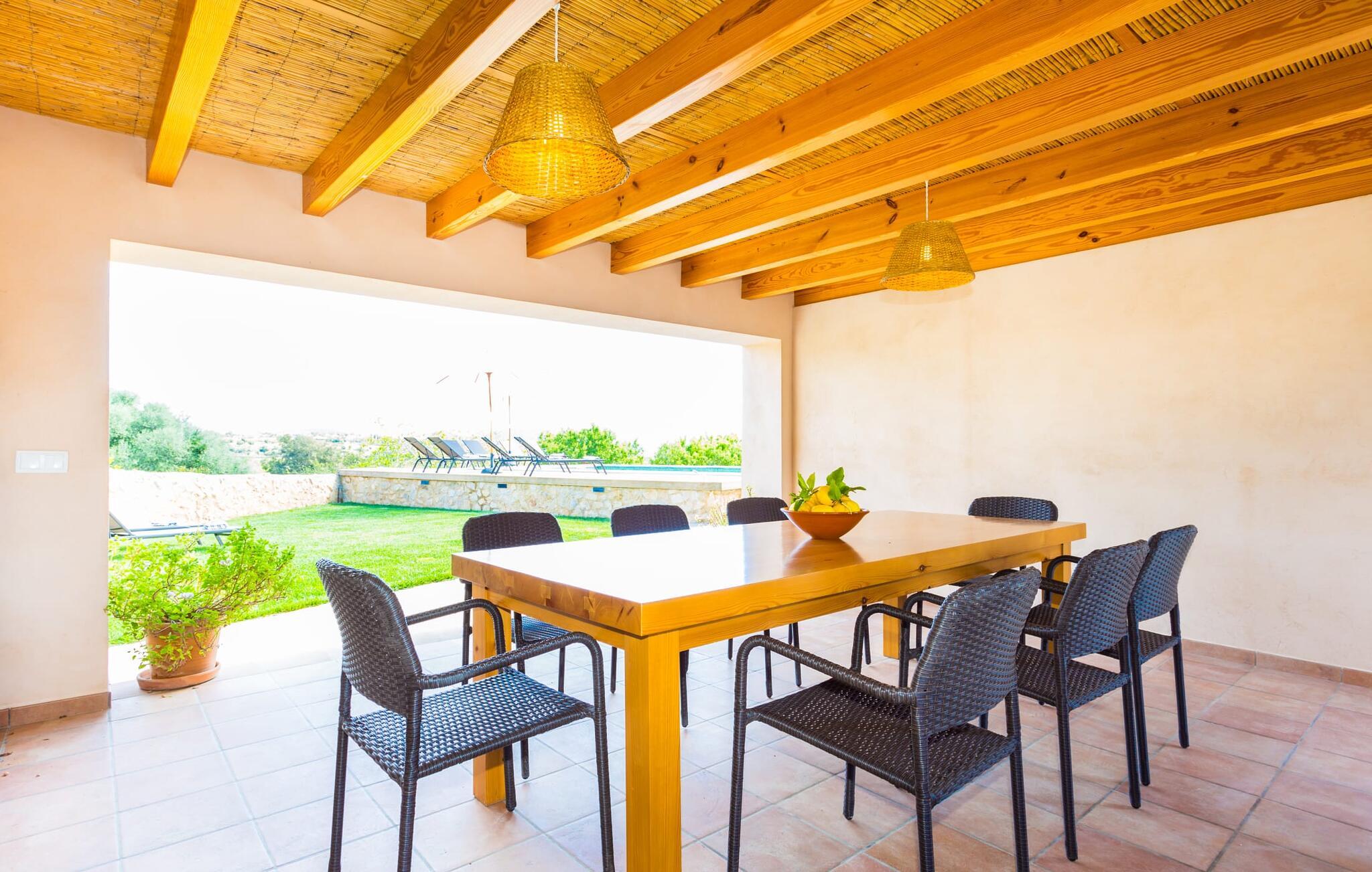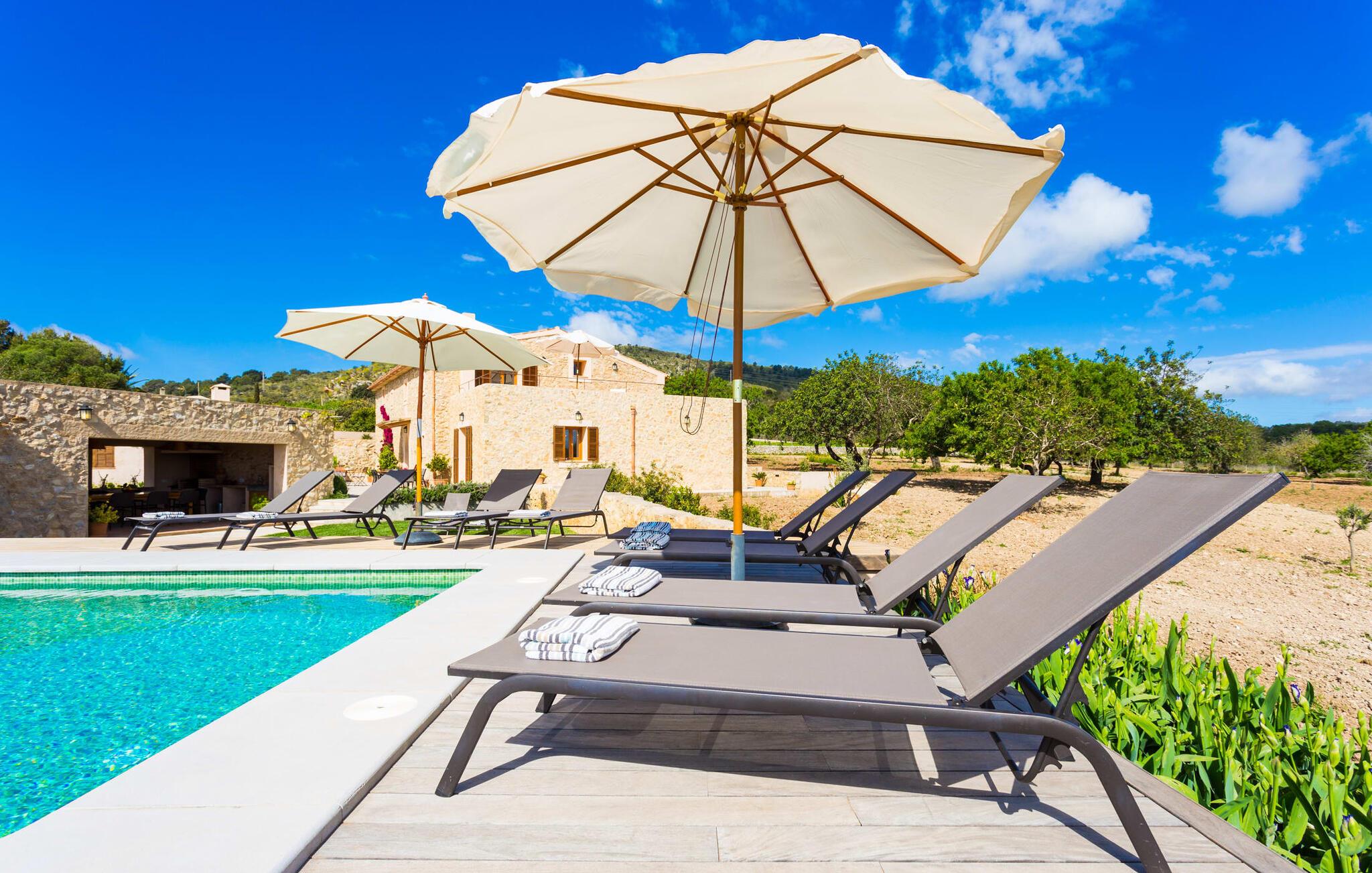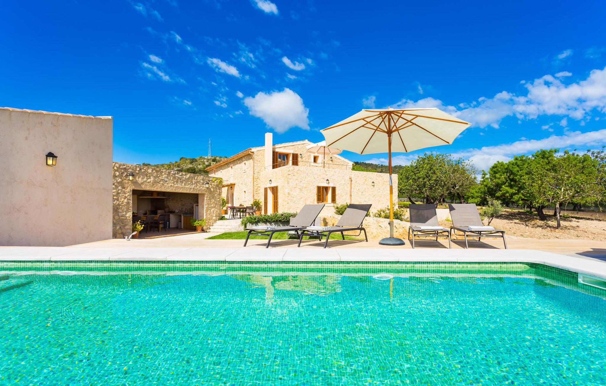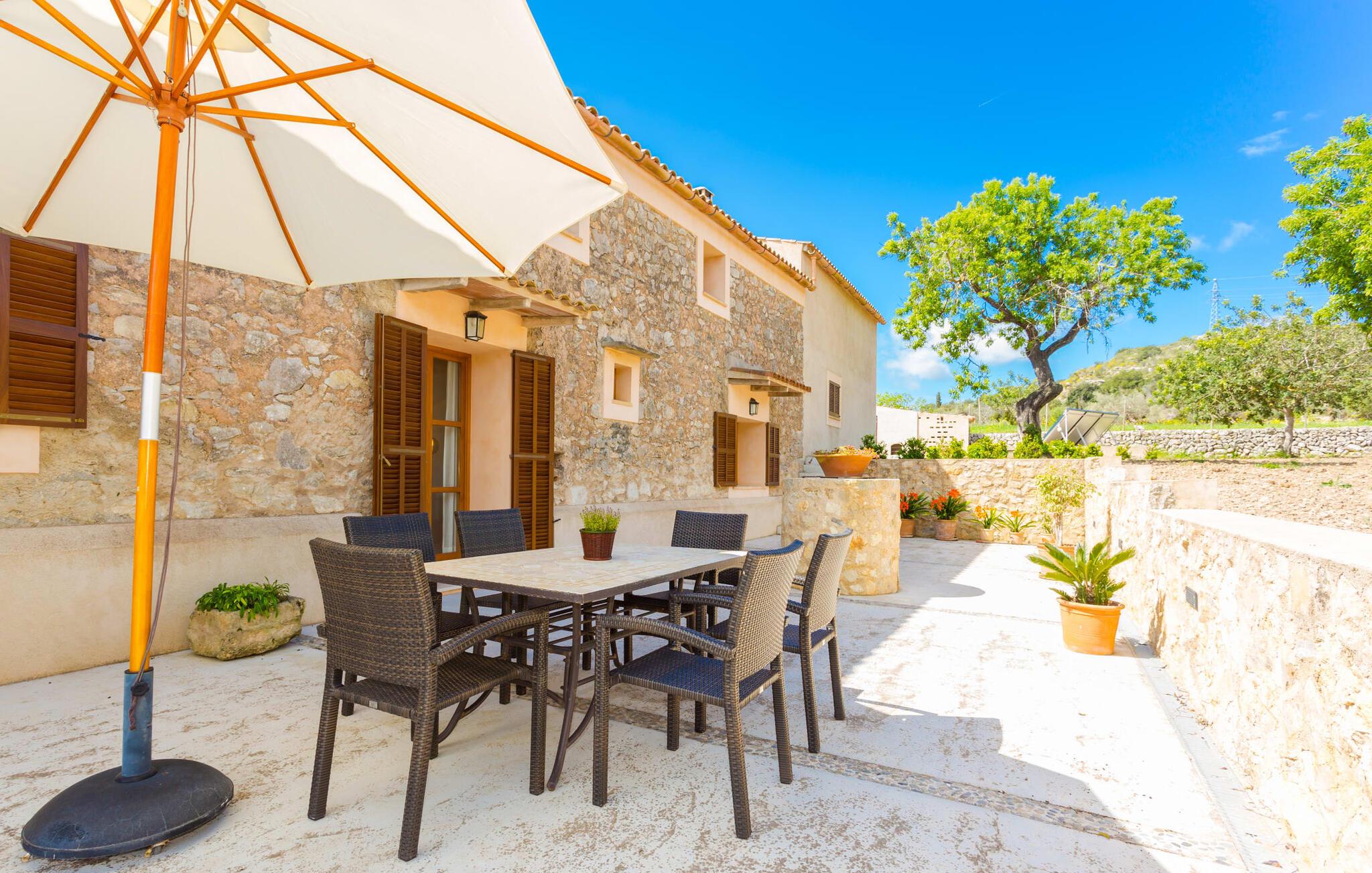 Villa Els Clepes er det perfekte stedet for alle som setter pris på en tradisjonell atmosfære, men som også ønsker å nyte opplevelsen av et teknisk velutstyrt feriehus med fasiliteter av høy kvalitet. På denne store, bortgjemte eiendommen er ro og avslapning garantert. Så snart du ankommer den to-etasjes bygningen med sitt tradisjonelle murverk, vil du bli begeistret over å se hvordan det ser ut både innvendig og utvendig. Når du går rundt huset, hvor den vakre, vidstrakte eiendommen utfolder seg foran øynene dine, vil du legge merke til mange mandel- og johannesbrødtrær samt noen andre planter som hører hjemme i regionen. Fra den asfalterte terrassen er det bare noen få skritt over plenen til bassenget. Det er omgitt av en treterrasse på to sider. Her kan du kanskje finne deg en fin plass på en av de mange solsengene som er tilgjengelig, med en kjølig drink i hånden, og bare slappe av og nyte utsikten. Rett og slett flott - den ultimate ferien! På tomten er det også en liten dam med gullfisk. Den innebygde utegrillen er plassert i et eget overbygd område, sammen med en vask og en stor benkeplate. Her kan du tilberede den ferske, lokale maten du kjøper på markedet før du griller den og nyter den på ett og samme sted. Mat, godt selskap og en fantastisk utsikt er en selvfølge her. Du finner skygge under parasollene, under taket på grillområdet og ved det ekstra spisebordet på nordsiden av huset.