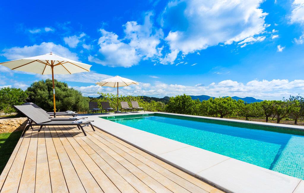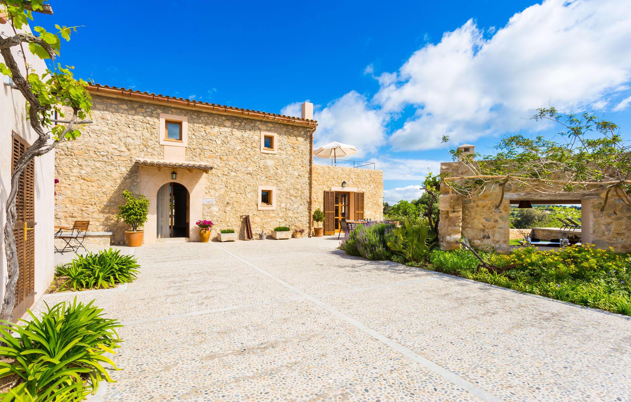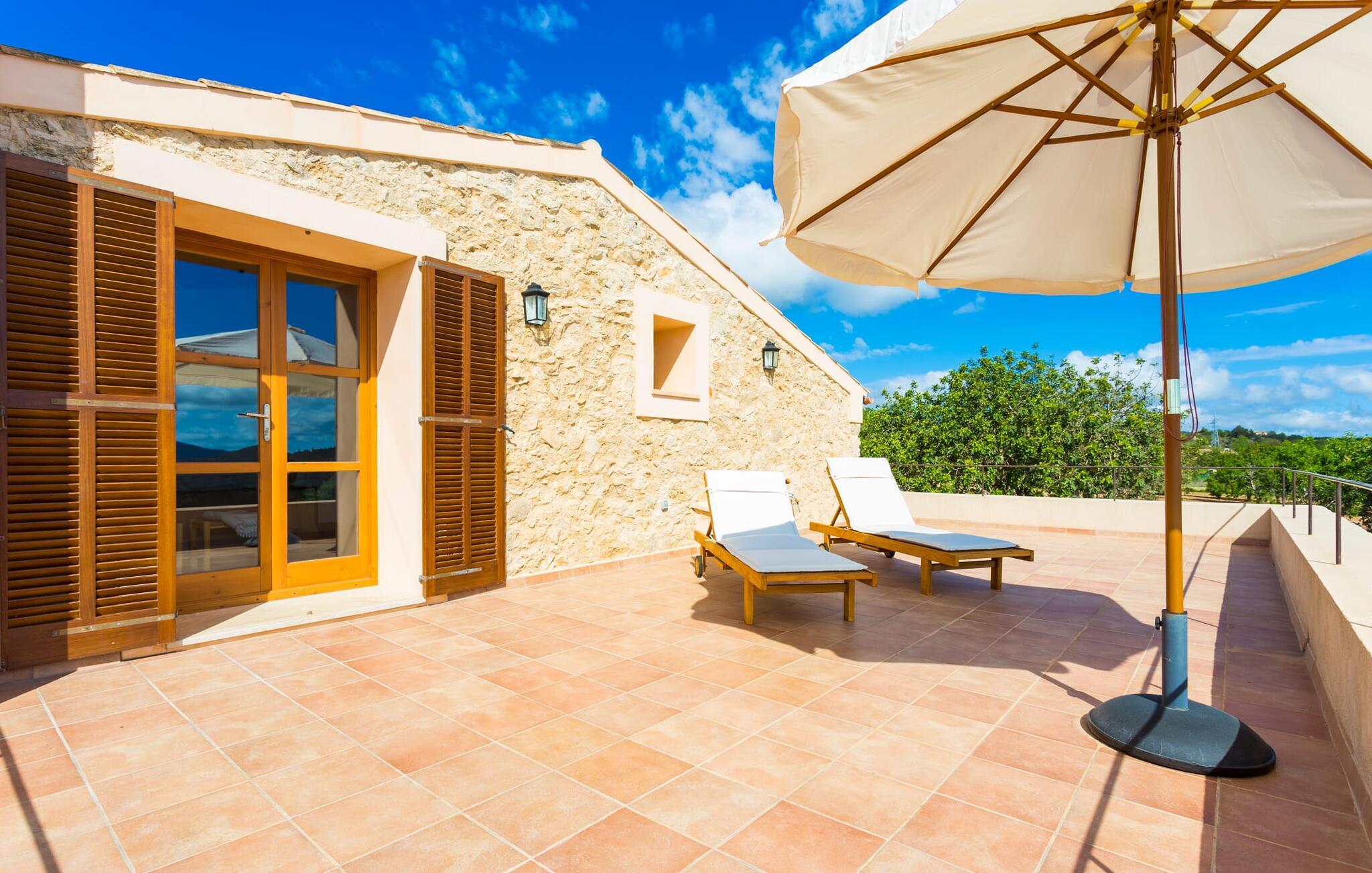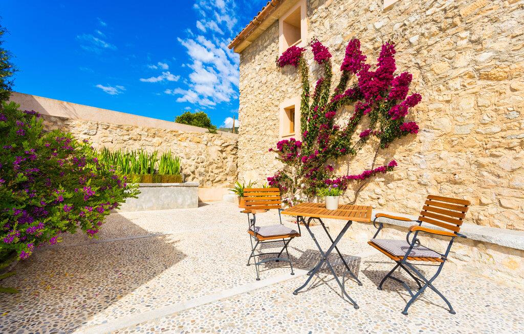 Villa Els Clepes er det perfekte stedet for alle som setter pris på en tradisjonell atmosfære, men som også ønsker å nyte opplevelsen av et teknisk velutstyrt feriehus med fasiliteter av høy kvalitet. På denne store, bortgjemte eiendommen er ro og avslapning garantert. Så snart du ankommer den to-etasjes bygningen med sitt tradisjonelle murverk, vil du bli begeistret over å se hvordan det ser ut både innvendig og utvendig. Når du går rundt huset, hvor den vakre, vidstrakte eiendommen utfolder seg foran øynene dine, vil du legge merke til mange mandel- og johannesbrødtrær samt noen andre planter som hører hjemme i regionen. Fra den asfalterte terrassen er det bare noen få skritt over plenen til bassenget. Det er omgitt av en treterrasse på to sider. Her kan du kanskje finne deg en fin plass på en av de mange solsengene som er tilgjengelig, med en kjølig drink i hånden, og bare slappe av og nyte utsikten. Rett og slett flott - den ultimate ferien! På tomten er det også en liten dam med gullfisk. Den innebygde utegrillen er plassert i et eget overbygd område, sammen med en vask og en stor benkeplate. Her kan du tilberede den ferske, lokale maten du kjøper på markedet før du griller den og nyter den på ett og samme sted. Mat, godt selskap og en fantastisk utsikt er en selvfølge her. Du finner skygge under parasollene, under taket på grillområdet og ved det ekstra spisebordet på nordsiden av huset.