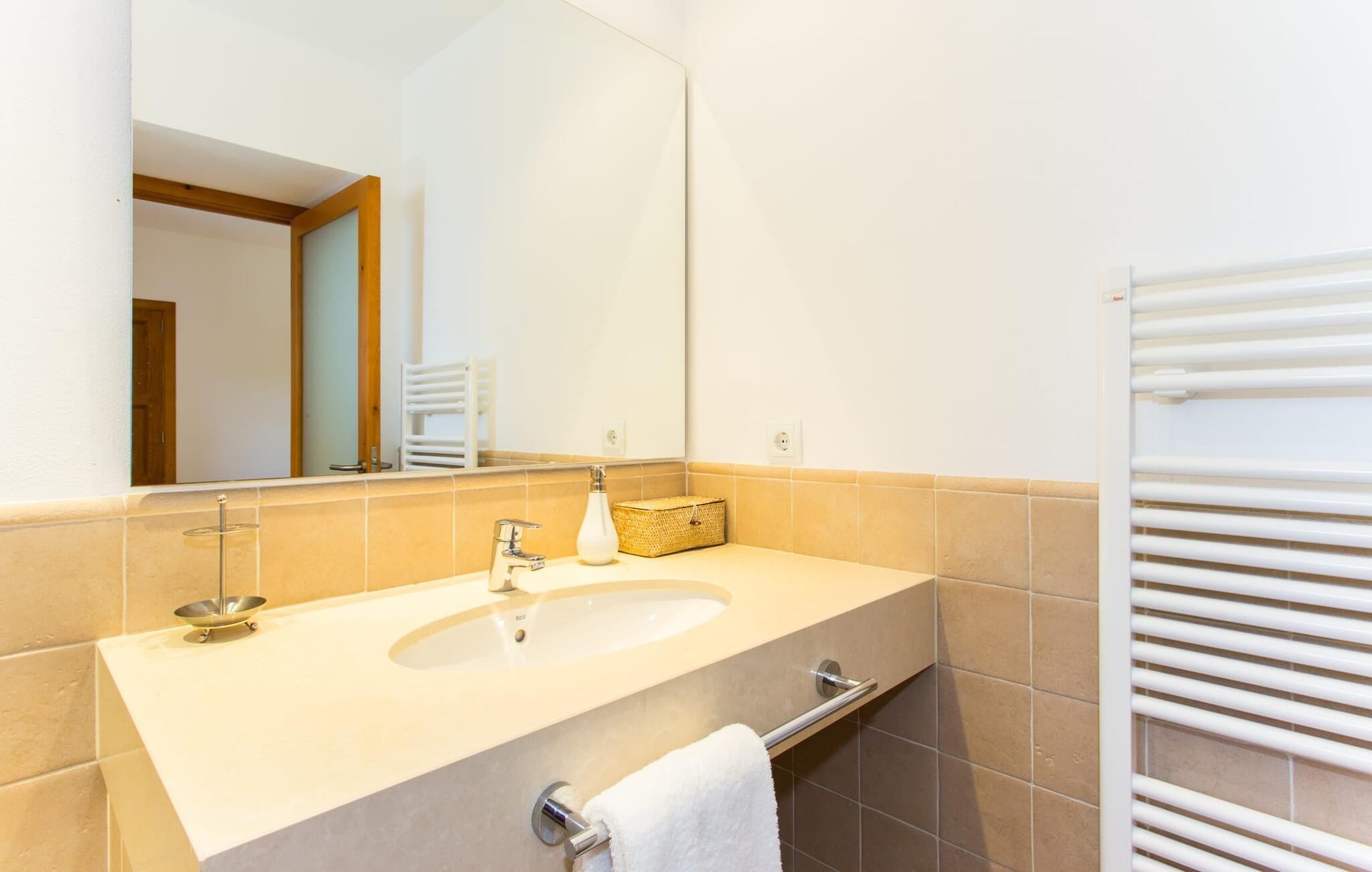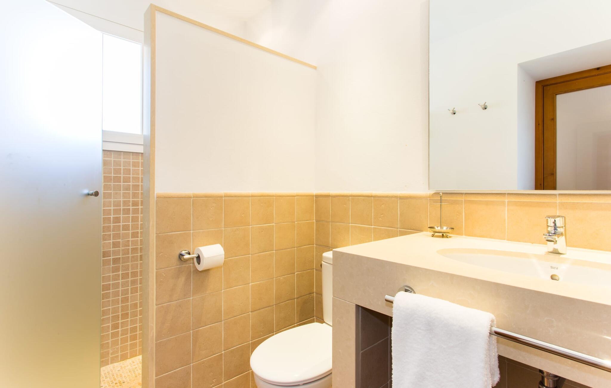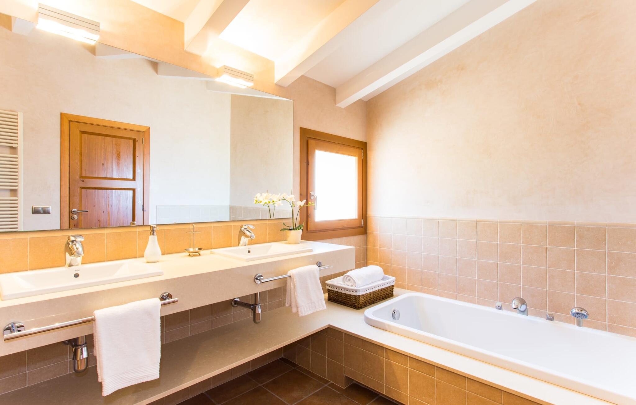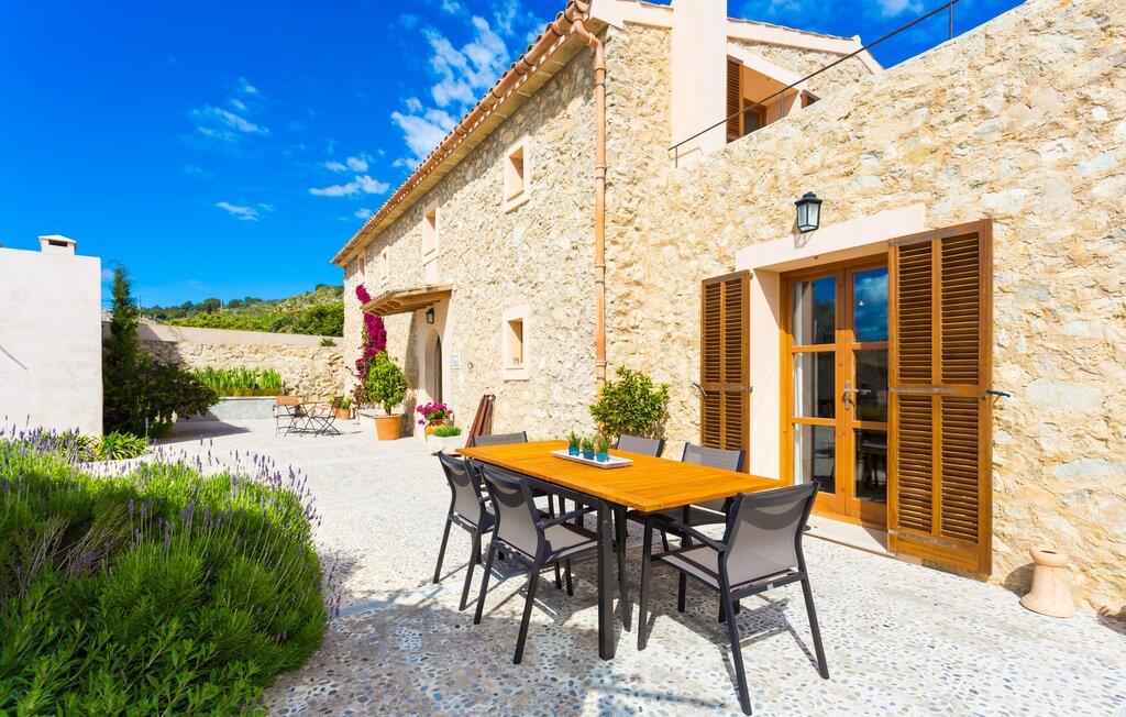 Villa Els Clepes er det perfekte stedet for alle som setter pris på en tradisjonell atmosfære, men som også ønsker å nyte opplevelsen av et teknisk velutstyrt feriehus med fasiliteter av høy kvalitet. På denne store, bortgjemte eiendommen er ro og avslapning garantert. Så snart du ankommer den to-etasjes bygningen med sitt tradisjonelle murverk, vil du bli begeistret over å se hvordan det ser ut både innvendig og utvendig. Når du går rundt huset, hvor den vakre, vidstrakte eiendommen utfolder seg foran øynene dine, vil du legge merke til mange mandel- og johannesbrødtrær samt noen andre planter som hører hjemme i regionen. Fra den asfalterte terrassen er det bare noen få skritt over plenen til bassenget. Det er omgitt av en treterrasse på to sider. Her kan du kanskje finne deg en fin plass på en av de mange solsengene som er tilgjengelig, med en kjølig drink i hånden, og bare slappe av og nyte utsikten. Rett og slett flott - den ultimate ferien! På tomten er det også en liten dam med gullfisk. Den innebygde utegrillen er plassert i et eget overbygd område, sammen med en vask og en stor benkeplate. Her kan du tilberede den ferske, lokale maten du kjøper på markedet før du griller den og nyter den på ett og samme sted. Mat, godt selskap og en fantastisk utsikt er en selvfølge her. Du finner skygge under parasollene, under taket på grillområdet og ved det ekstra spisebordet på nordsiden av huset.