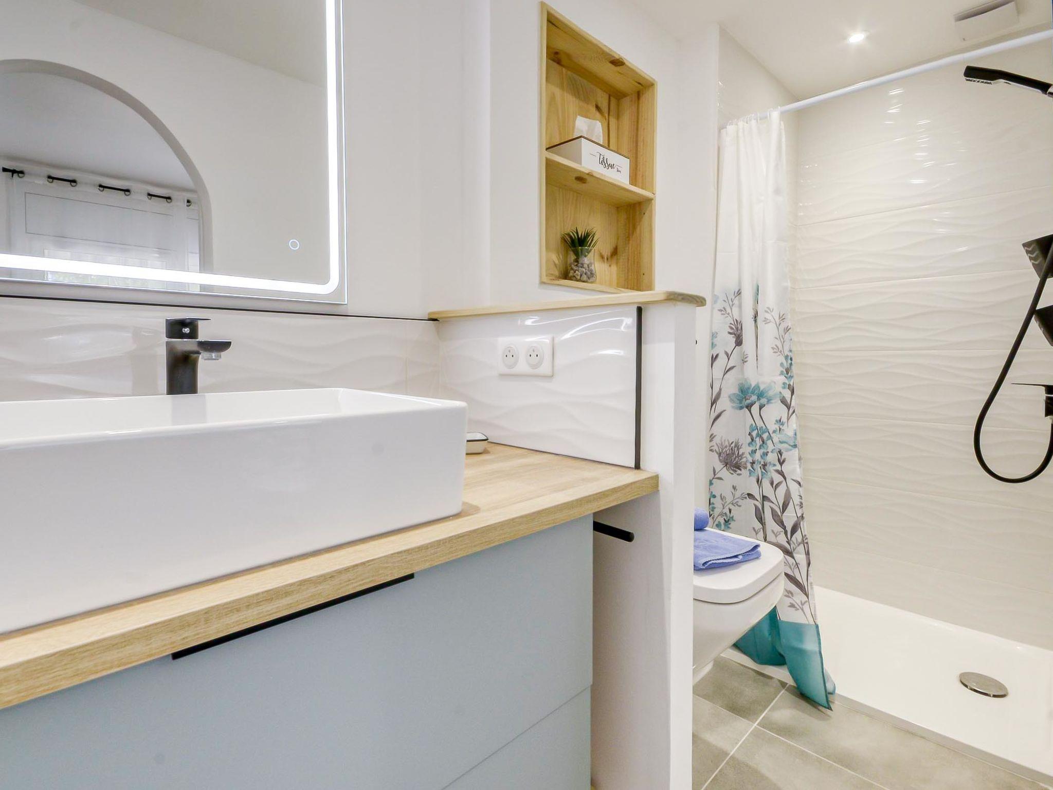 2-room apartment 40 m2, on the mezzanine. Comfortable and modern furnishings: living/dining room with 1 double sofabed (140 cm, length 190 cm), dining table, satellite TV, flat screen, air conditioning and forced-air heating. Exit to the terrace. 1 room with 1 french bed (160 cm, length 190 cm), air conditioning and forced-air heating. Open kitchen (dishwasher, 2 induction hot plates, toaster, kettle, electric coffee machine, combination microwave). Shower/WC. Terrace 12 m2. Terrace furniture. View of the garden. Facilities: washing machine, iron, hair dryer. Internet (WiFi, free). Please note: non-smokers only. TV only DE. HUTG-020662