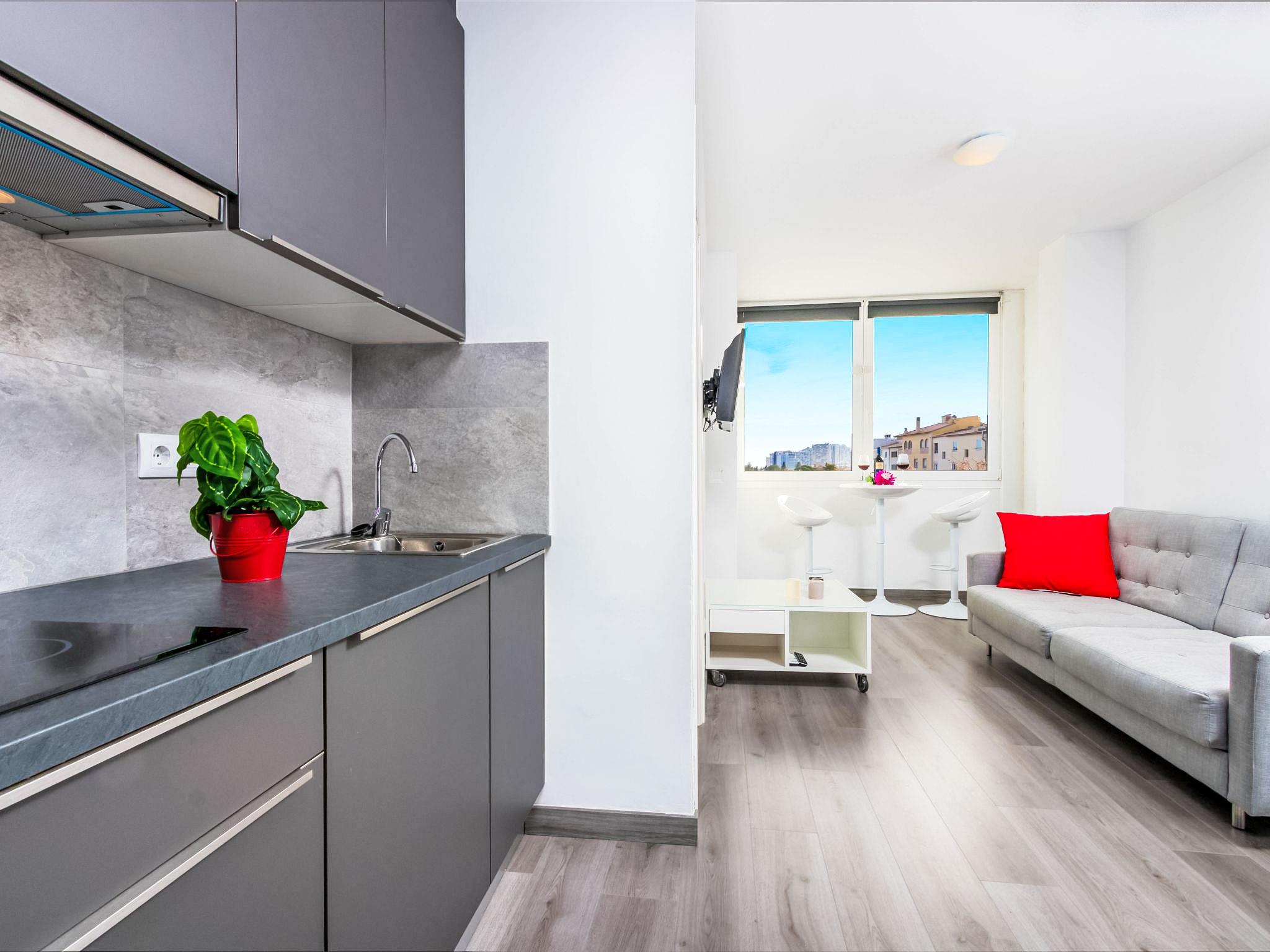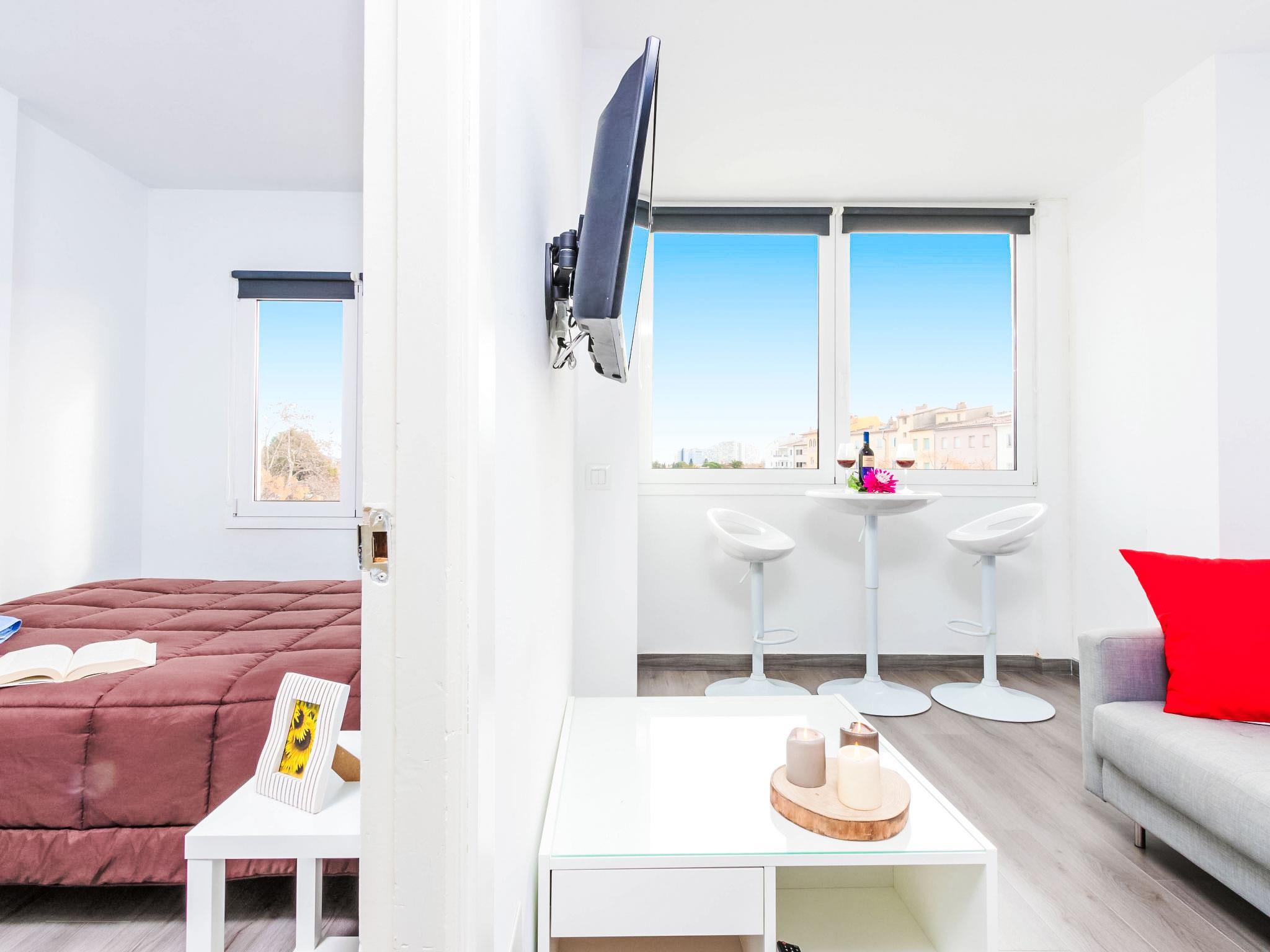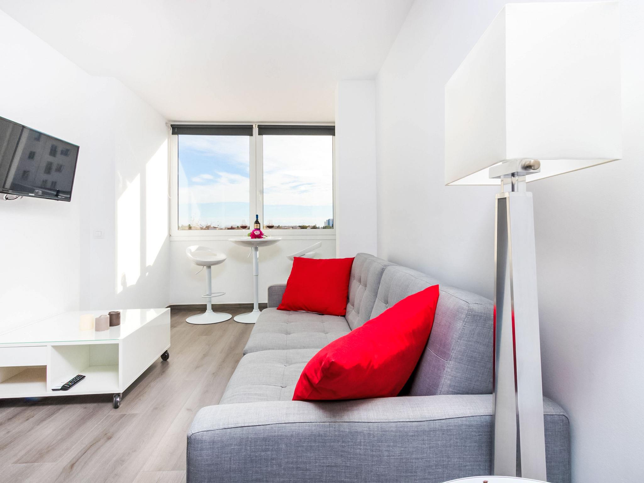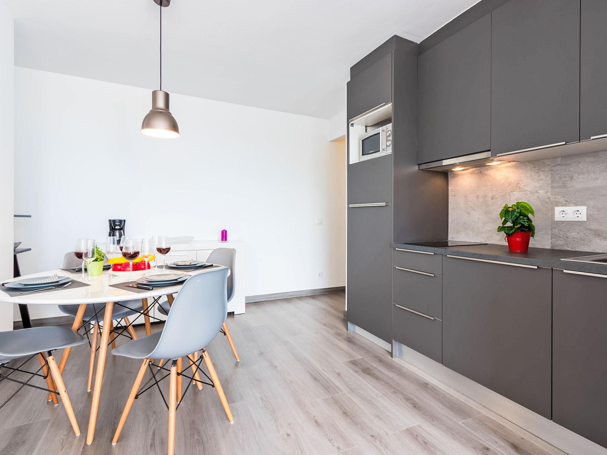 2-room apartment 37 m2 on 2nd floor. Bright, fully renovated in 2017, practical and modern furnishings: living/dining room with 1 double sofabed, dining table, kitchen corner and satellite TV (flat screen). 1 room with 1 french bed. Kitchenette (2 ceramic glass hob hotplates, microwave). Shower/WC. No heating option. Beautiful view of the garden. Facilities: washing machine. Internet (WiFi, free). Please note: TV only FR. HUTG026472 // Reg. Nr.: ESFCTU000017020000179070000000000000000000HUTG0264725