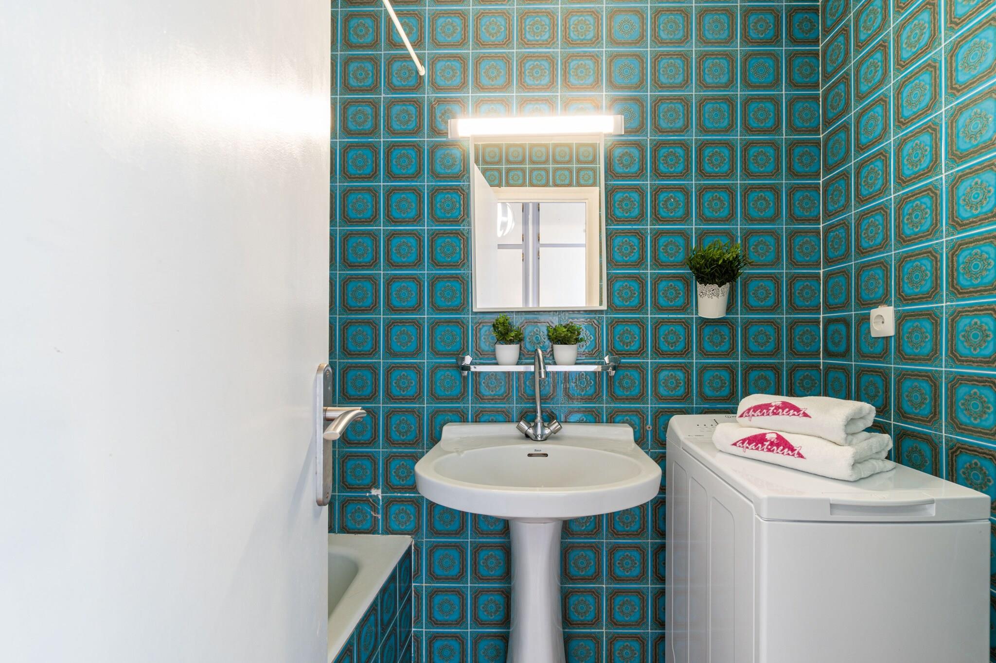 On the 8th floor: (open kitchen(hob(gas), toaster, coffee machine, microwave, fridge, dishes and cutlery), Living/diningroom(single bed, double sofa bed, TV(satellite), dining table), bedroom(double bed), bathroom(bath tub)) Elevator, washing machine, terrace, iron