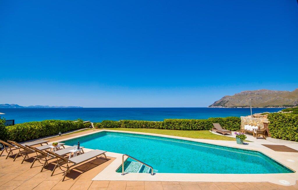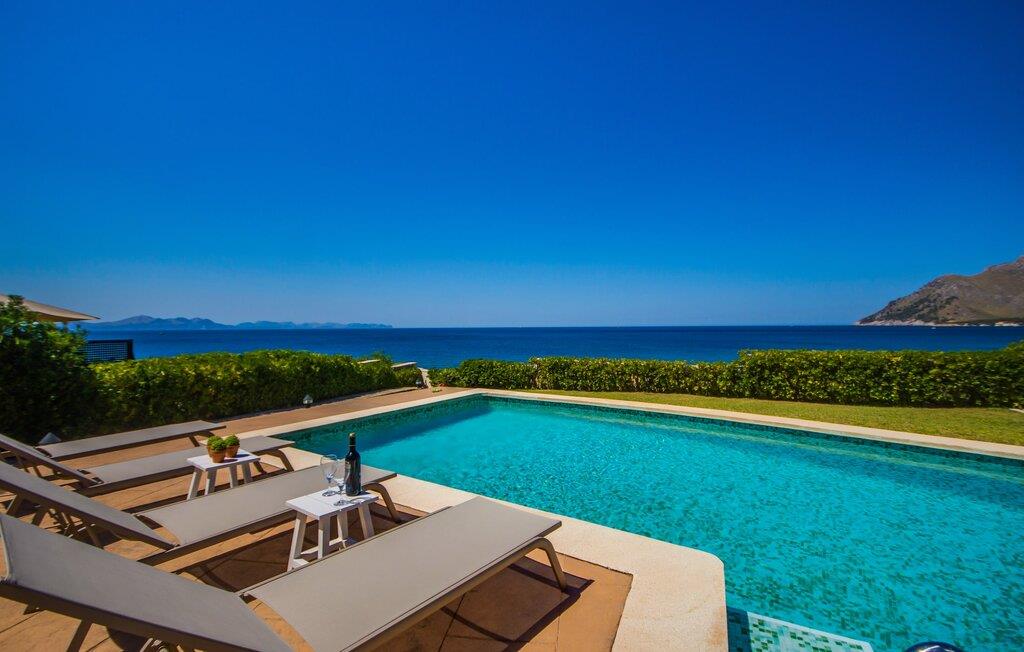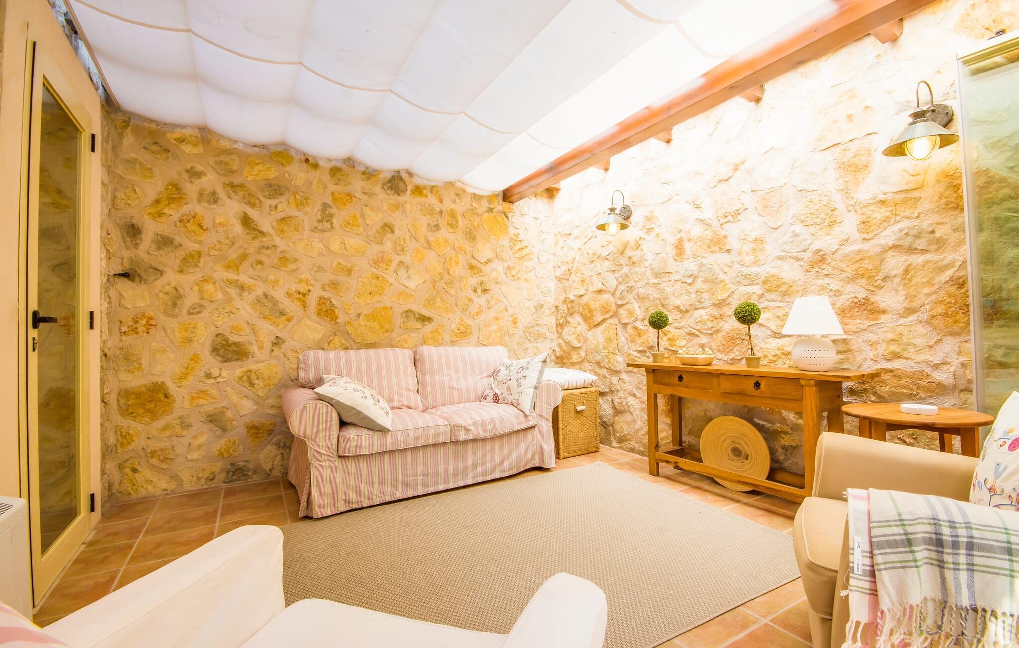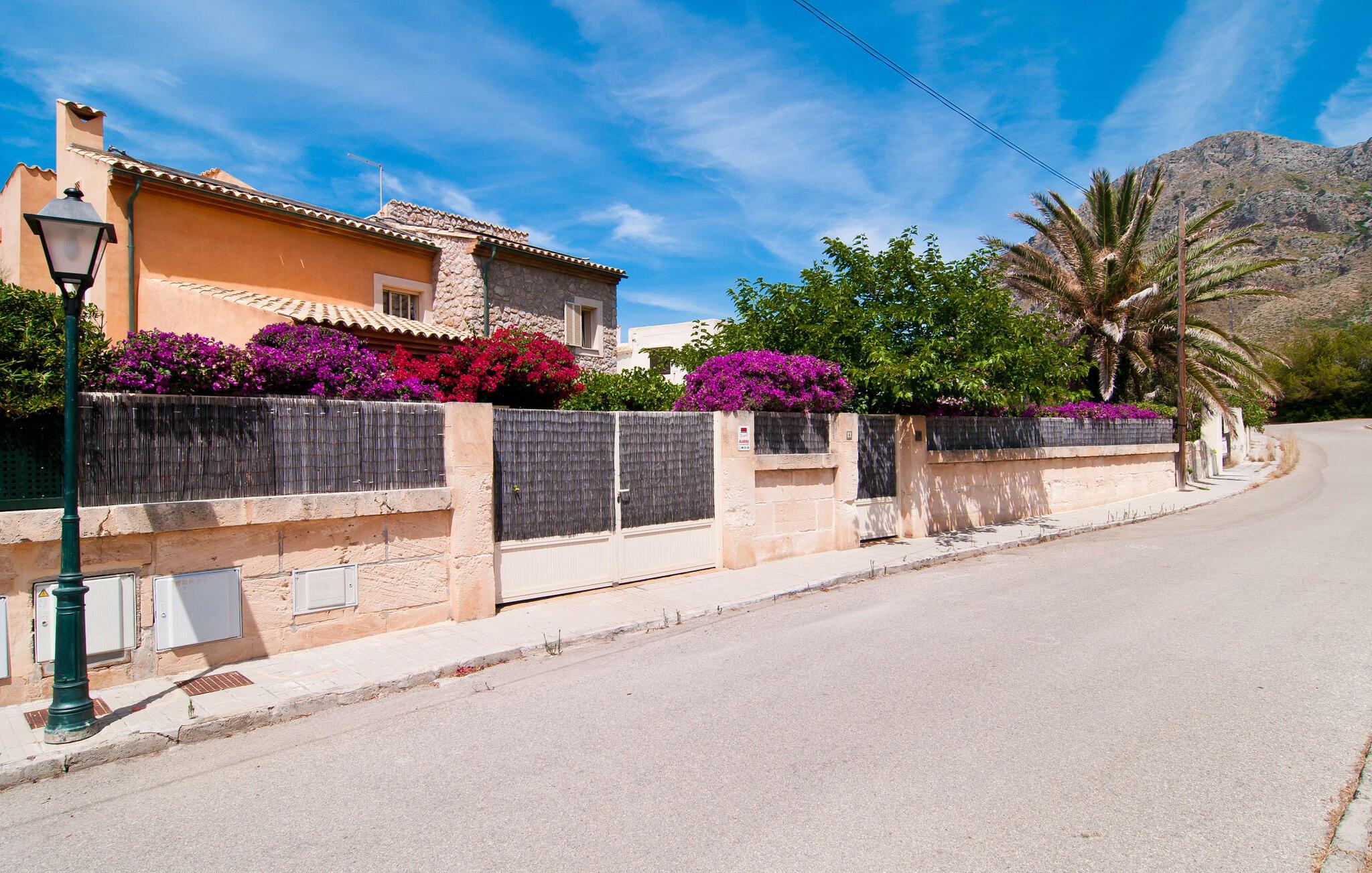 Denne utrolig sjarmerende villaen med en rustikk fasade i naturstein og lyse skodder ligger rett ved vannkanten i utkanten av Betlem. Huset har flere solterrasser og balkonger med fenomenalt vakker utsikt over Alcúdia-bukten. Og på den andre siden er det en nesten like vakker utsikt over de ruvende fjellene i nærheten. Det attraktive hageområdet med bassenget rett foran vil helt sikkert være stedet der du kommer til å tilbringe mesteparten av ferien din. Fra huset ser man først terrassen, og deretter det 10 meter lange svømmebassenget (ved siden av et lite tredekke) med en gressplen bak. Utesalongen ved siden av huset er et flott sted å sitte og slappe av når som helst på dagen, kanskje med en god drink eller noe å lese.