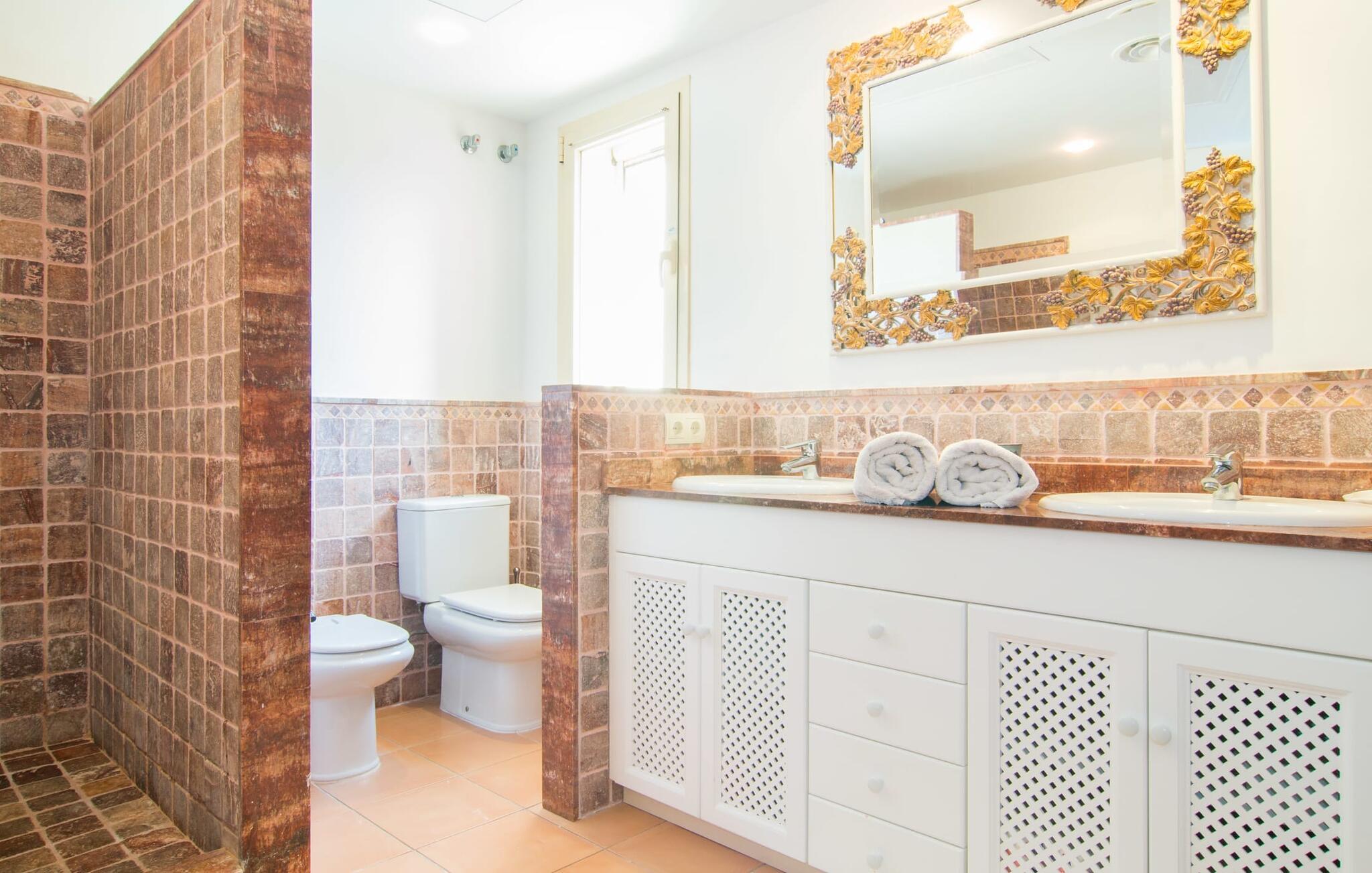Sett deg godt til rette i en av de koselige lenestolene og nyt utsikten, eller slå deg ned ved det store spisebordet noen meter unna og nyt et godt måltid sammen med alle som er der inne. TV-en tilbyr programmer på engelsk, spansk og tysk. Herfra har du direkte utgang til den overbygde terrassen med utsikt over bassenget og havet. Bare en benk skiller spisestuen fra det moderne kjøkkenet, som er pent utstyrt med alt du trenger i det daglige, inkludert vannkoker og kaffemaskin. Fra kjøkkenet har du også praktisk tilgang til det solromlignende uteområdet. Ovenpå er det ytterligere to soverom med eget bad. Alle soverommene er ganske romslige, møblert med møbler av høy kvalitet og stilfullt innredet. Håndplukkede dekorative elementer gir hvert av disse rommene sin egen varme, individuelle karakter, slik at du kan nyte en dyp og avslappende søvn i dette utrolig behagelige miljøet. Den smakfulle designen i resten av huset kommer også til sin rett på badene. De har moderne design, er komfortabelt romslige og har naturlig lys.