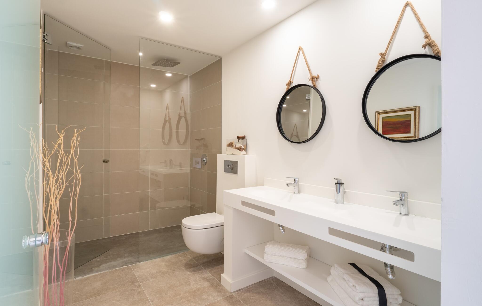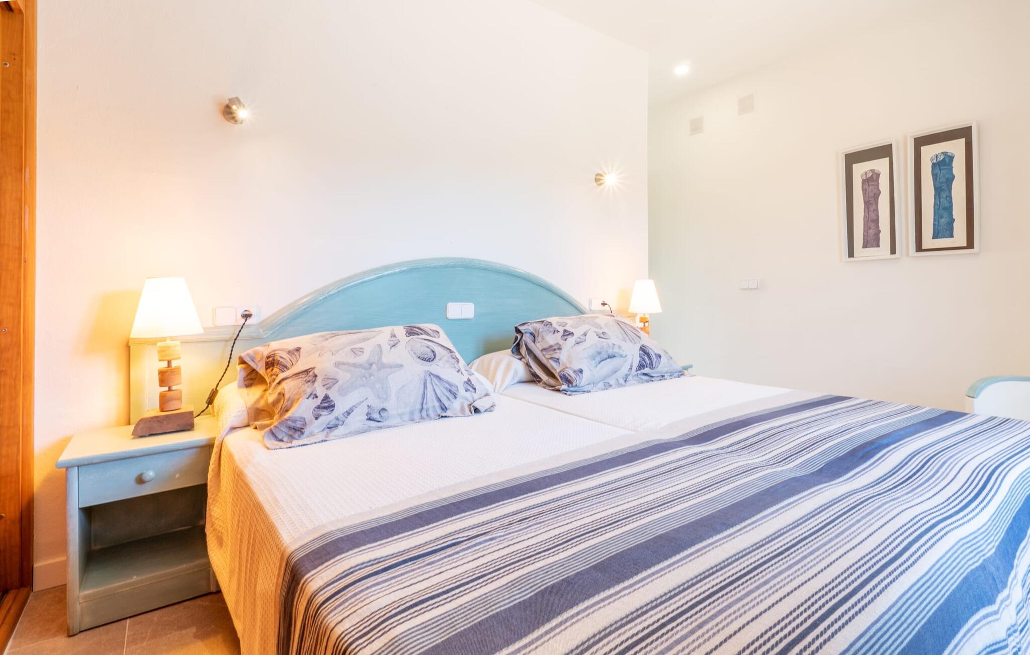 Interiøret i gårdshuset har en herlig maritim stil. Fargene og innredningen sender et umiskjennelig budskap: Her er du nær sjøen. Så selv om du ikke har en dag på stranden, vil du alltid ha havbrisen med deg. I første etasje er det en romslig stue/spisestue og et fullt utstyrt kjøkken med plass til enda et spisebord foran det store vinduet som går fra gulv til tak. Tre av de fire soverommene og tre bad, hvorav to har eget bad, ligger også på dette nivået. Soverommene og badene har en moderne, men tidløs stil som kjennetegnes av klare former, harmoniske farger og lyshet. Spesielt originalt er den fjerde soveplassen i første etasje med to enkeltsenger, som er plassert på et slags åpent galleri og sikkert vil være spesielt populær blant de yngre feriegjestene. Vi gir denne ferieboligen på Mallorca vår uforbeholdne anbefaling!