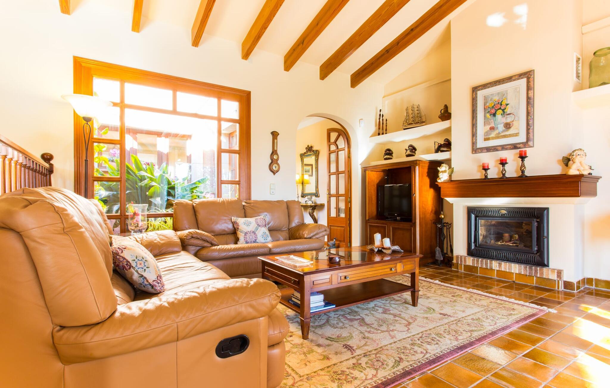 Innvendig er villaen smakfullt innredet og har en kombinert stue/spisestue med et stort bord, en koselig sofagruppe med TV og peis, samt gulv-til-tak-vinduer som gir naturlig lys. Det velutstyrte kjøkkenet har brødrister, blender og kaffemaskin. I første etasje er det innbydende soverom og moderne bad, mens øverste etasje har en ekstra stue og et lite bibliotek. Fasiliteter som strykejern og hårføner sørger for ekstra komfort.