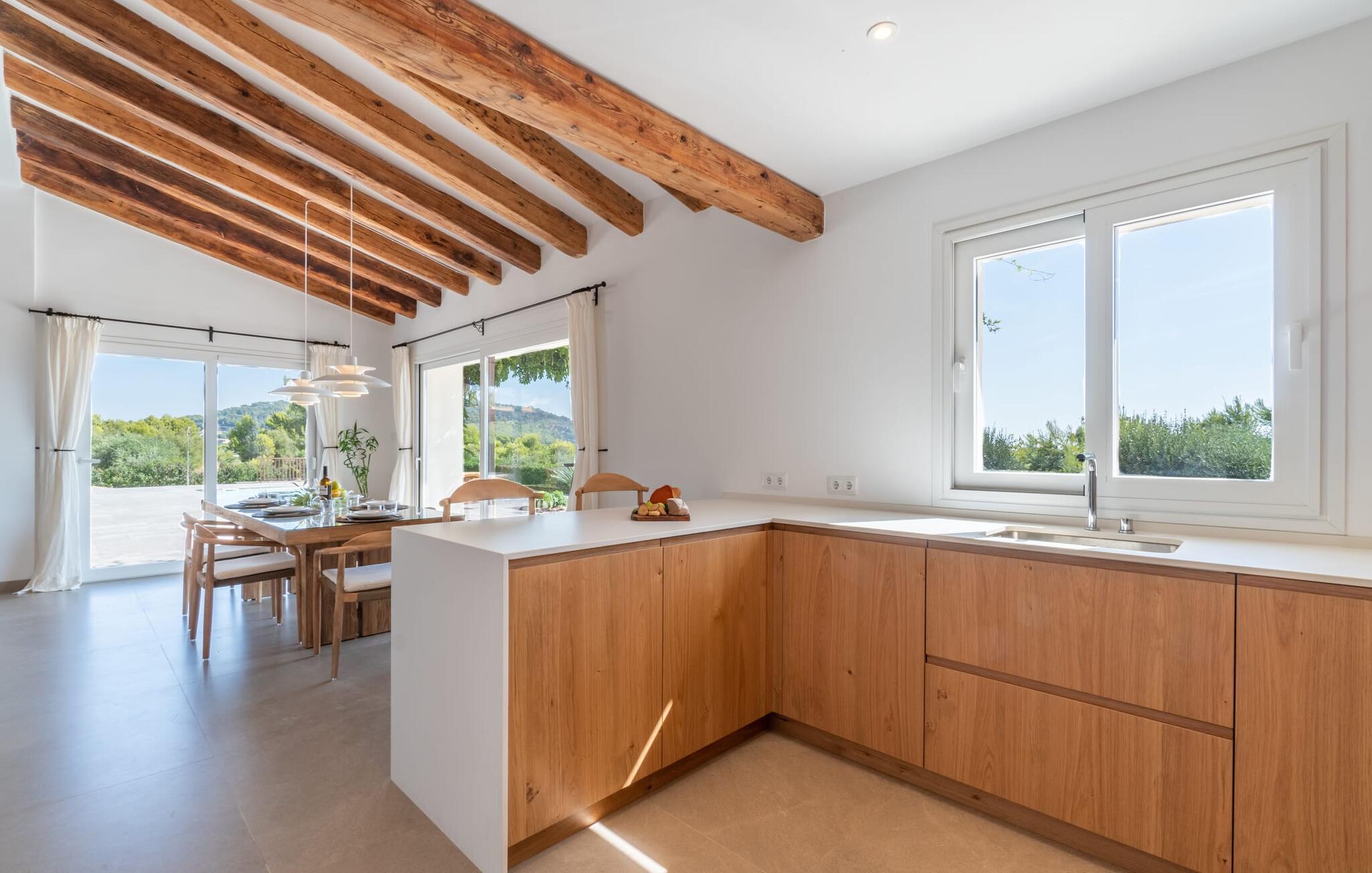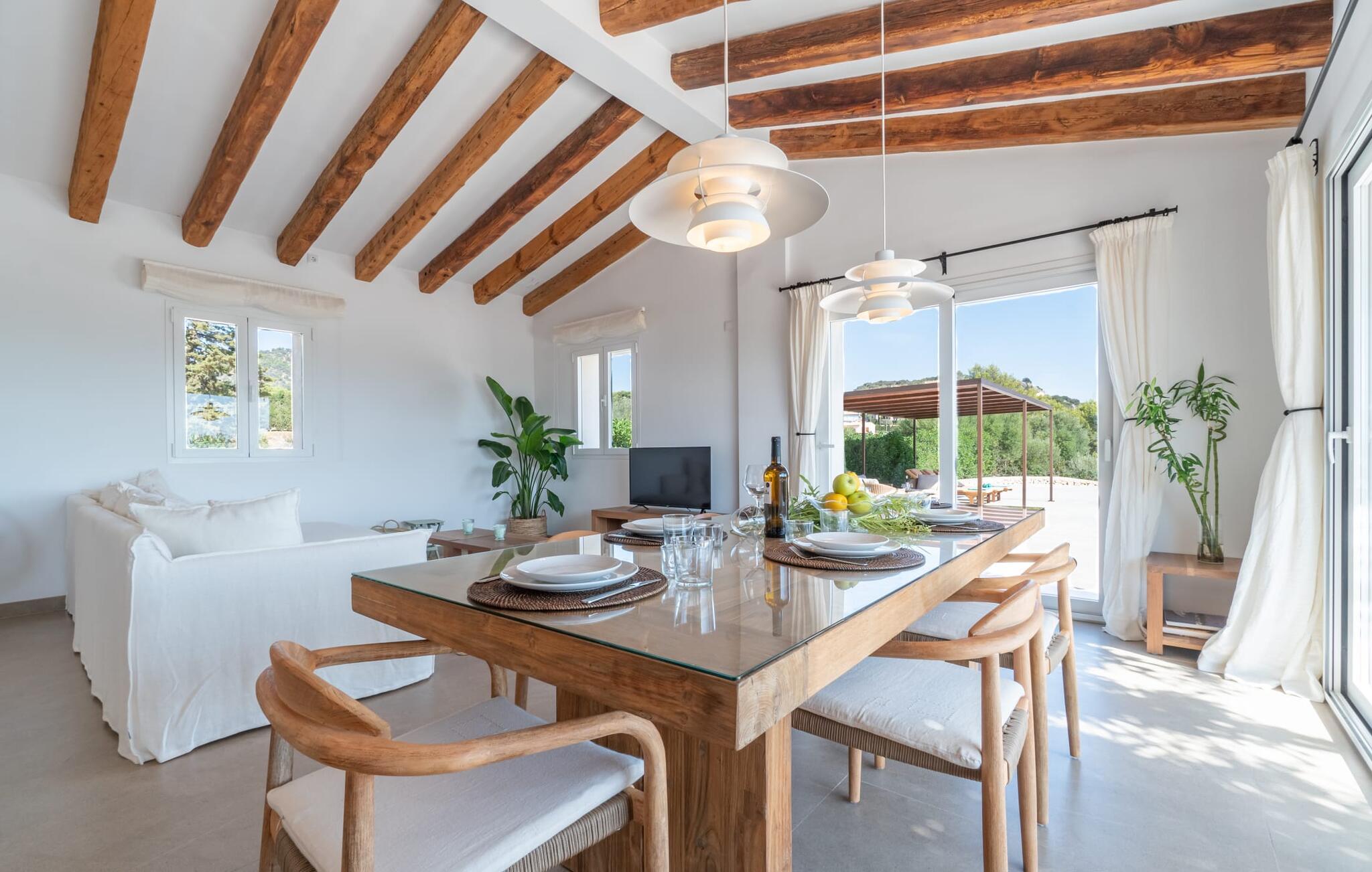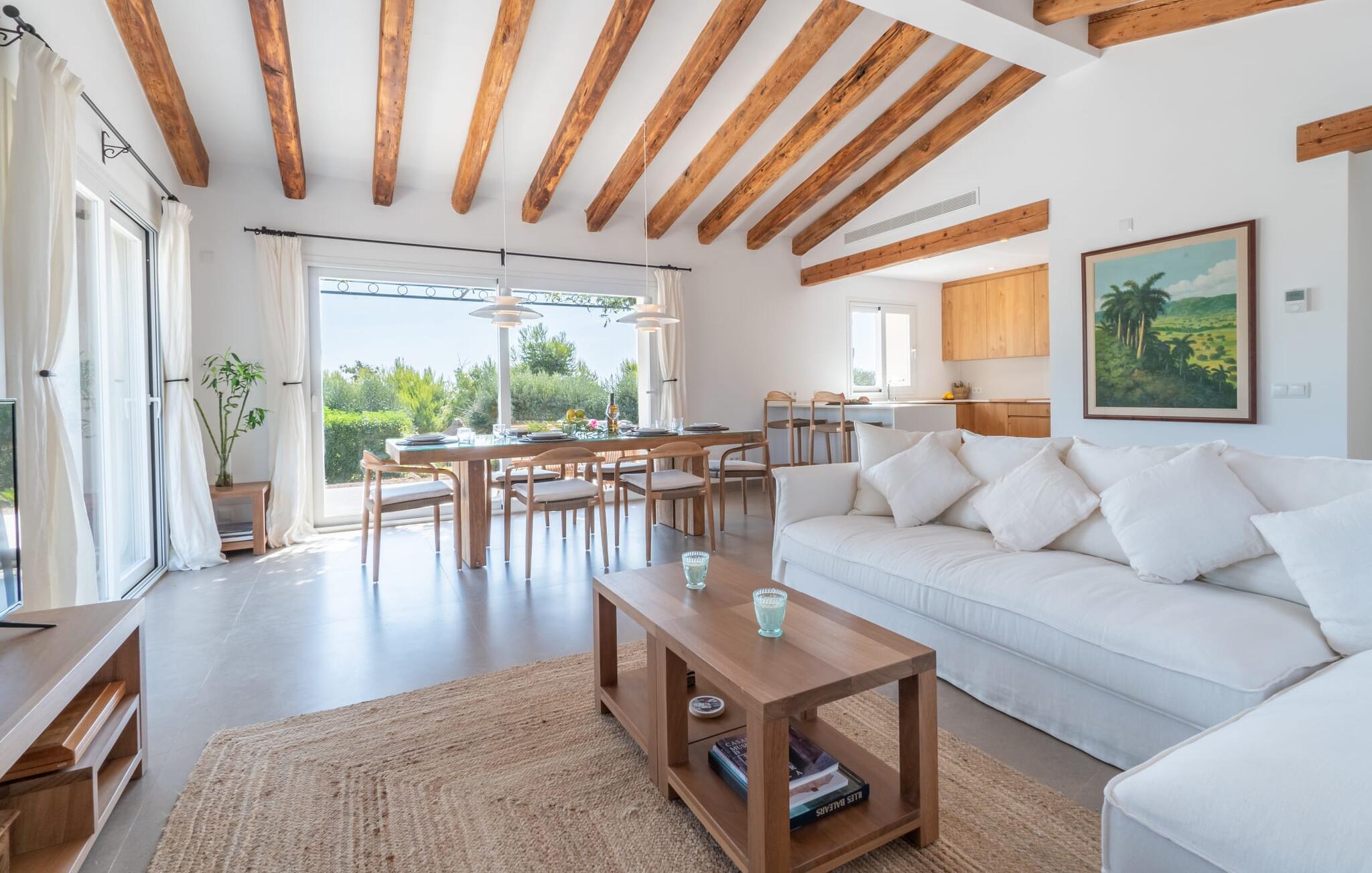 Brede skyvedører i glass slipper inn rikelig med naturlig lys i den åpne stue-/spisestuen, noe som skaper en harmonisk blanding av inne- og uterom. Den stilfulle designen med tremøbler av høy kvalitet og smakfulle, naturlige tekstiler skaper en varm og innbydende atmosfære.